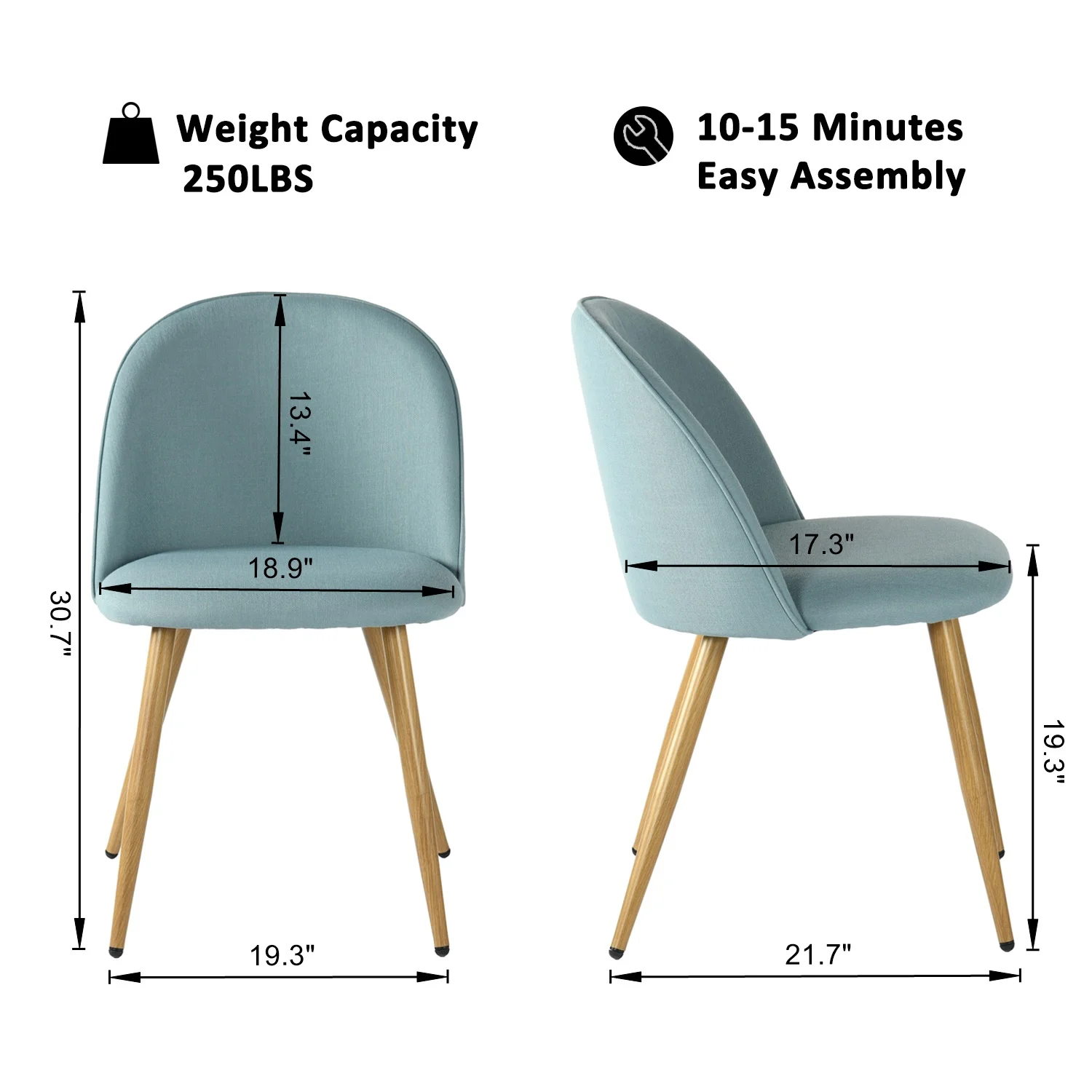 Homy Casa Fabric Upholstered Dining Chairs Set of 2 with Backrest Metal Legs for Kitchen, Power Blue