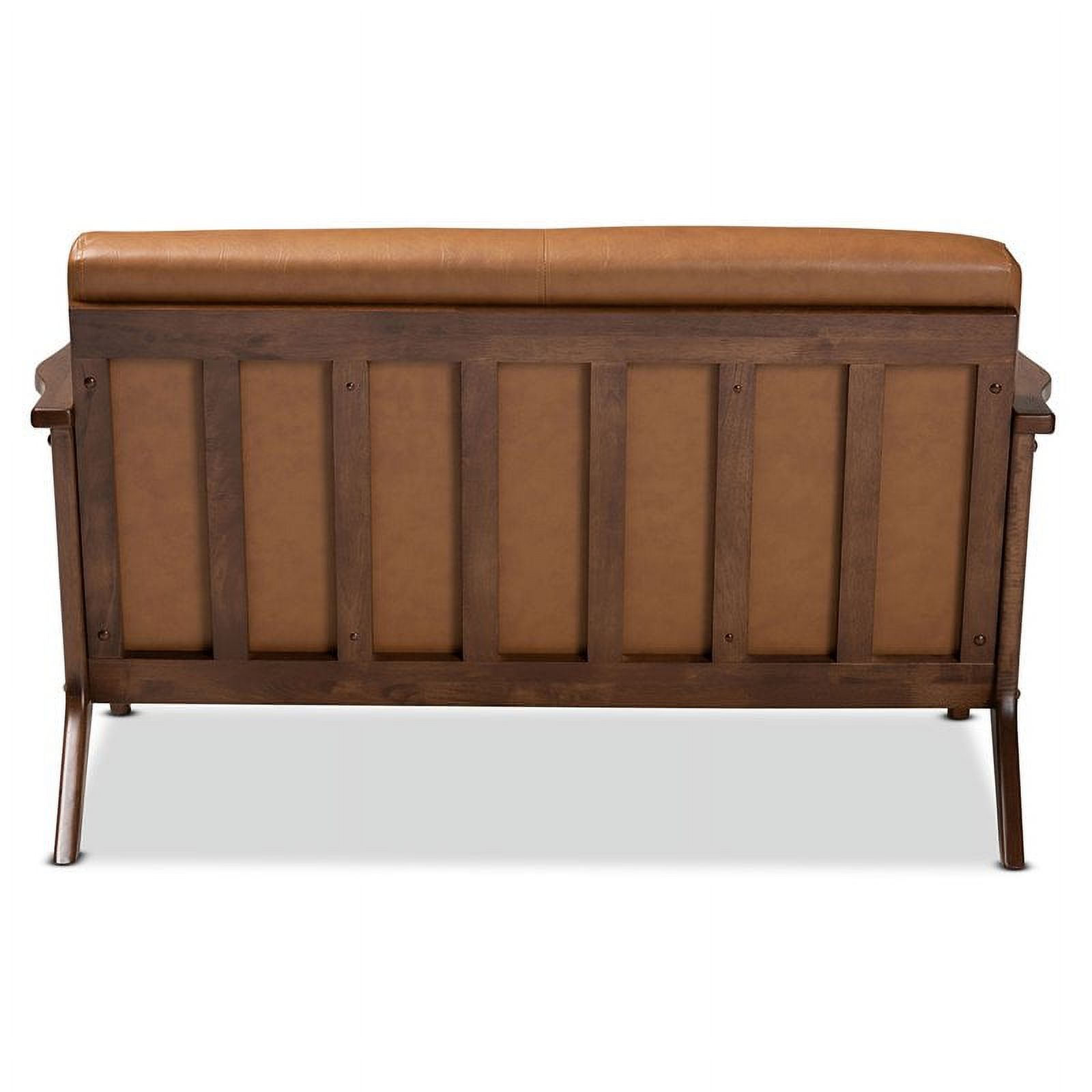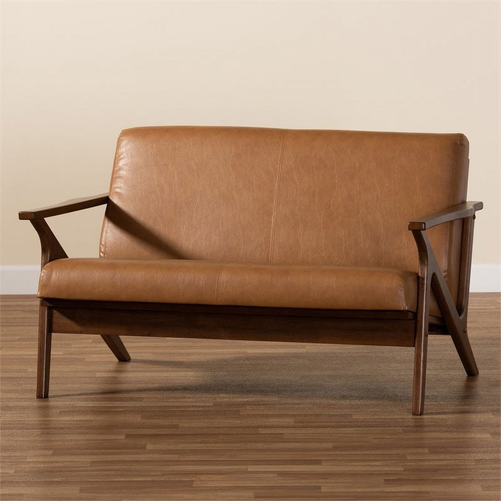 Bowery Hill 16.54" Mid-Century Wood/Faux Leather Loveseat in Walnut Brown/Tan