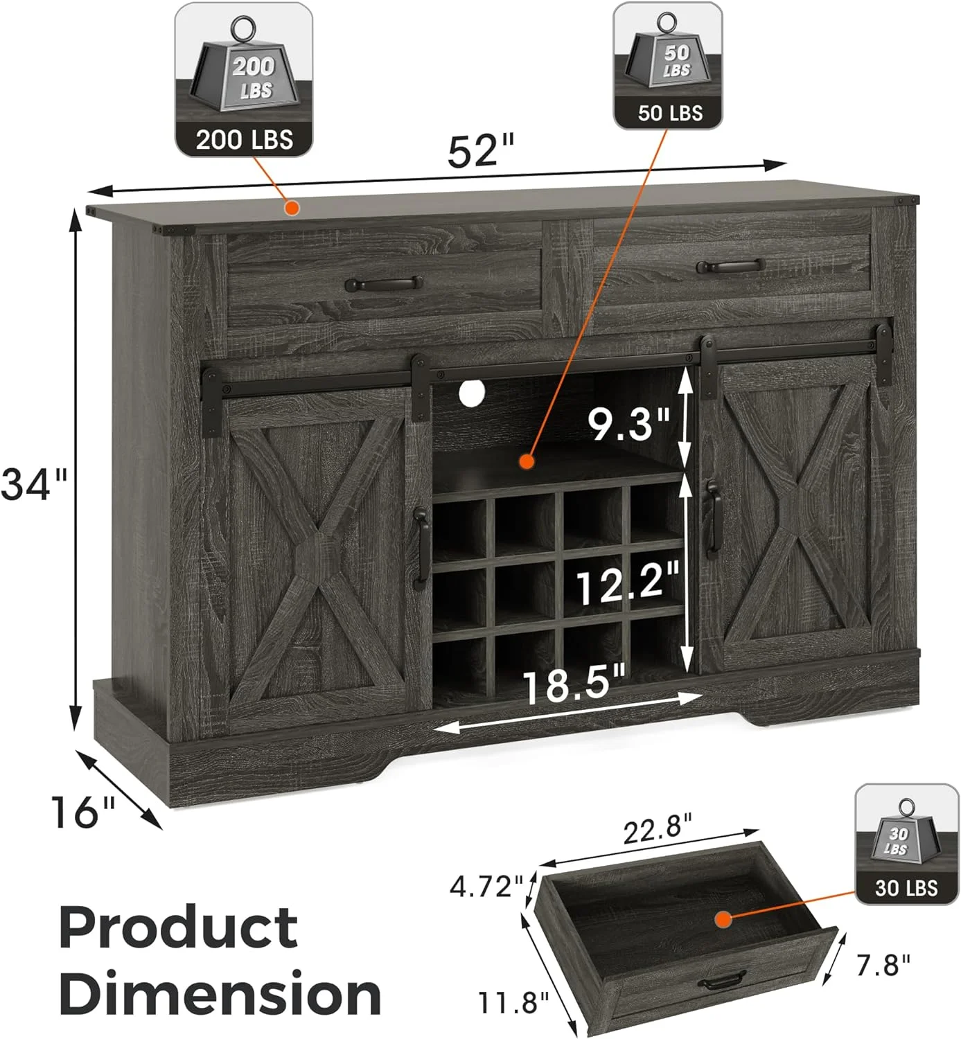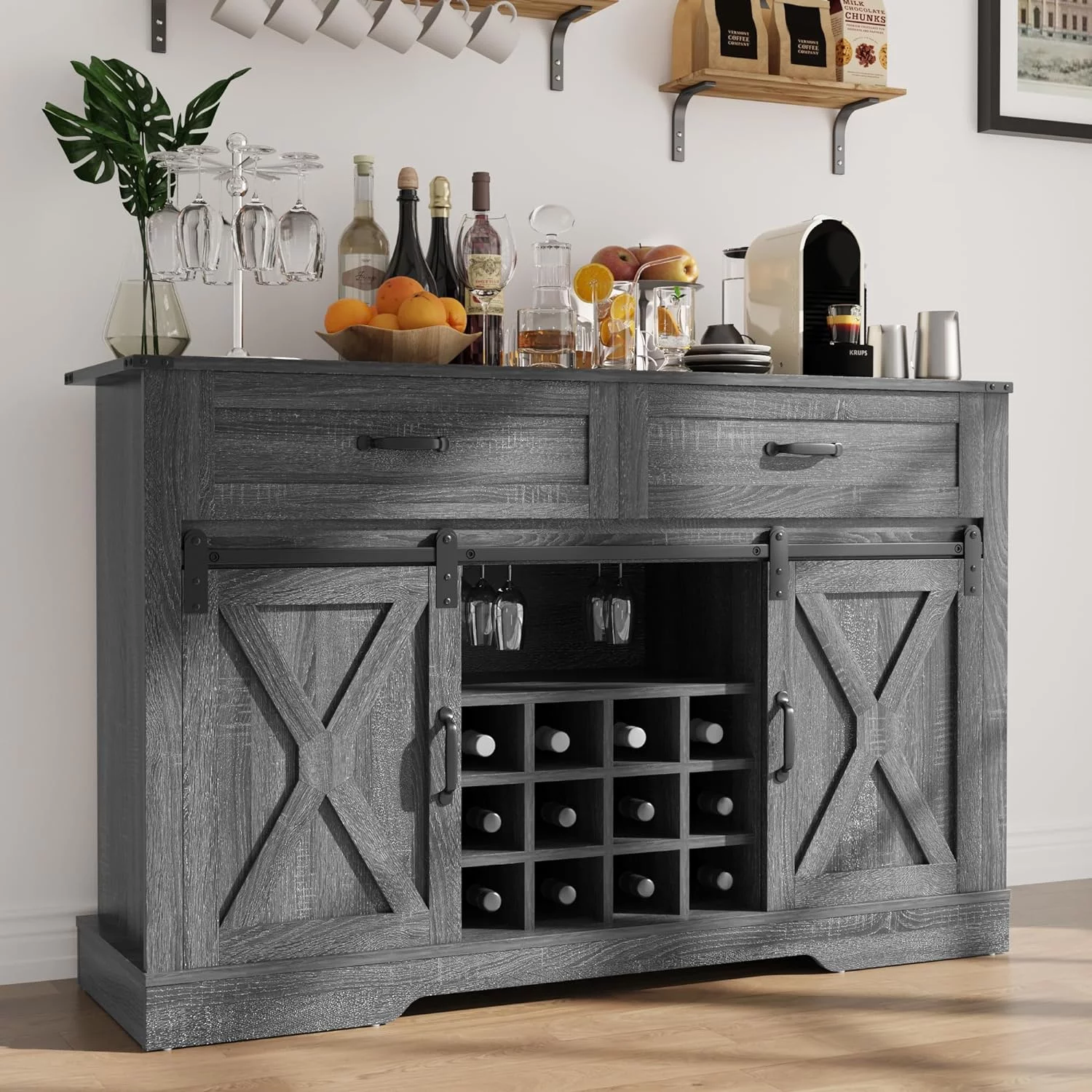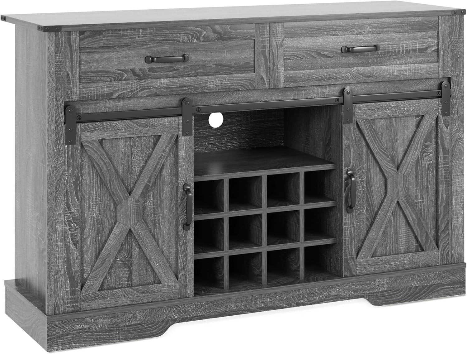 Superjoe 52" Buffet Storage Cabinet Farmhouse Sideboard w/12 Removable Wine Rack & Drawers, Rustic Coffee Bar Cabinet w/Glass Rack & Sliding Barn Door, Dark Grey - Curated Treasures Market