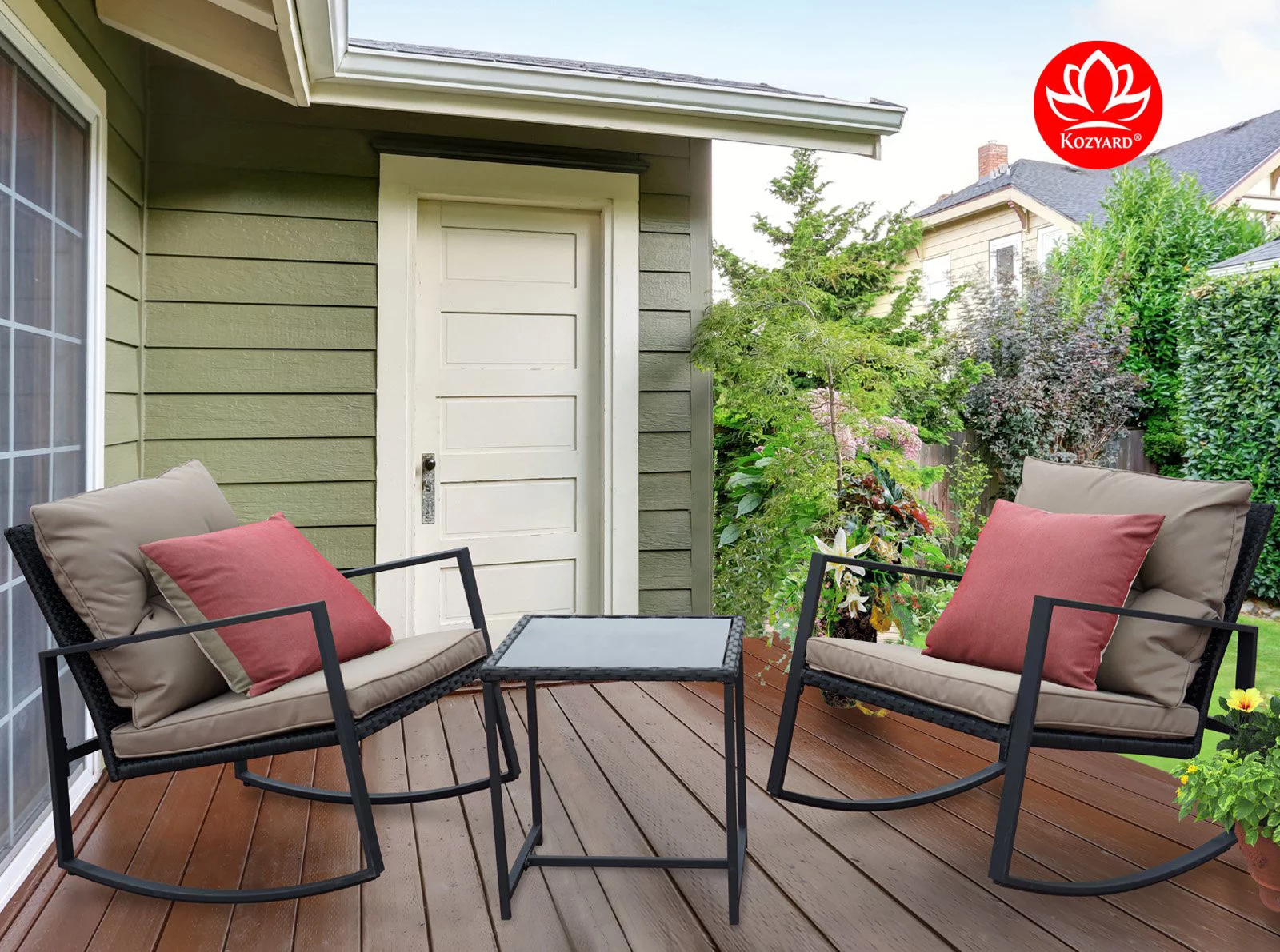 Moana Outdoor 3-Piece Rocking Wicker Bistro Set, Two Chairs and One Glass Coffee Table, Black Wicker Furniture (Taupe Cushion + Red Stripe Pillow) - Curated Treasures Market