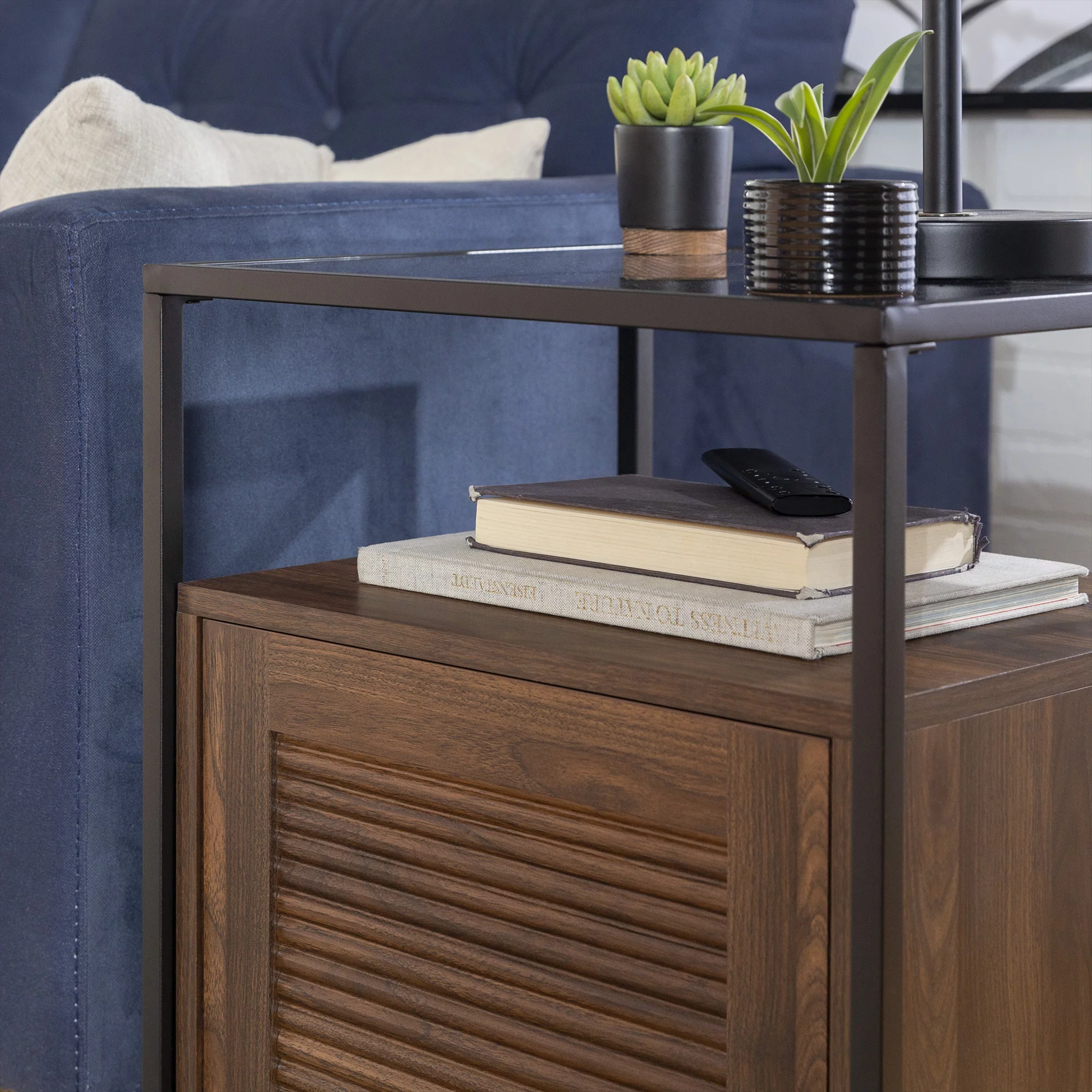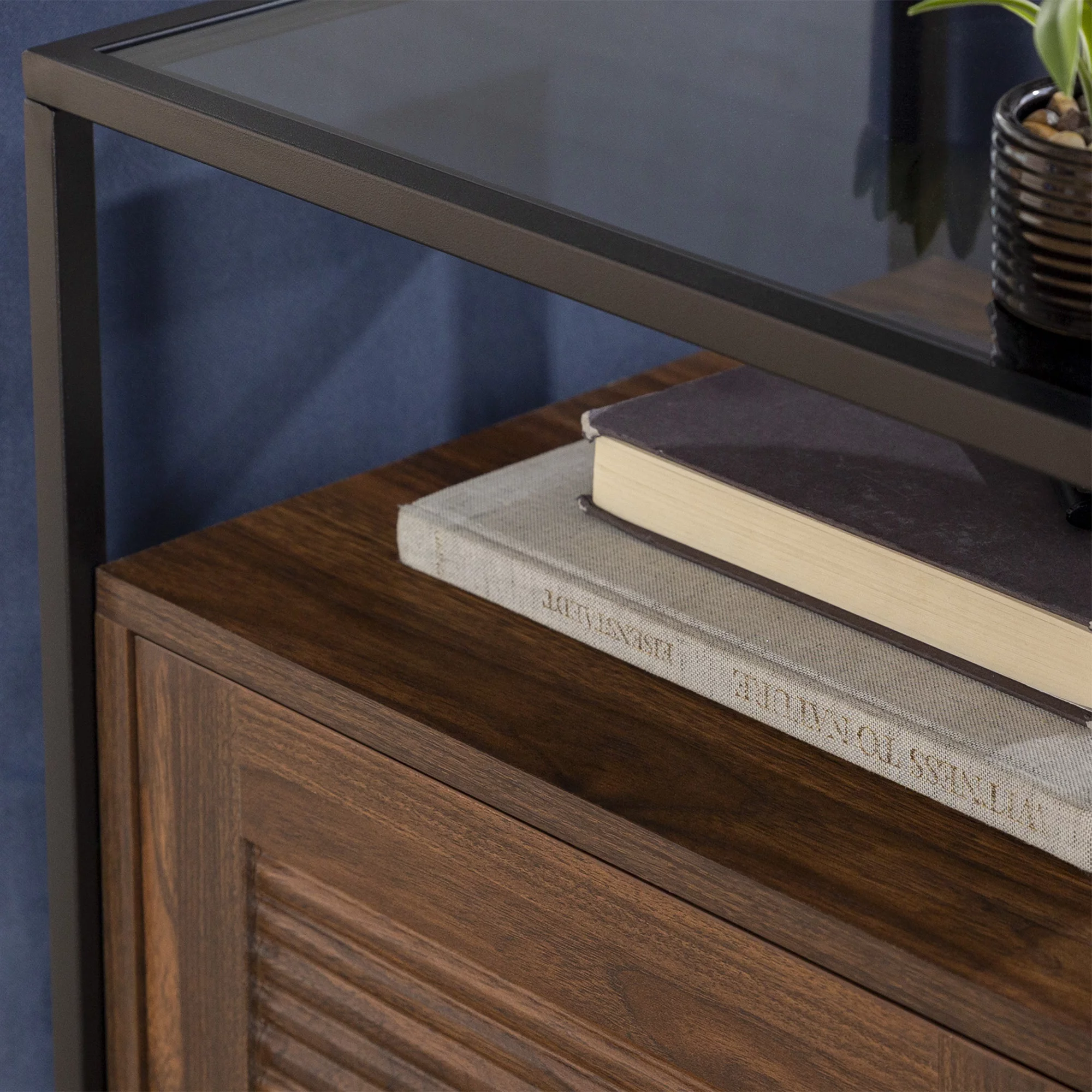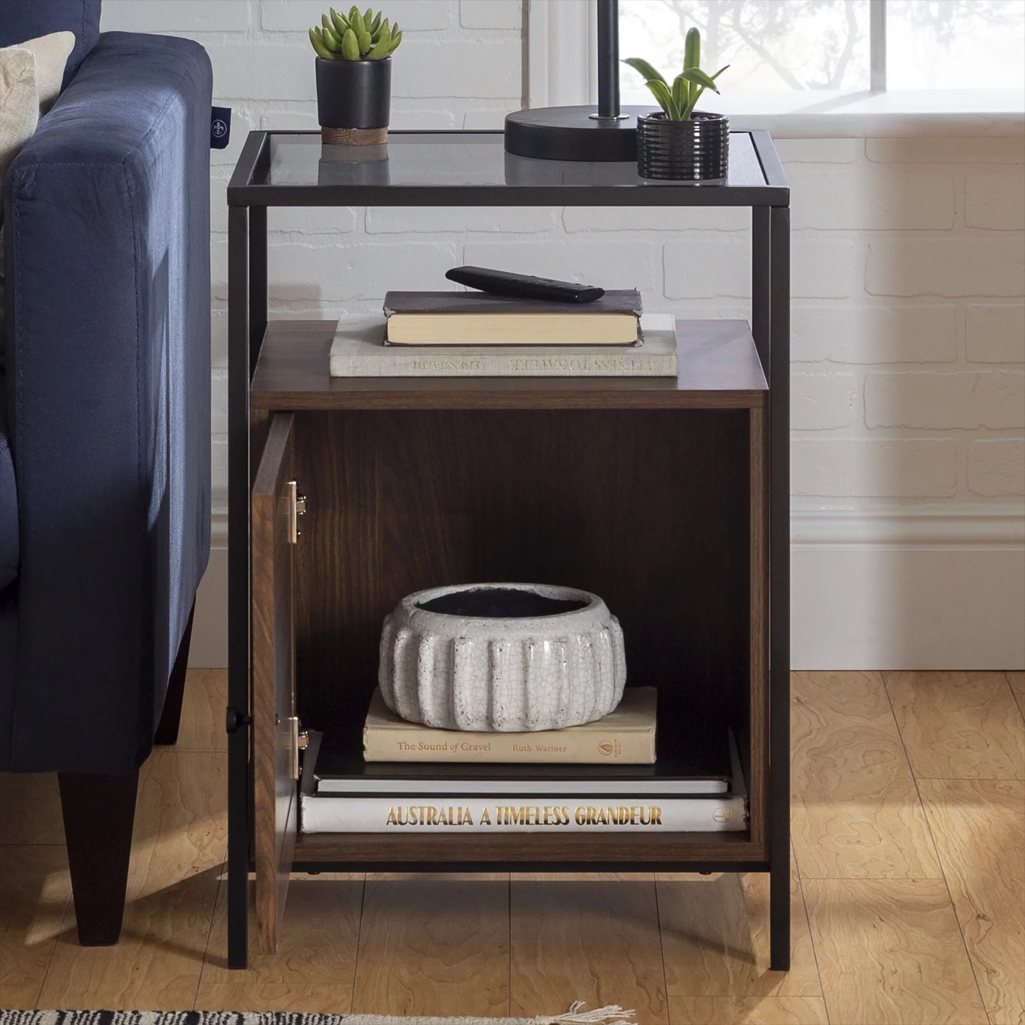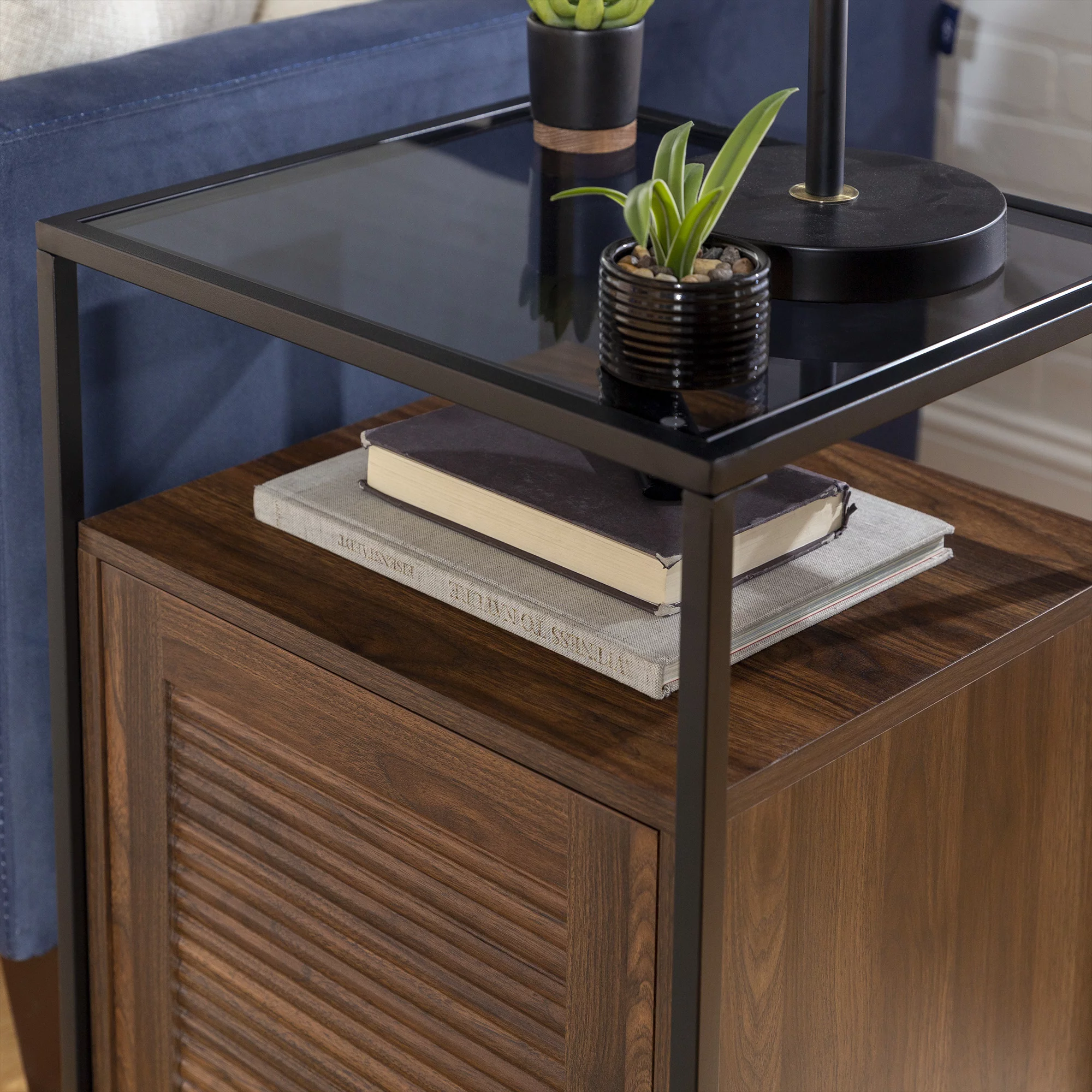 Burke Modern Glass Top Fluted Door Dark Walnut End Table by Manor Park - Curated Treasures Market