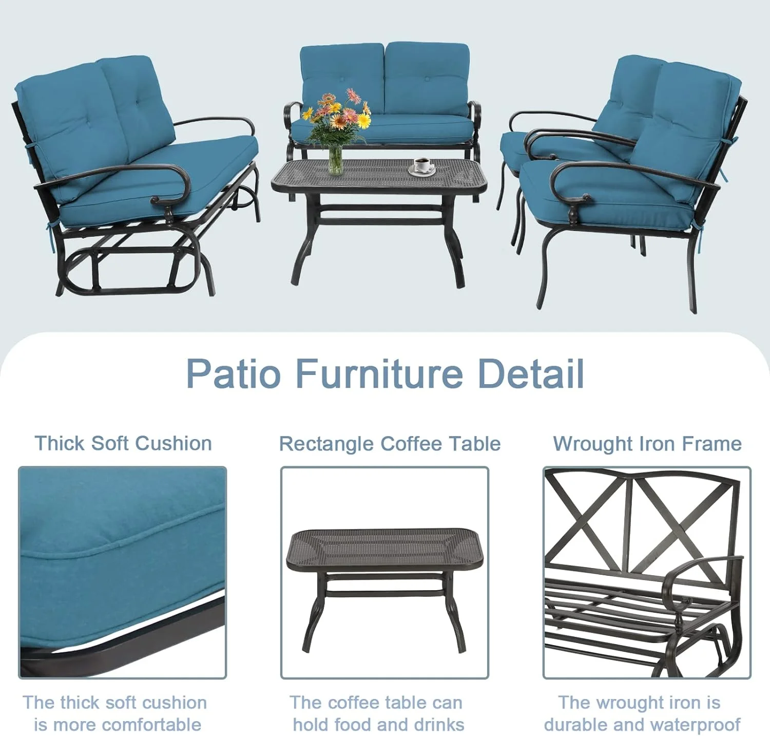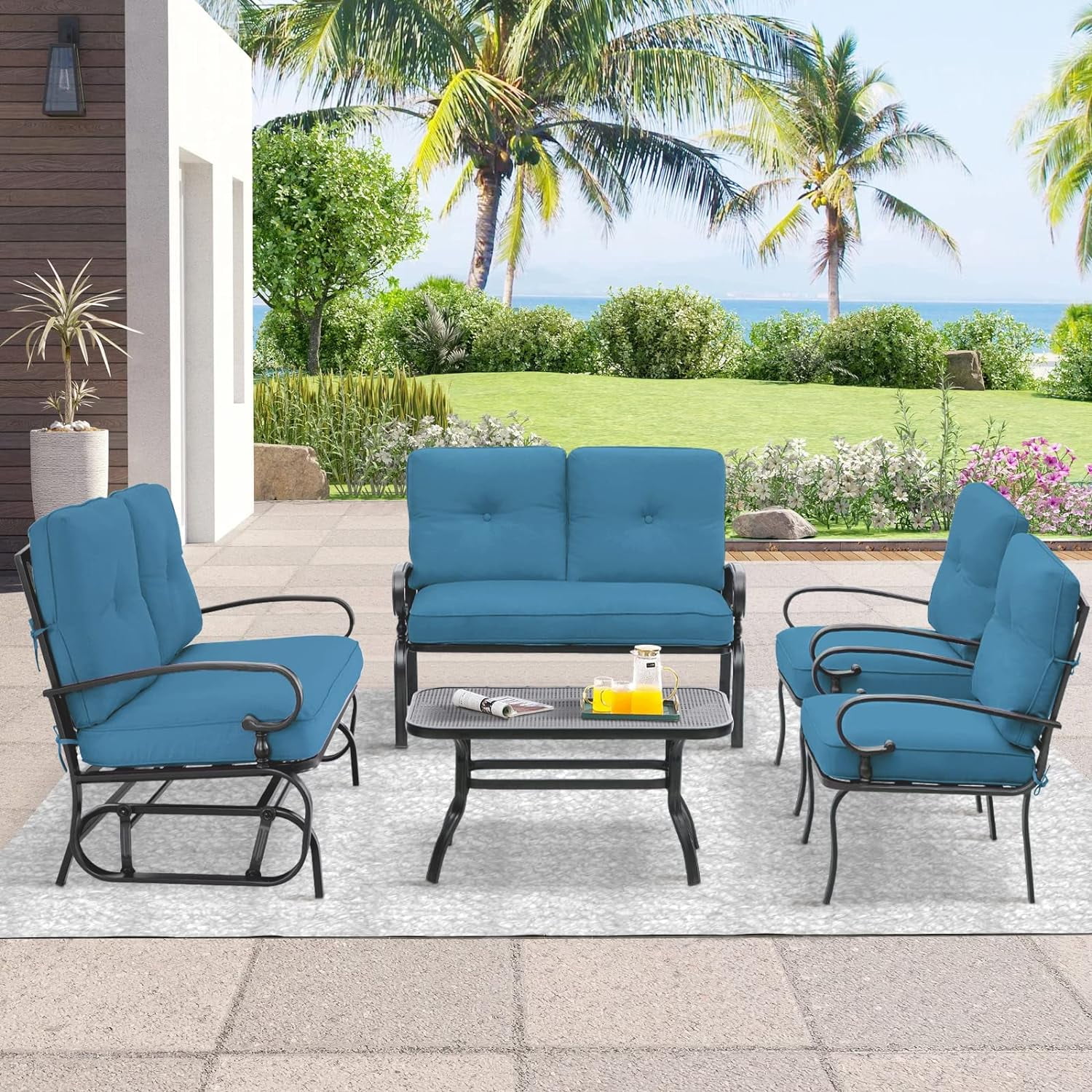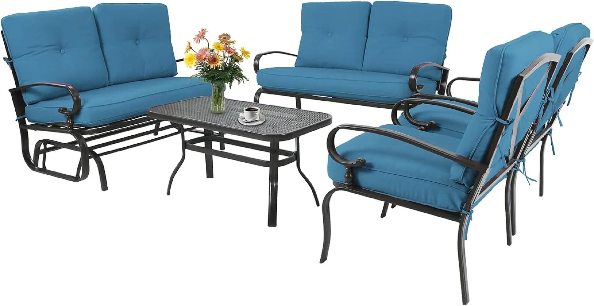 SOLAURA 5-Piece Outdoor Metal Furniture Set Patio Wrought Iron Conversation Set (Patio Swing Glider, 2 Patio Chairs, Loveseat with Coffee Table), Peacock Blue - Curated Treasures Market