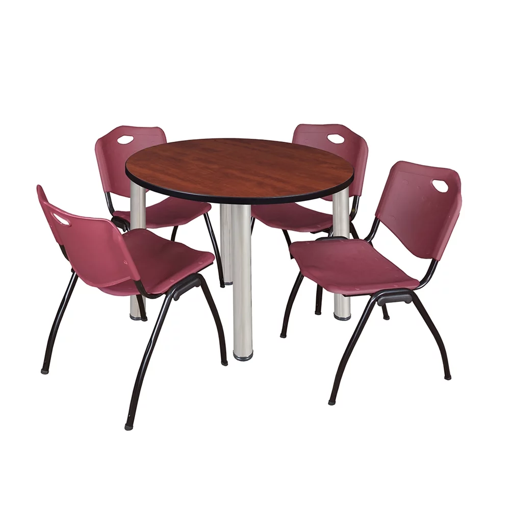 Belen Kox Kee 42" Round Breakroom Table- Cherry/ Chrome & 4 'M' Stack Chairs- Burgundy - Curated Treasures Market