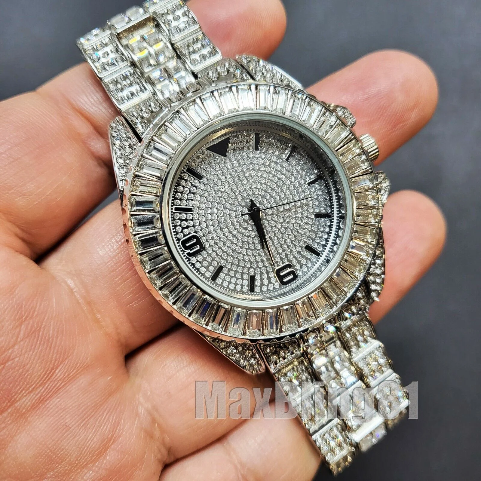 HIP HOP SILVER PT LUXURY METAL BLING WATCH & ICED BAGUETTE STONE BRACELET SET - Curated Treasures Market