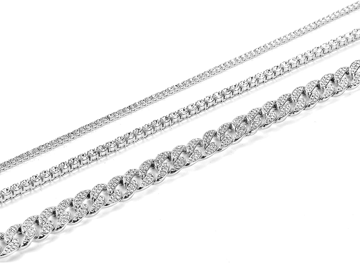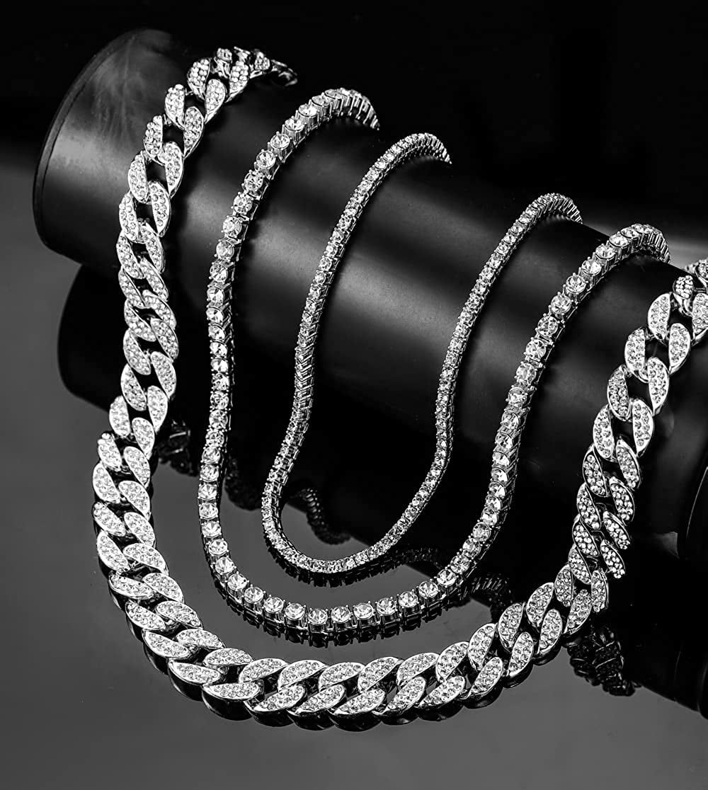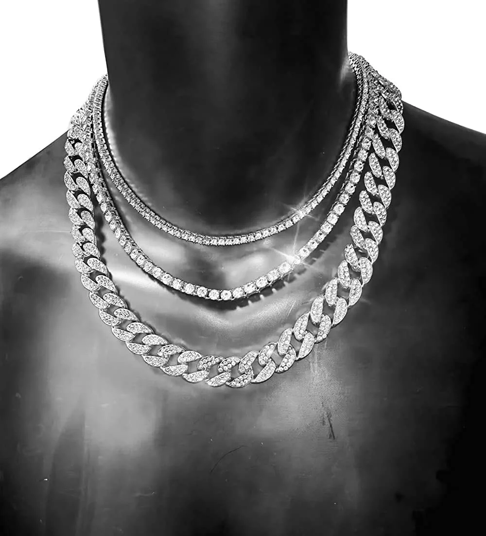 HH Bling Empire Gold Tennis and Cuban Link Chain for Men,Iced Out Mens Diamond Cuban Chain Necklace Sets,Hip Hop Rapper Jewelry Chains,3 Pcs 18/20/24 Inch (Set C-Silver) - Curated Treasures Market