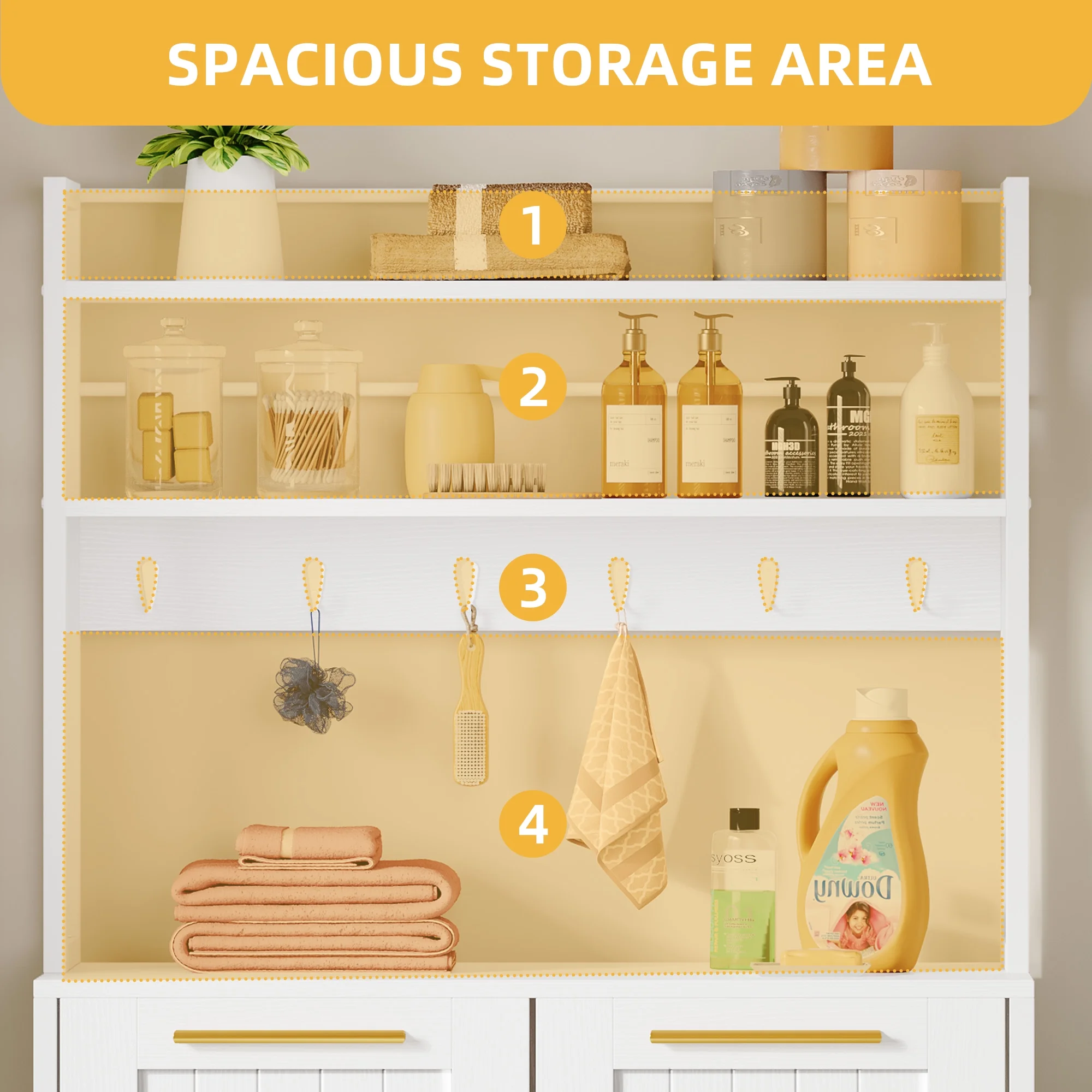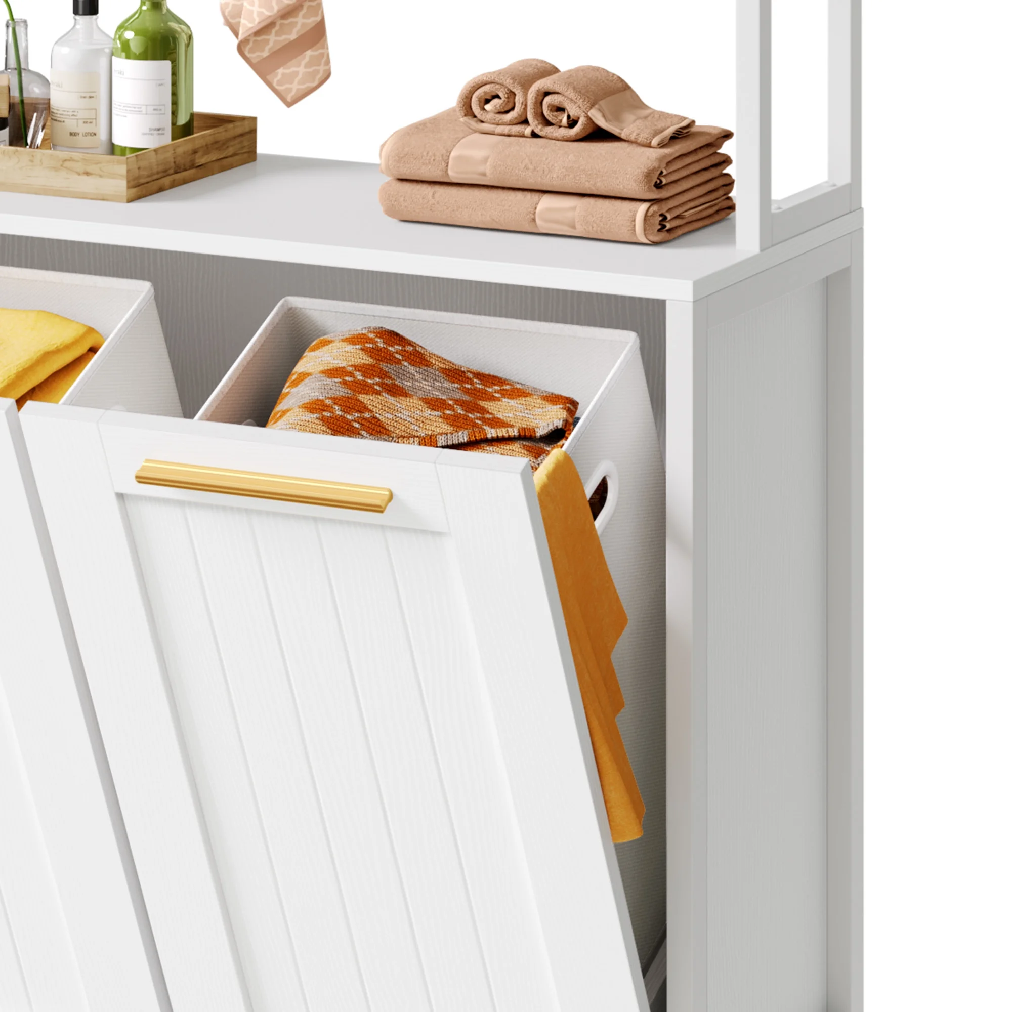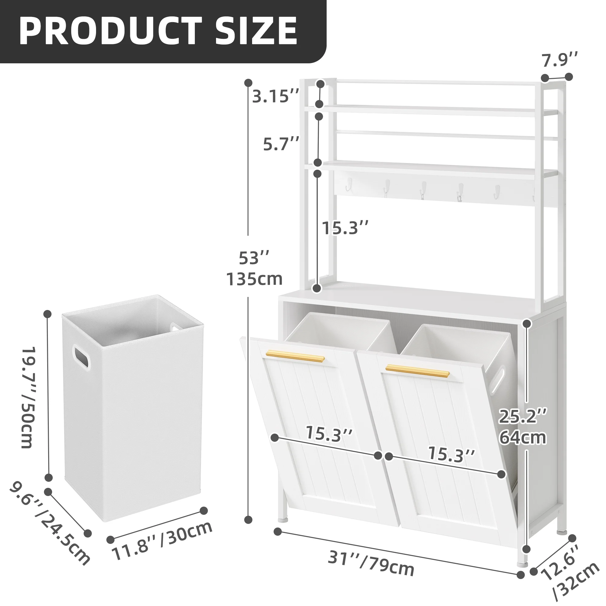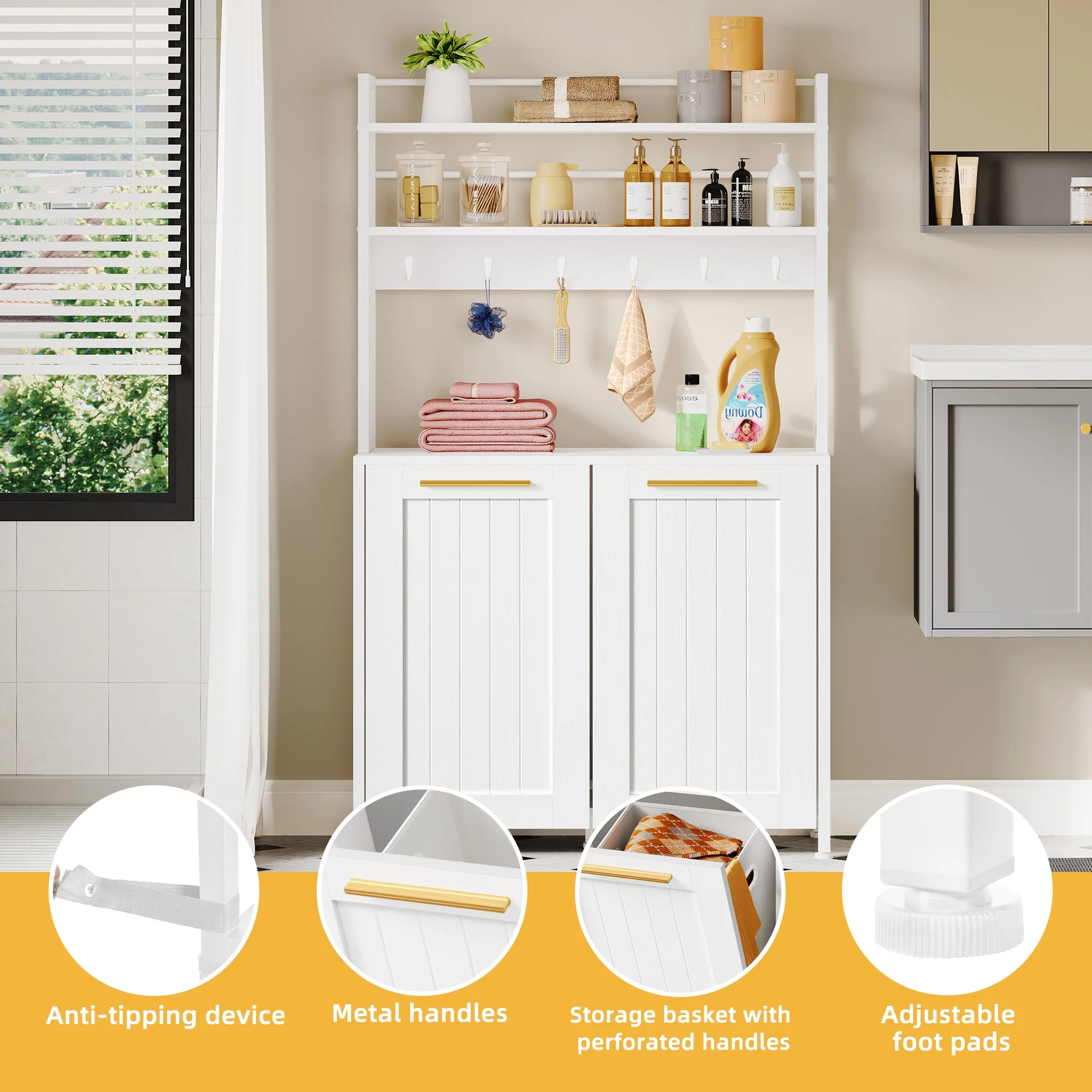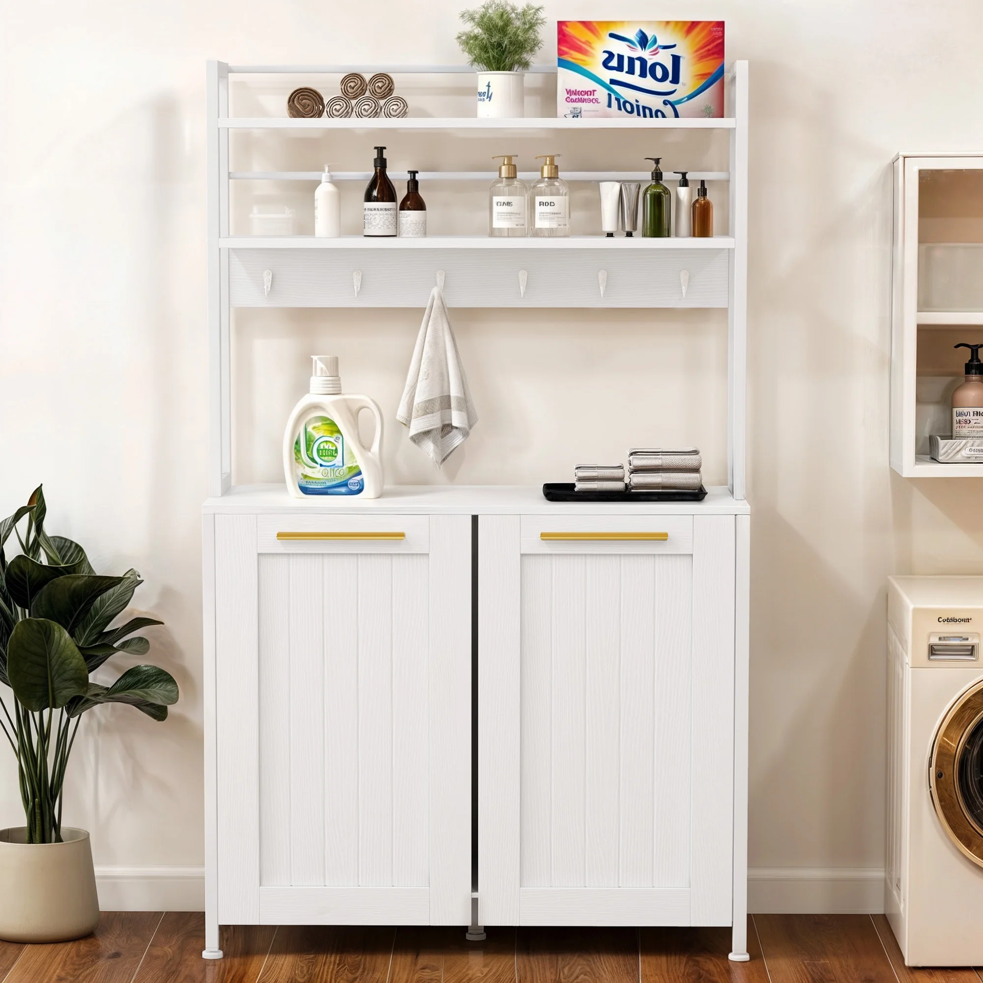 DWVO 53" Tilt Out Laundry Hamper Cabinet with 2 Baskets 6 hooks and 3 Storage Shelves, White - Curated Treasures Market