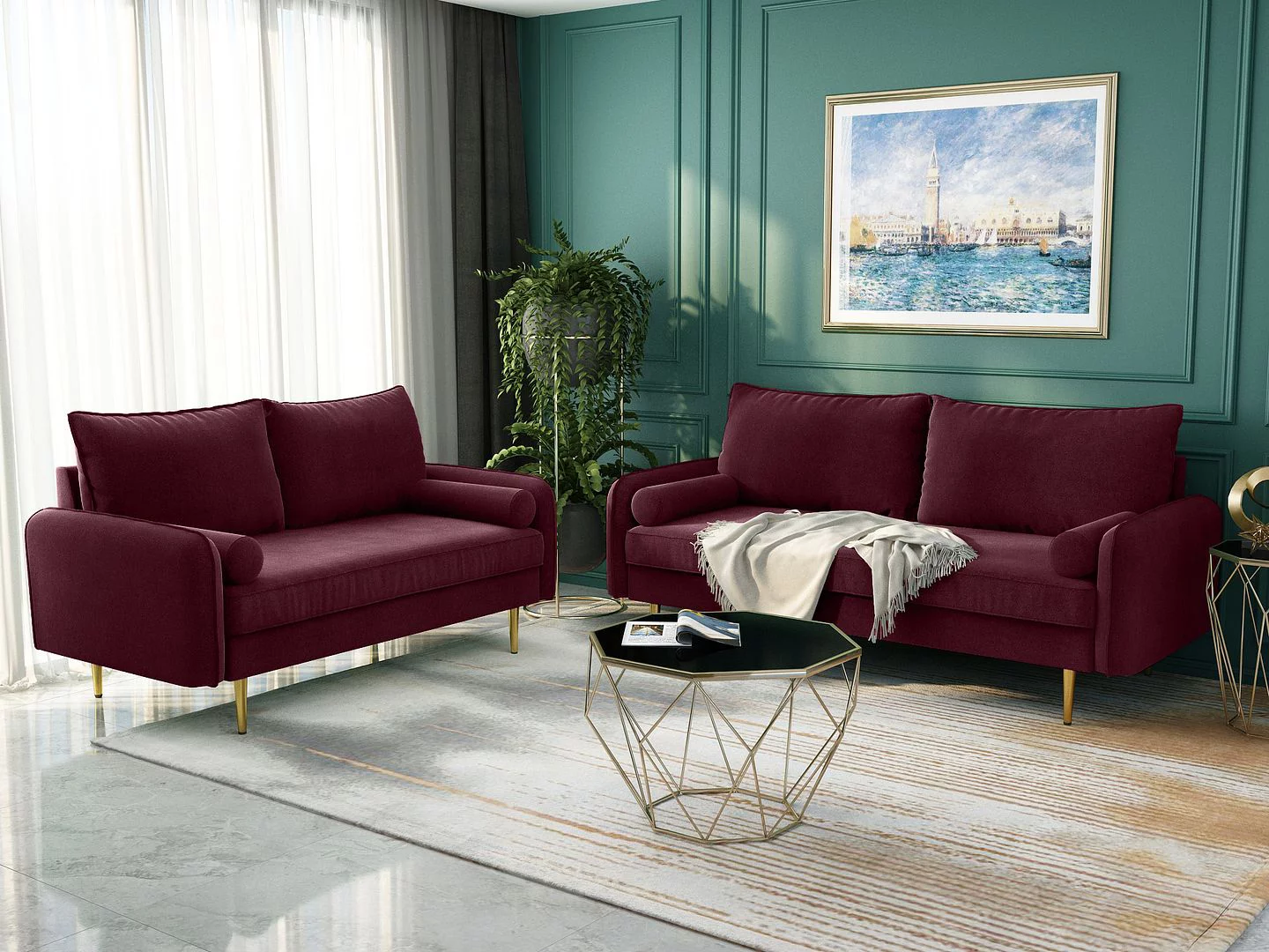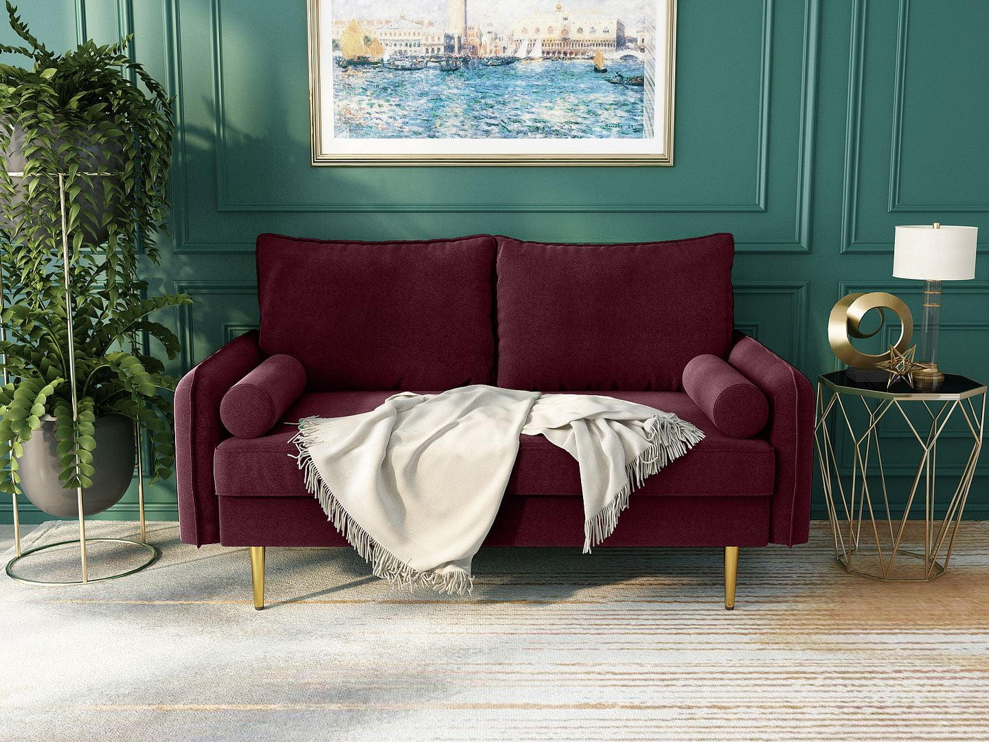 Koby Home's Collection Aspen Transitional Loveseat, Upholstered in Performance Velvet with Round Arms, Cushion Back, and Metal Legs, 2-Seater for Small Space, Burgundy Red Color - Curated Treasures Market