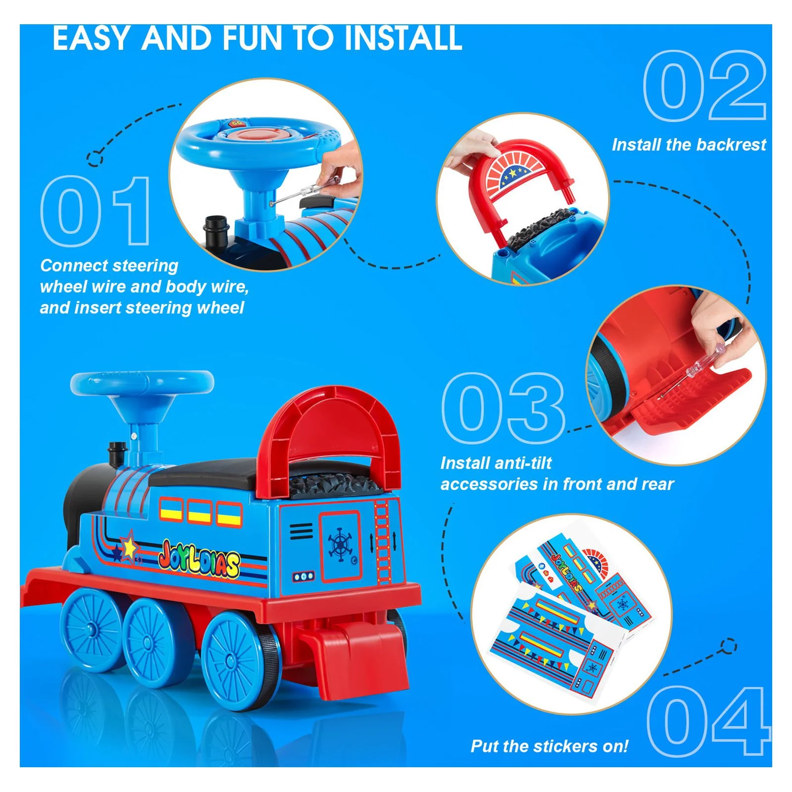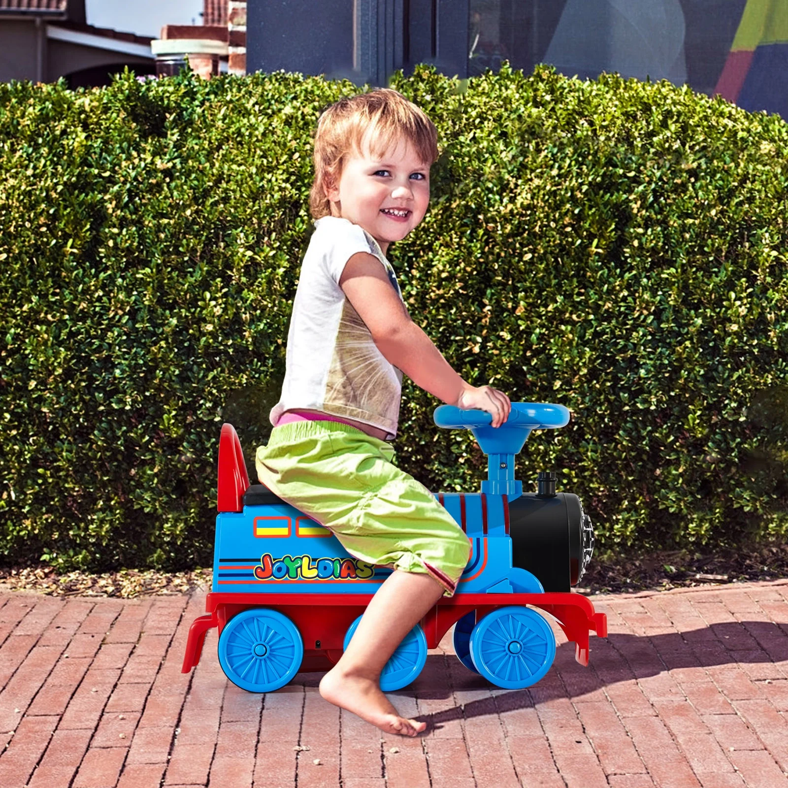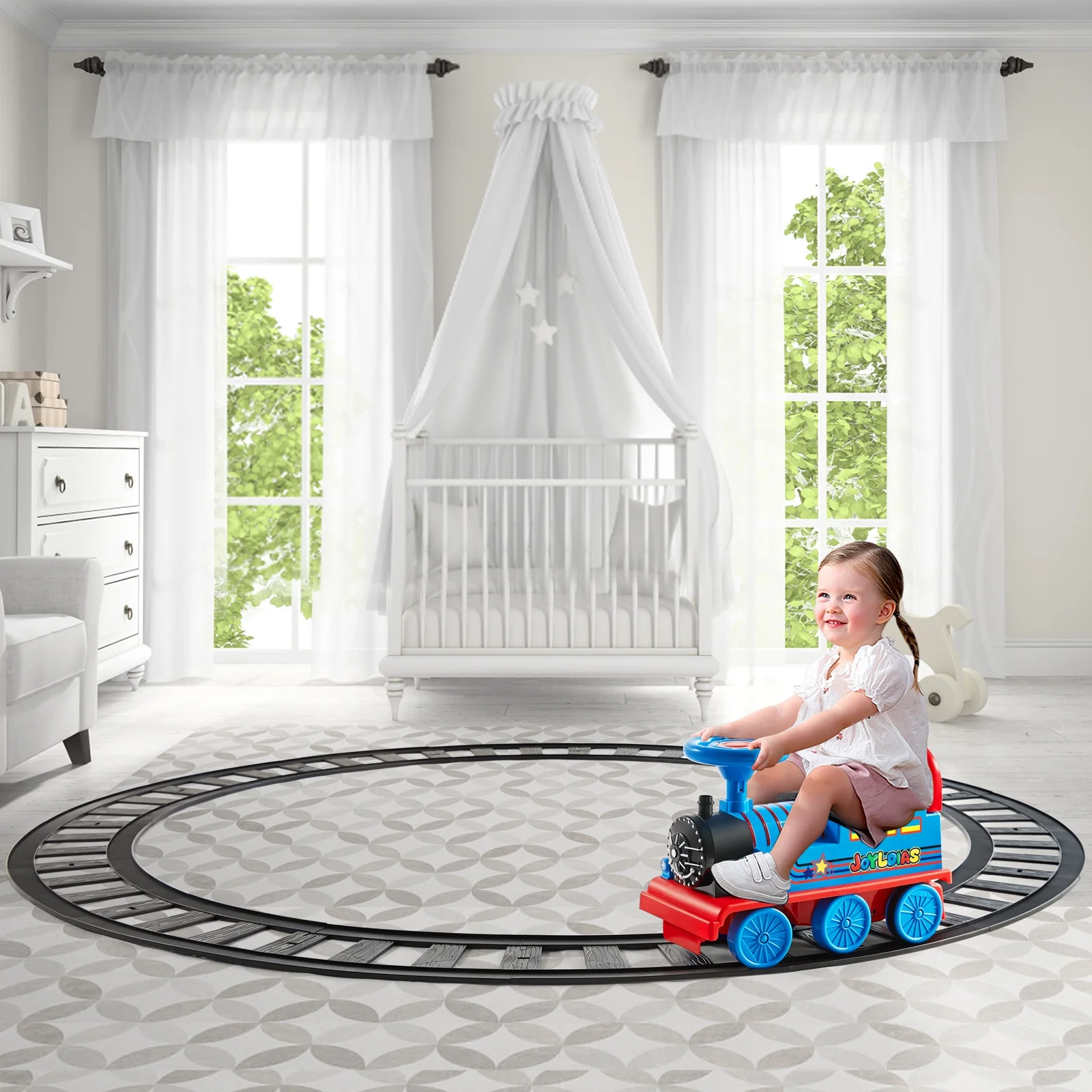 JOYLDIAS Blue 6V Kids Electric Ride on Train Toddlers Age 1-3 Boys Girls w/Curved Tracks,Carriage,Songs,Lights,Horns,Storage - Curated Treasures Market