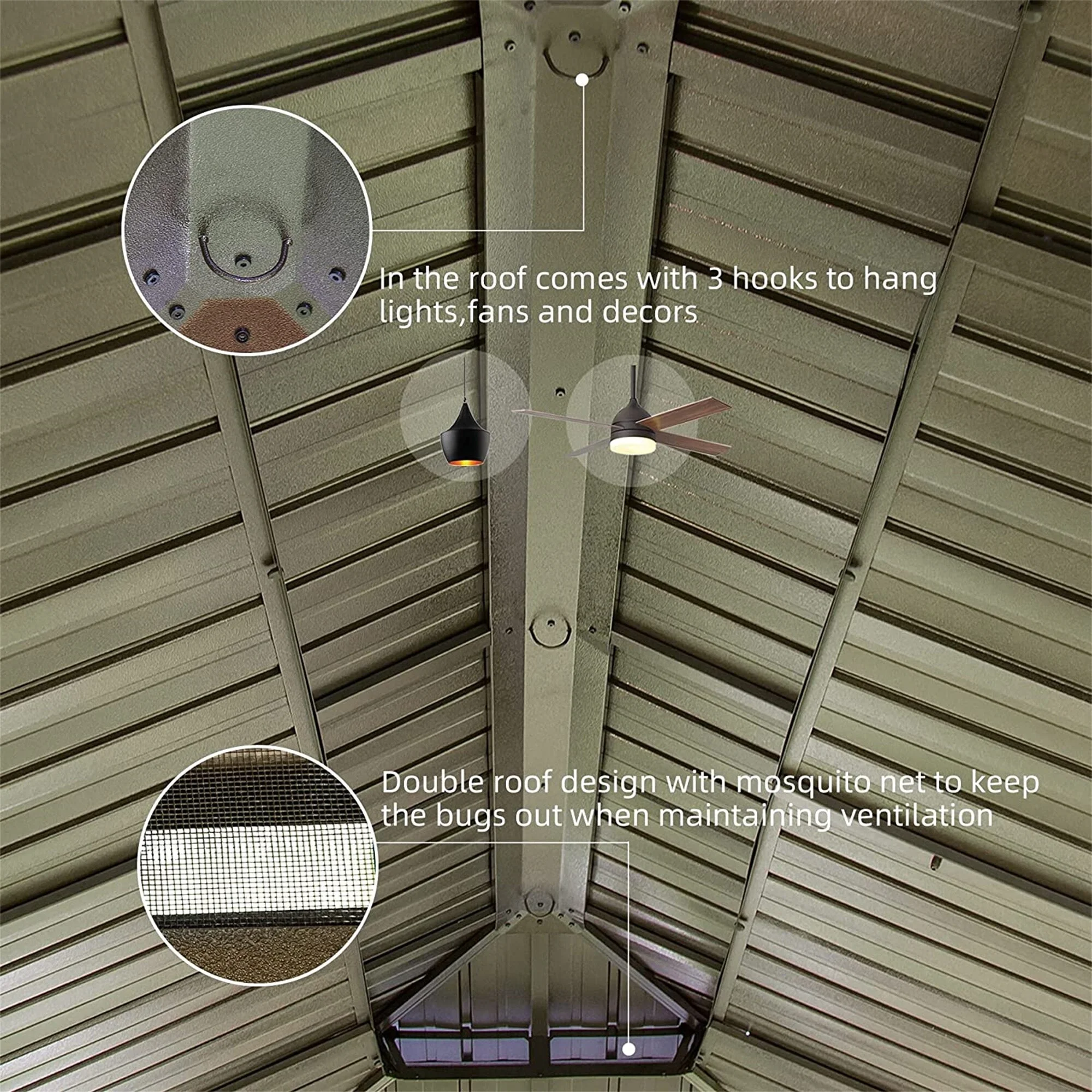 12' x 20' Metal Gazebo with Curtains and Netting, Galvanized Steel Double Canopy Pergola for Backyard, Patio, Yellow Brown - Curated Treasures Market
