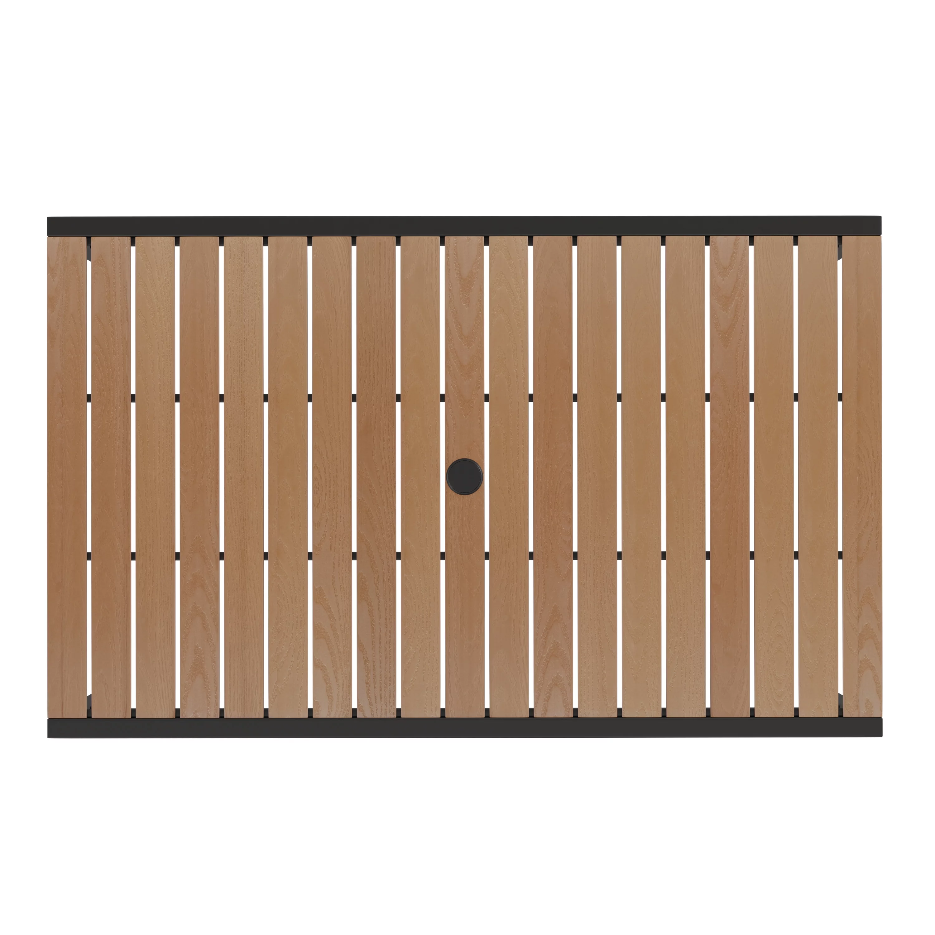 BizChair 7 Piece Outdoor Patio Dining Table Set with 4 Synthetic Teak Stackable Chairs, 30" x 48" Table, Red Umbrella & Base - Curated Treasures Market