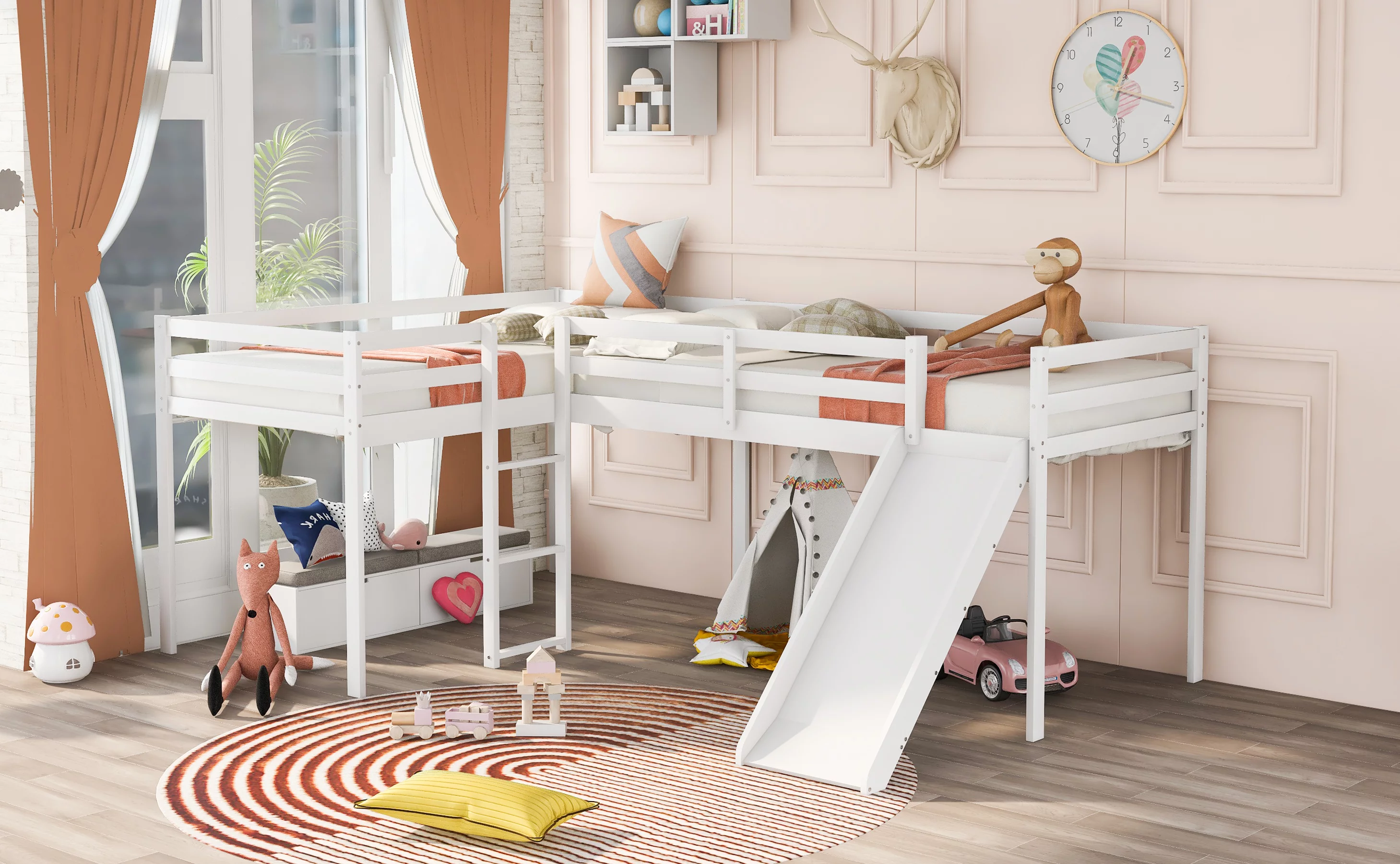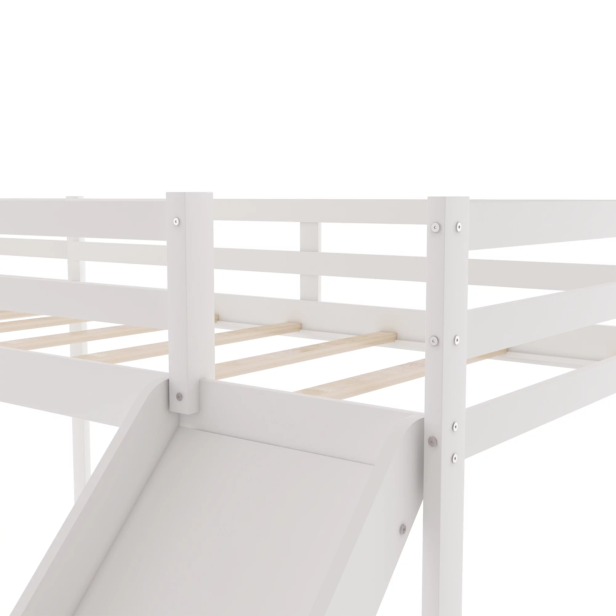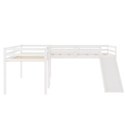 Churanty L-Shaped Loft Bed with Slide, Wooden Low Loft Beds for 2 Kids , Twin Size Low Loft Bed with Built-in Ladders, White - Curated Treasures Market