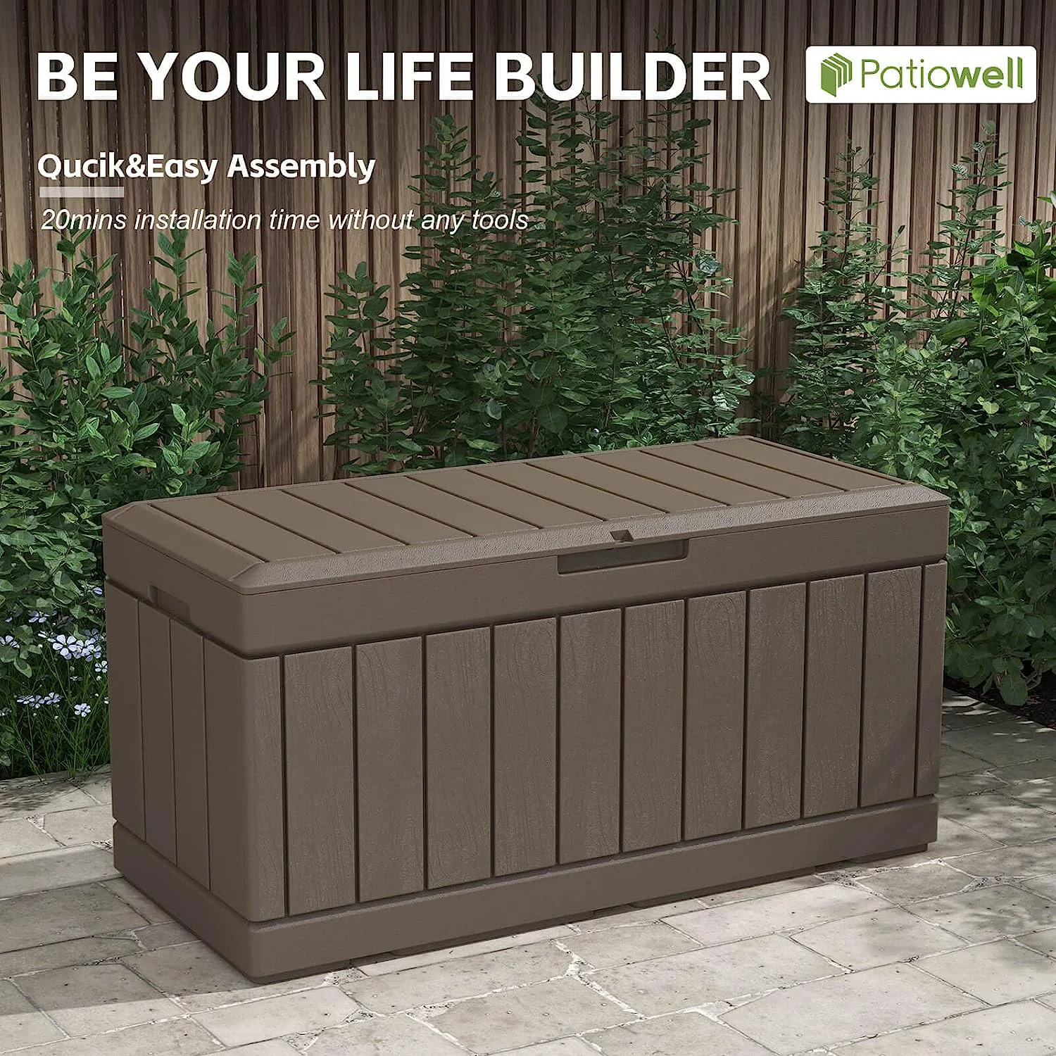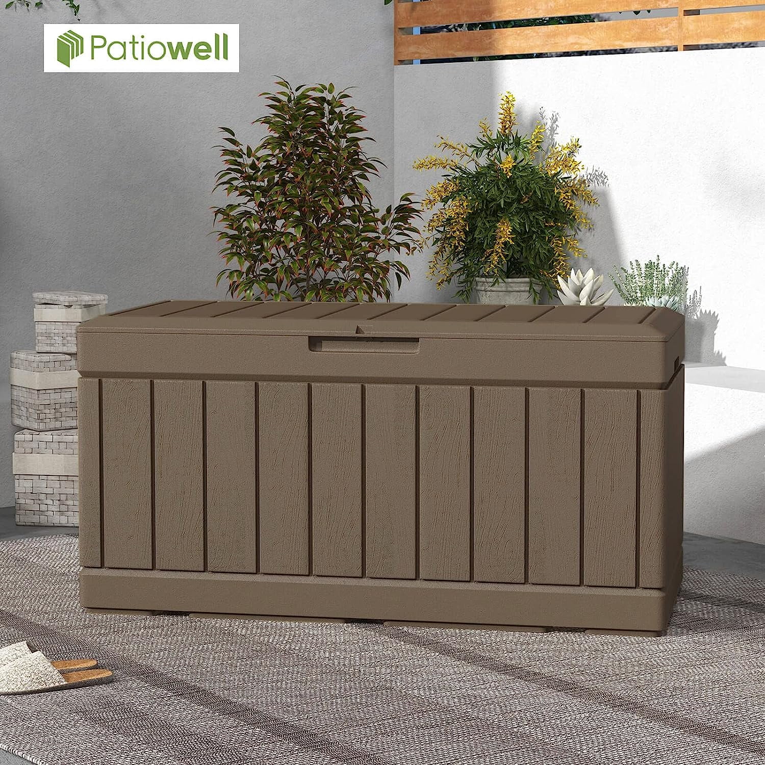 AUCHI 82 Gallon Resin Deck Box, Waterproof Large Wood Look Storage Box for Patio Furniture, Pool Accessories, Toys, Garden Tools and Sports Equipment, Lockable, Brown - Curated Treasures Market