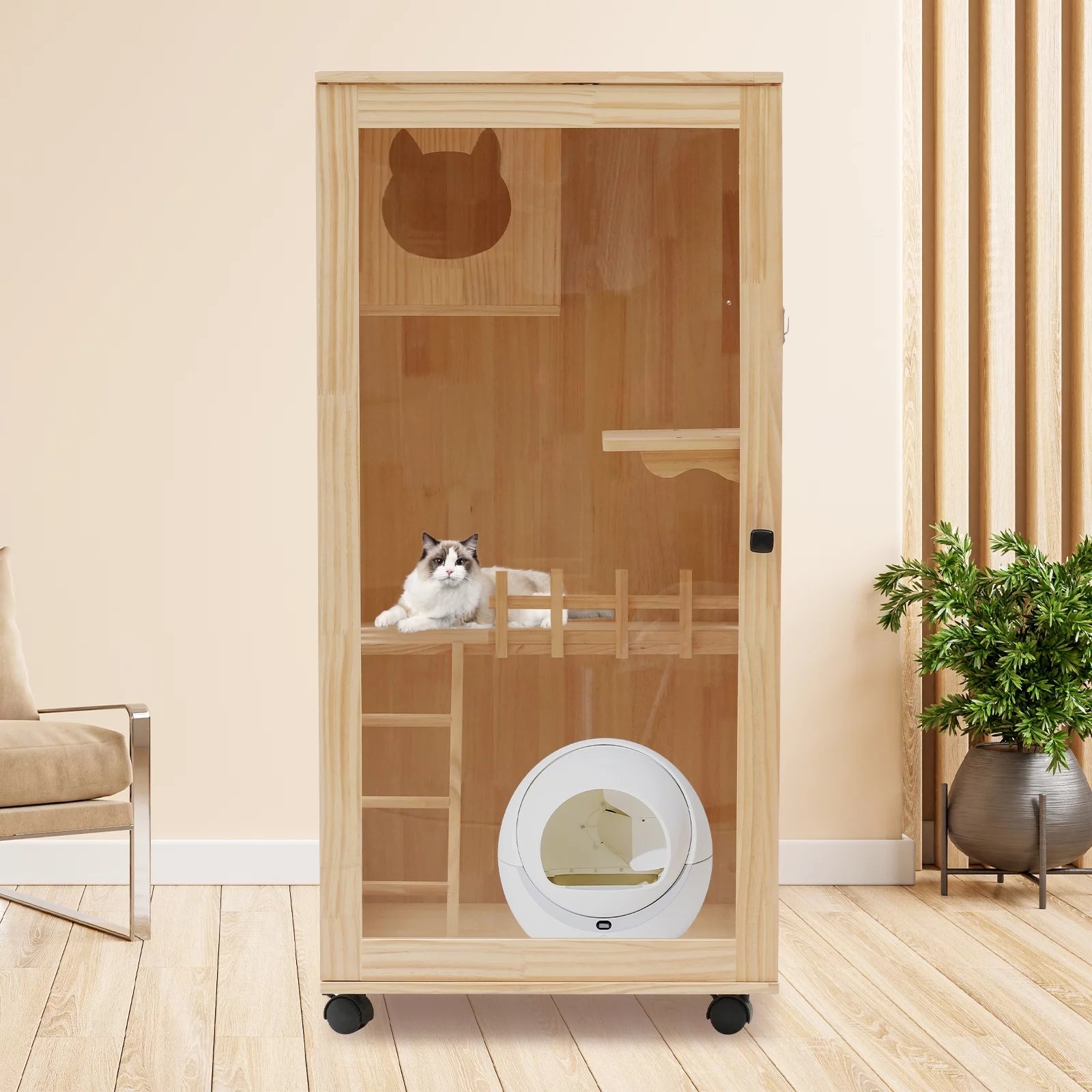 Miumaeov Large Wooden Cat House for Outdoor and Indoor Cats,Luxury Multi-Feature Cat Condo with Cat Scratching Posts Oversized Cat Villa on Wheels (23.62*23.62*47.24 inch) - Curated Treasures Market