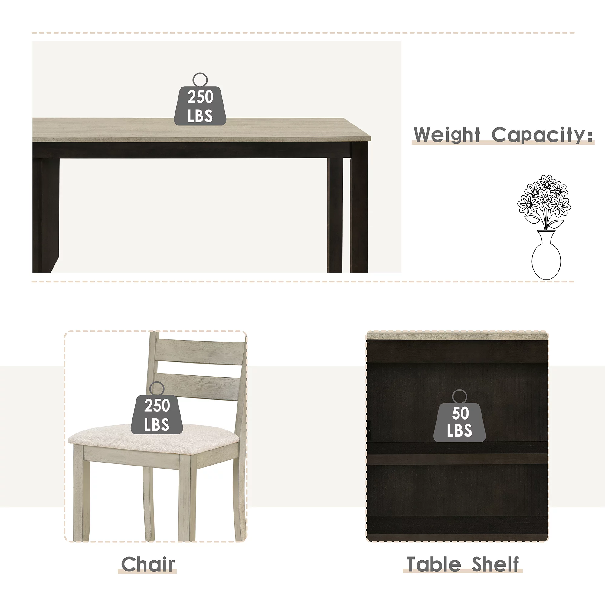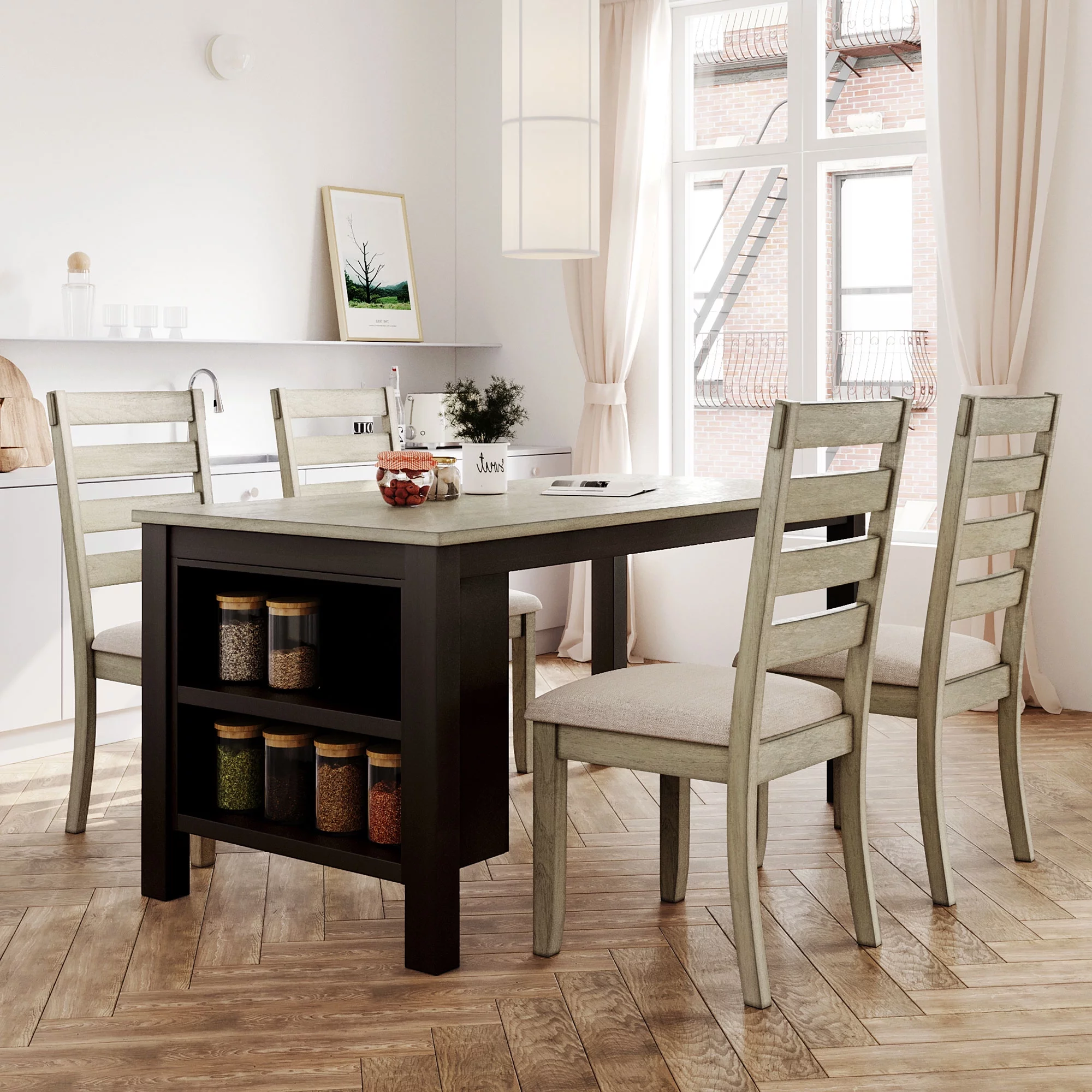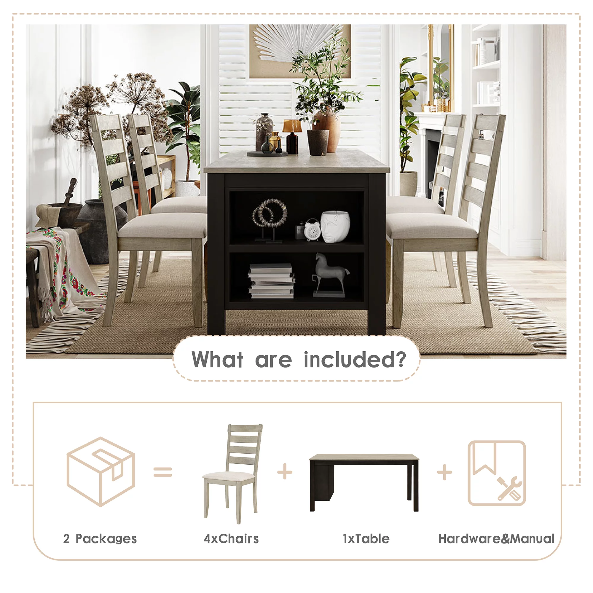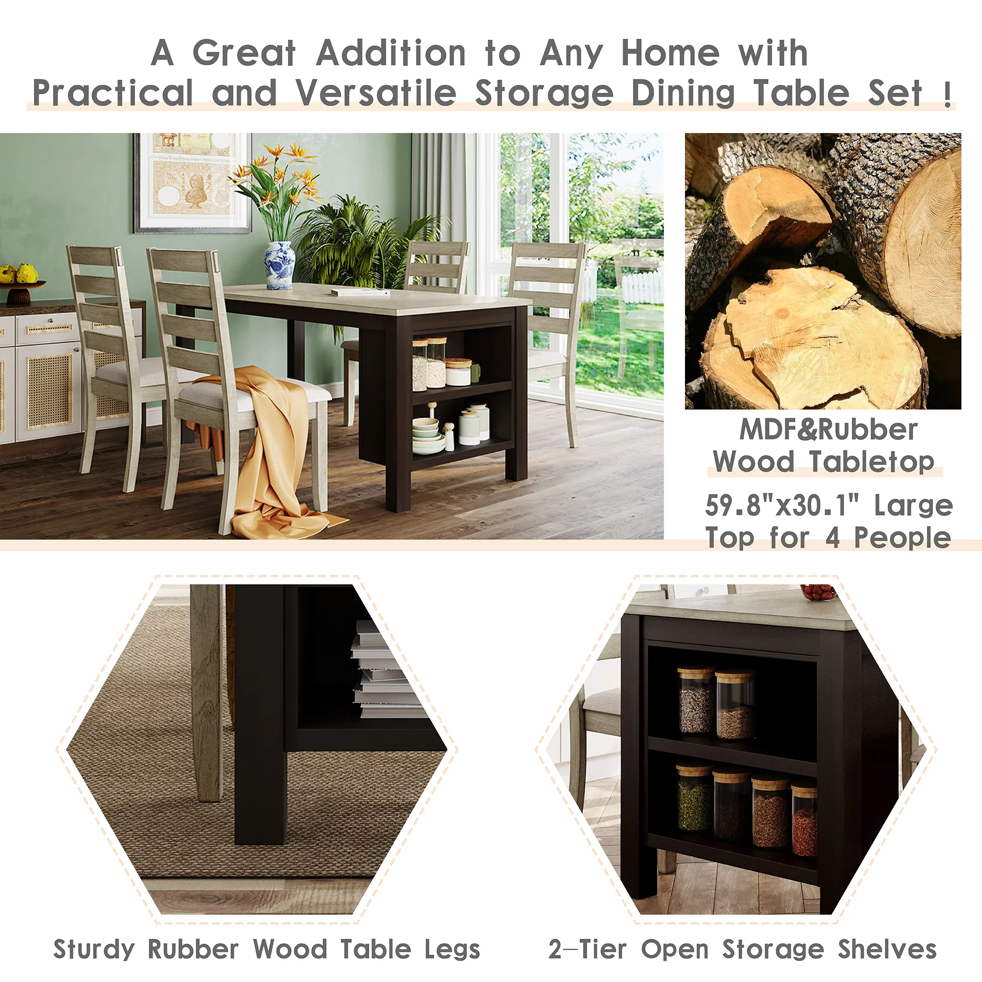 EUROCO 60" 5PCS Solid Wood Dining Table Set, Farmhouse Dining Room Table with 2-Tier Storage Shelves and 4 Padded Dining Chairs,Modern Wood Kitchen Table and Chairs Set for 4 - Curated Treasures Market