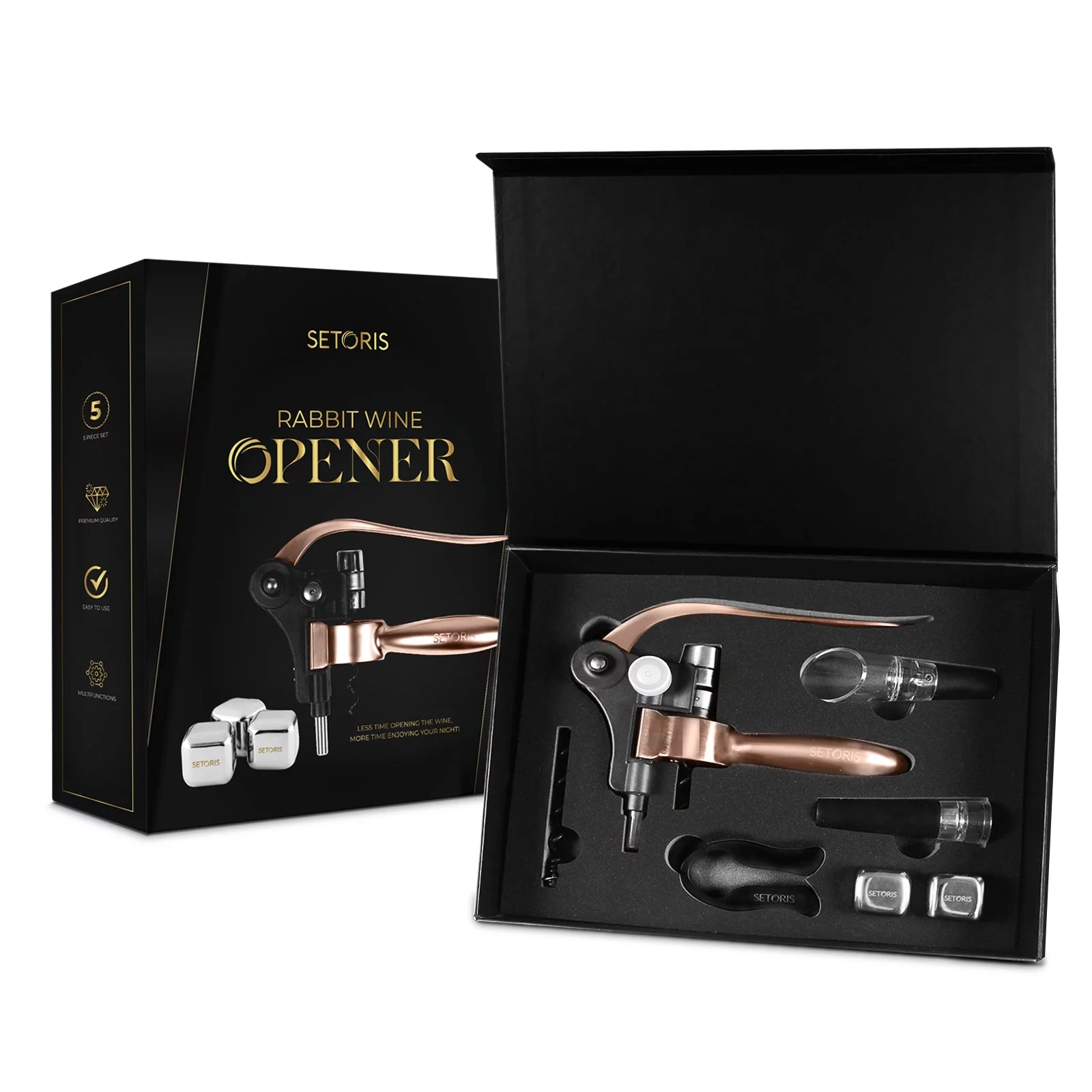 Heavy-Duty Rabbit Wine Opener With 2 Stainless Steel Ice Cubes By Setoris - Winged Corkscrew With Ergonomic Lever & Non-Stick Warm- Manual Rabbit Cork Remover- Great Wine Gift Idea - Curated Treasures Market