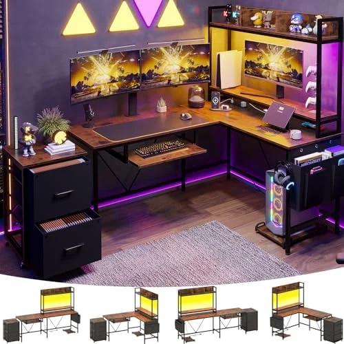 HBROLJF L Shaped Gaming Desk with Shelves 55in Reversible Home Office Desks with Power Outlet RGB Led Strip Movable File Cabinet Keyboard Tray 2 Drawers (Rustic Brown) - Curated Treasures Market