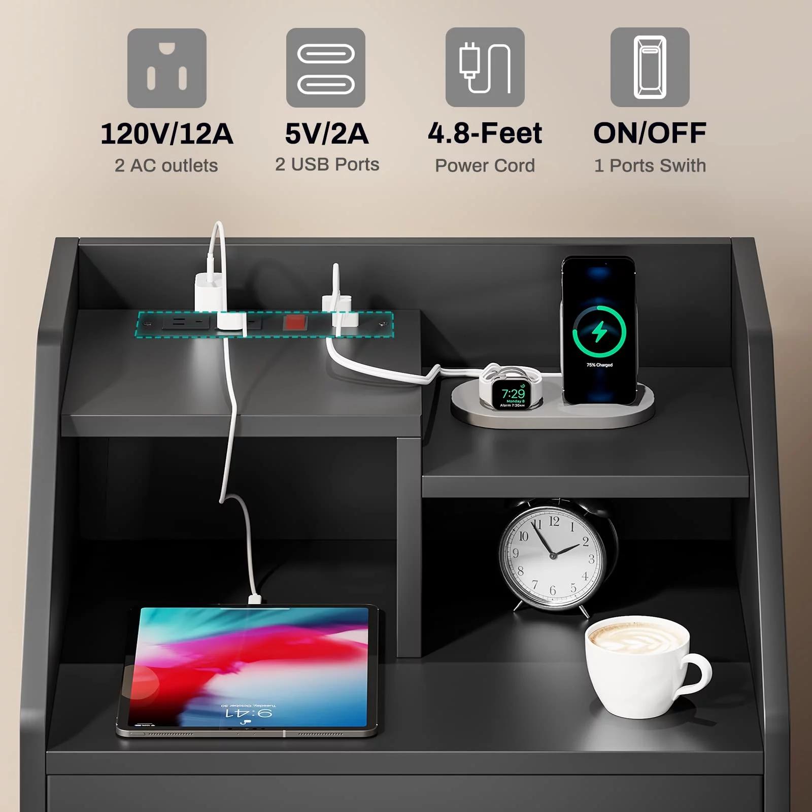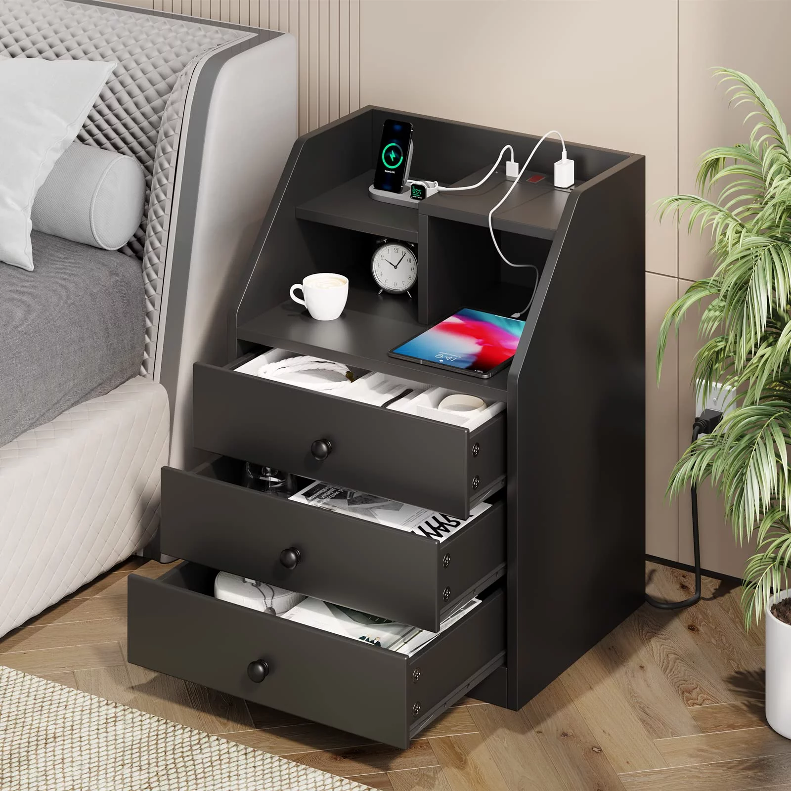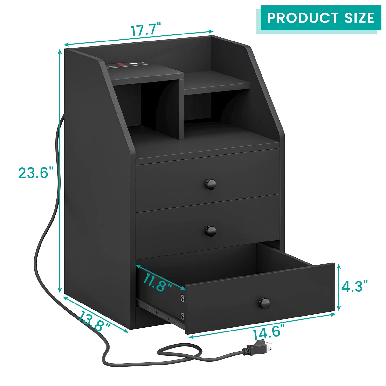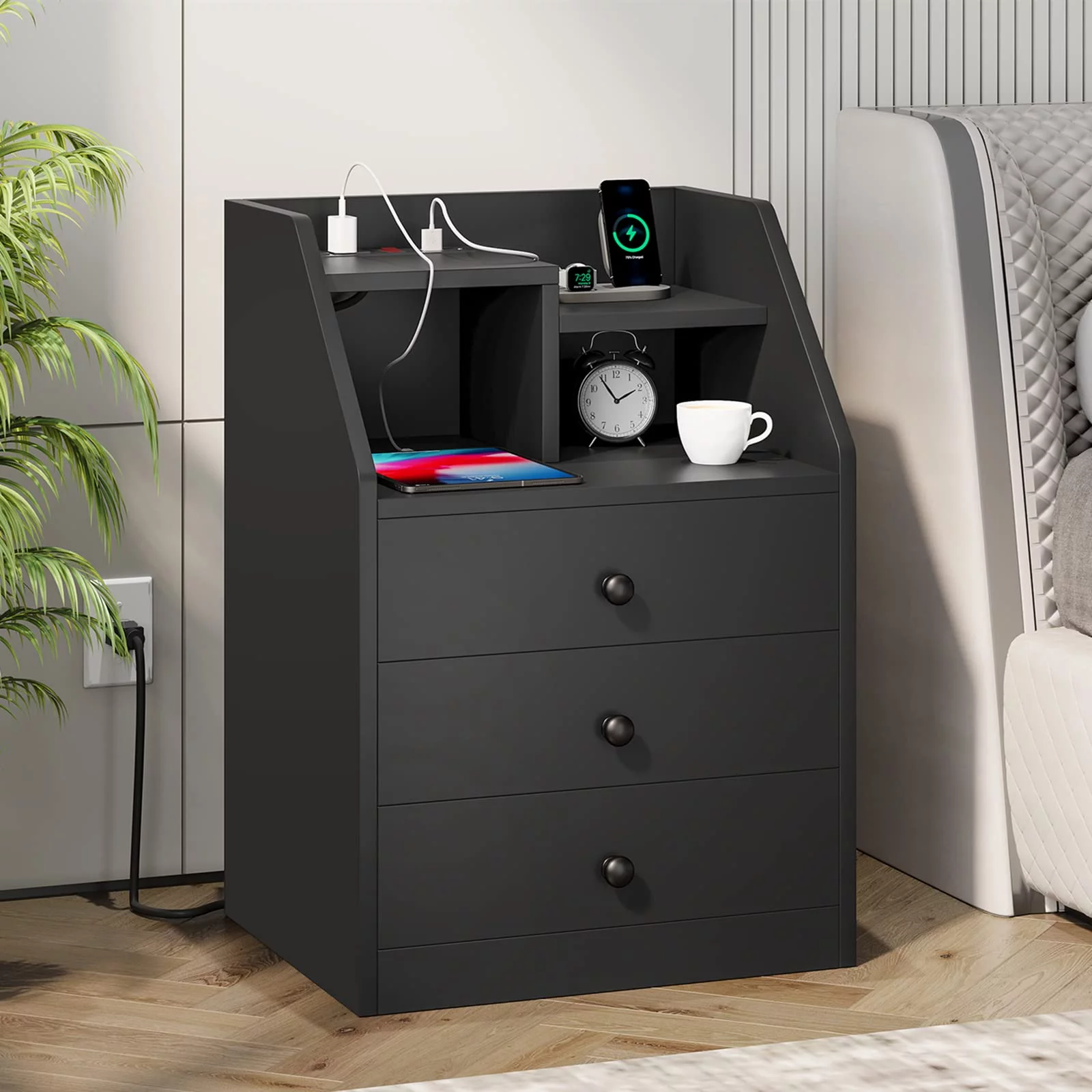 Nightstand with Charging Station, Black Night Stand with 3 Storage Drawers, Bedside Table for Bedroom - Curated Treasures Market