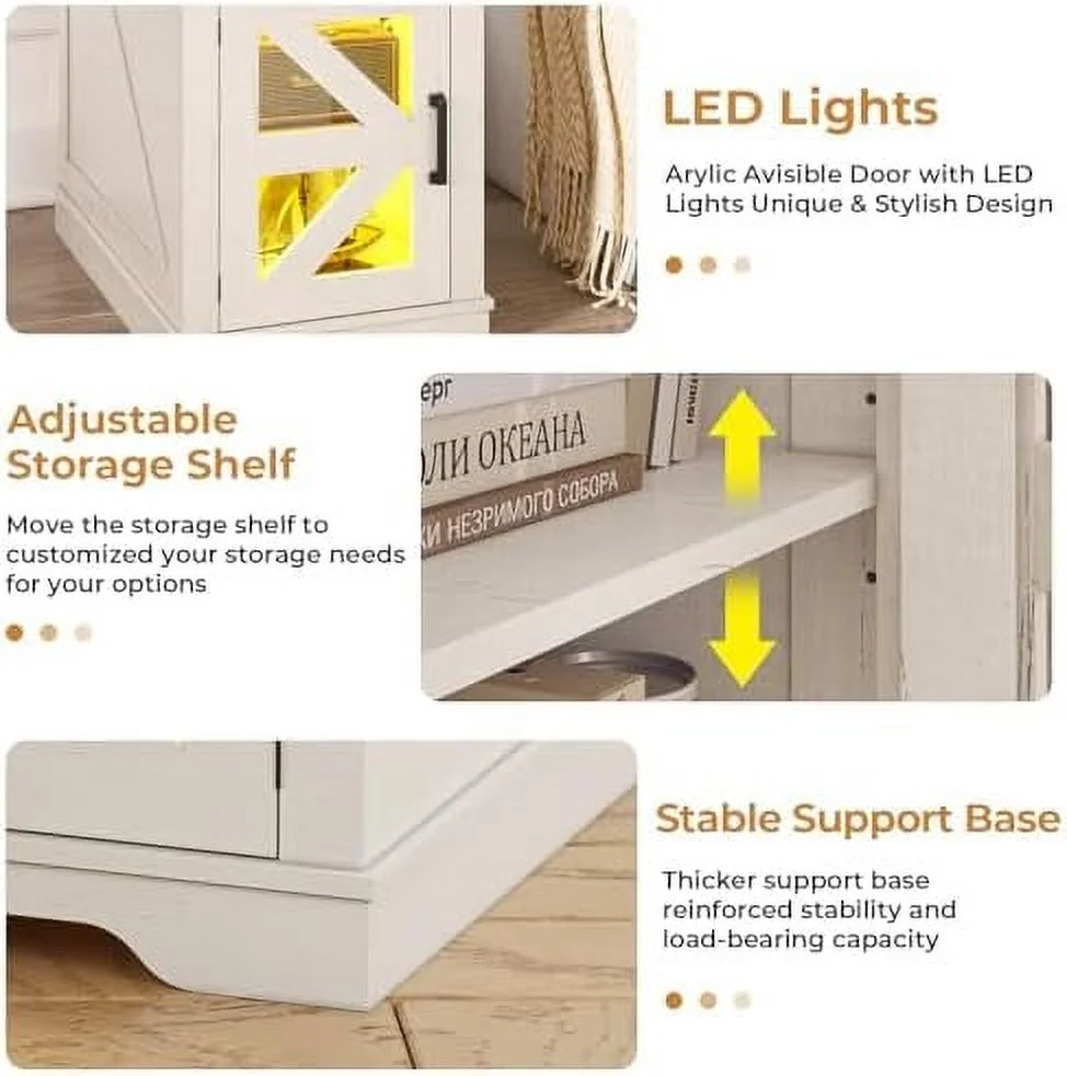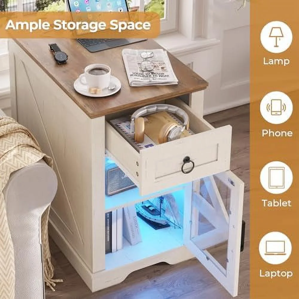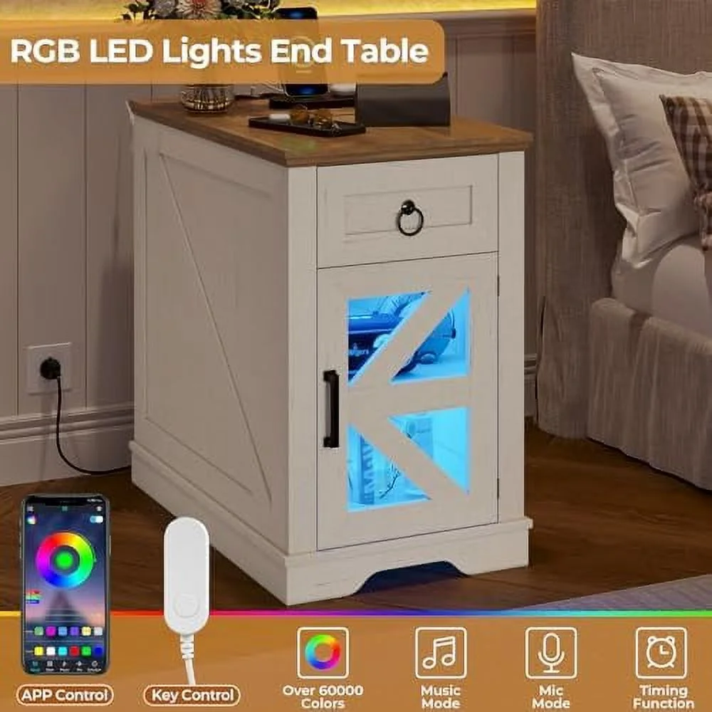 TQJKLFDY End Table with LED Lights & Charging Station Farmhouse Wooden Set 2 with Sliding Drawers Narrow Nightstand with LED Lights for Bedroom Living Room (White 2PCS) - Curated Treasures Market