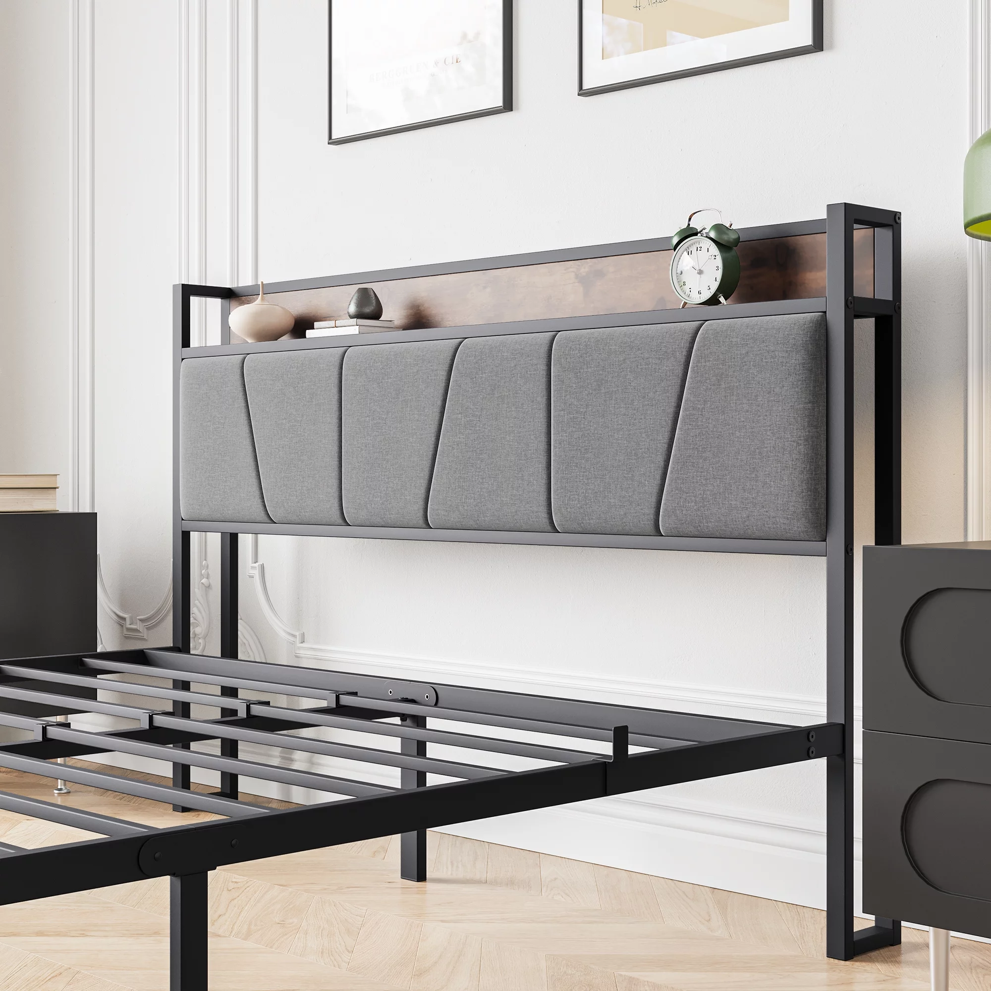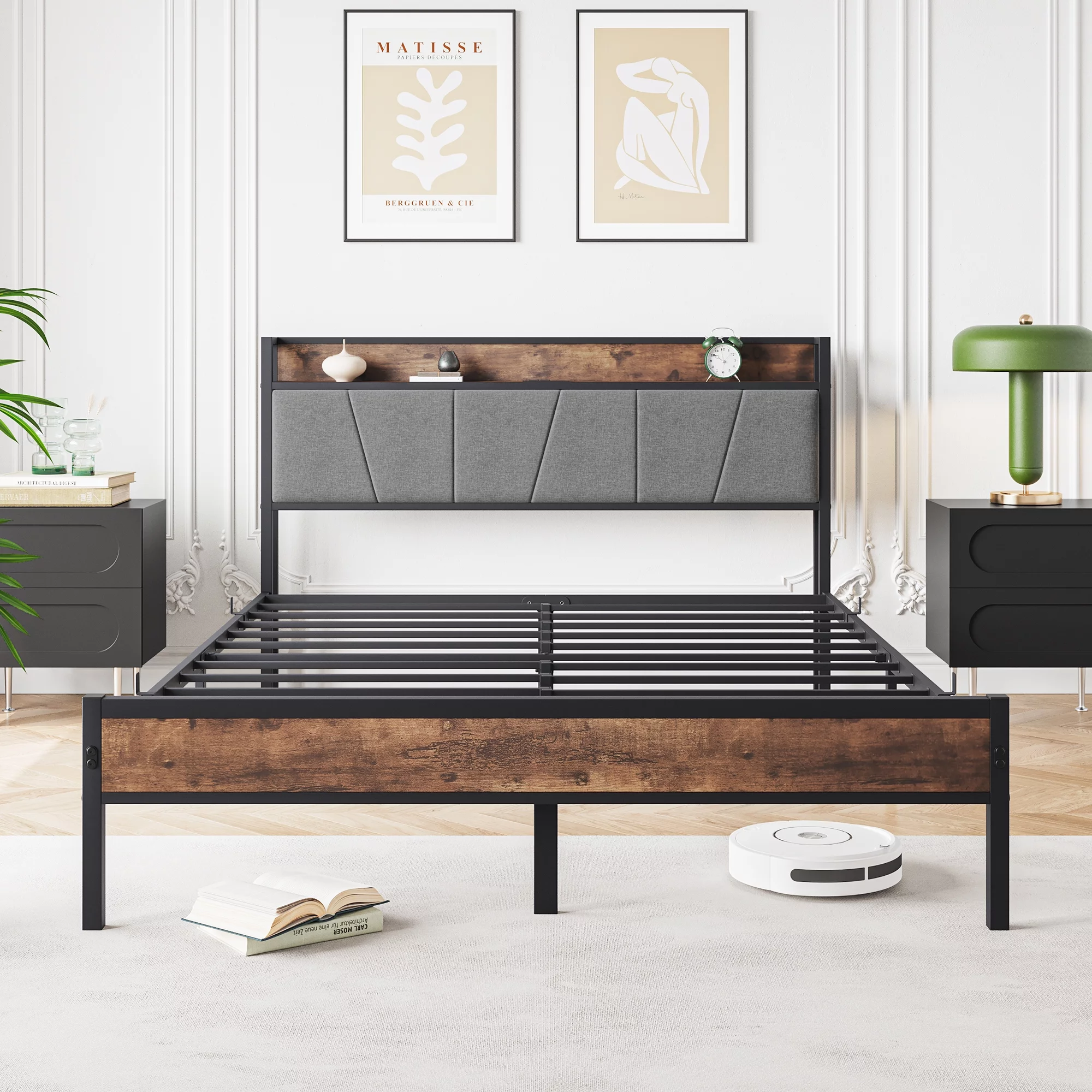 iRerts Queen Bed Frame with Charging Station, Metal Frame Queen Platform Bed Frame with Storage Headboard, 2 Outlets and 2 USB, Bed Frame Queen Size for Bedroom, No Box Spring Needed, Vintage Brown - Curated Treasures Market