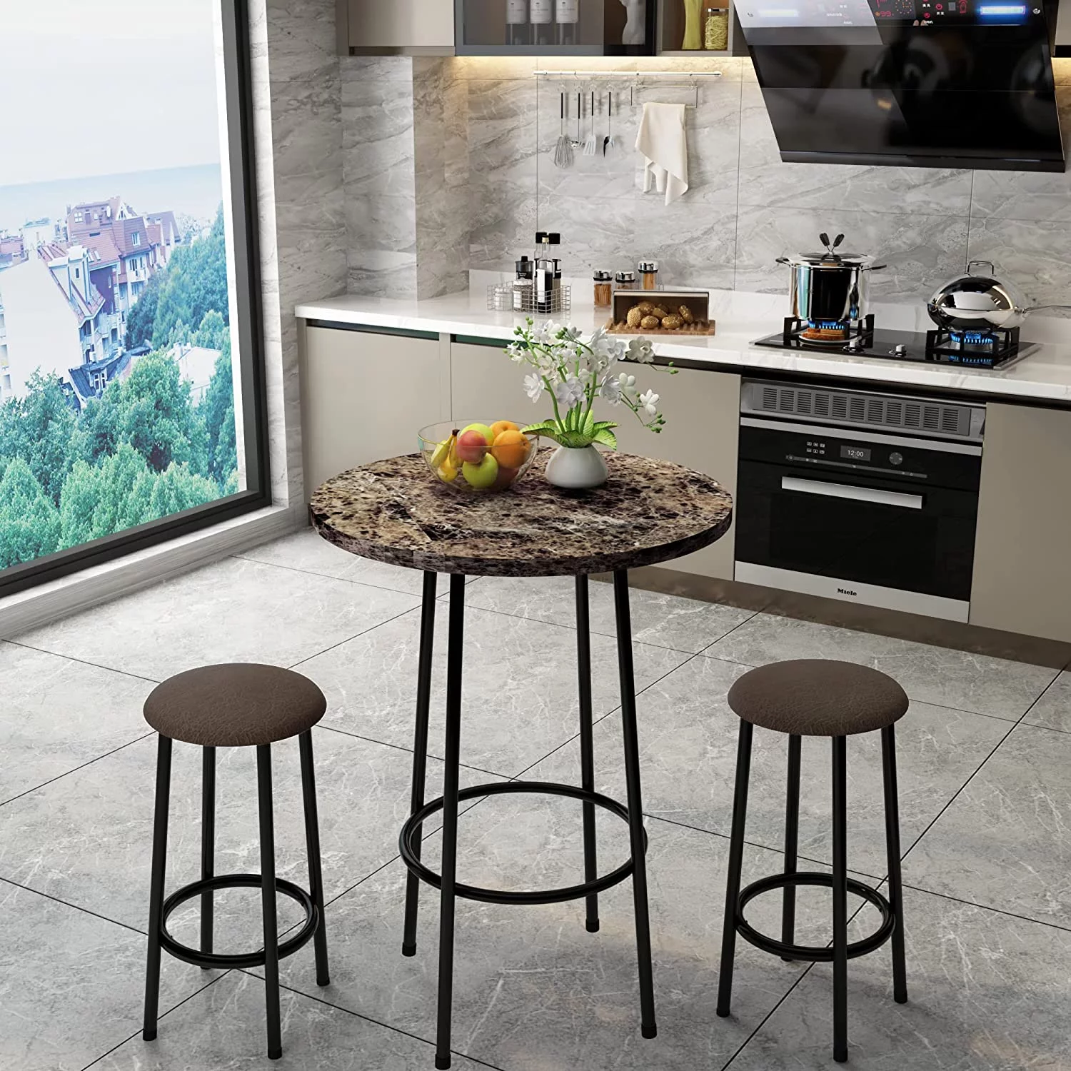 AWQM 3 Piece Bar Table Set, Round Bistro Table and Chairs Set of 2, Small Dining Pub Table Set for Breakfast Nook, Pub, Bistro, Small Spaces - Brown - Curated Treasures Market