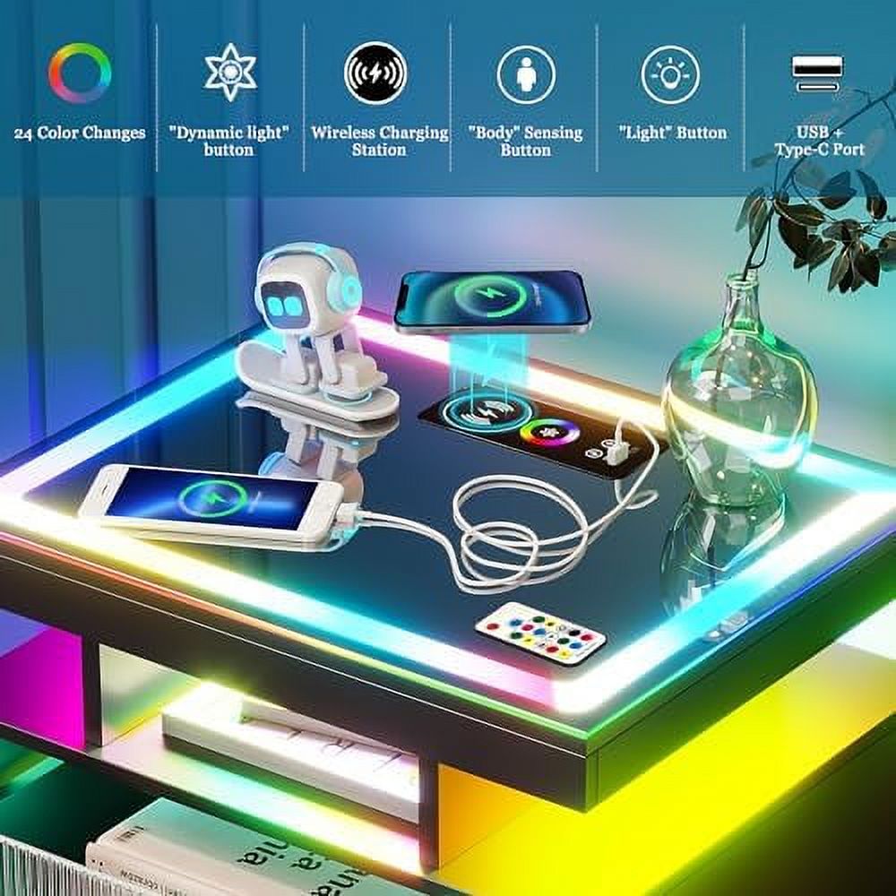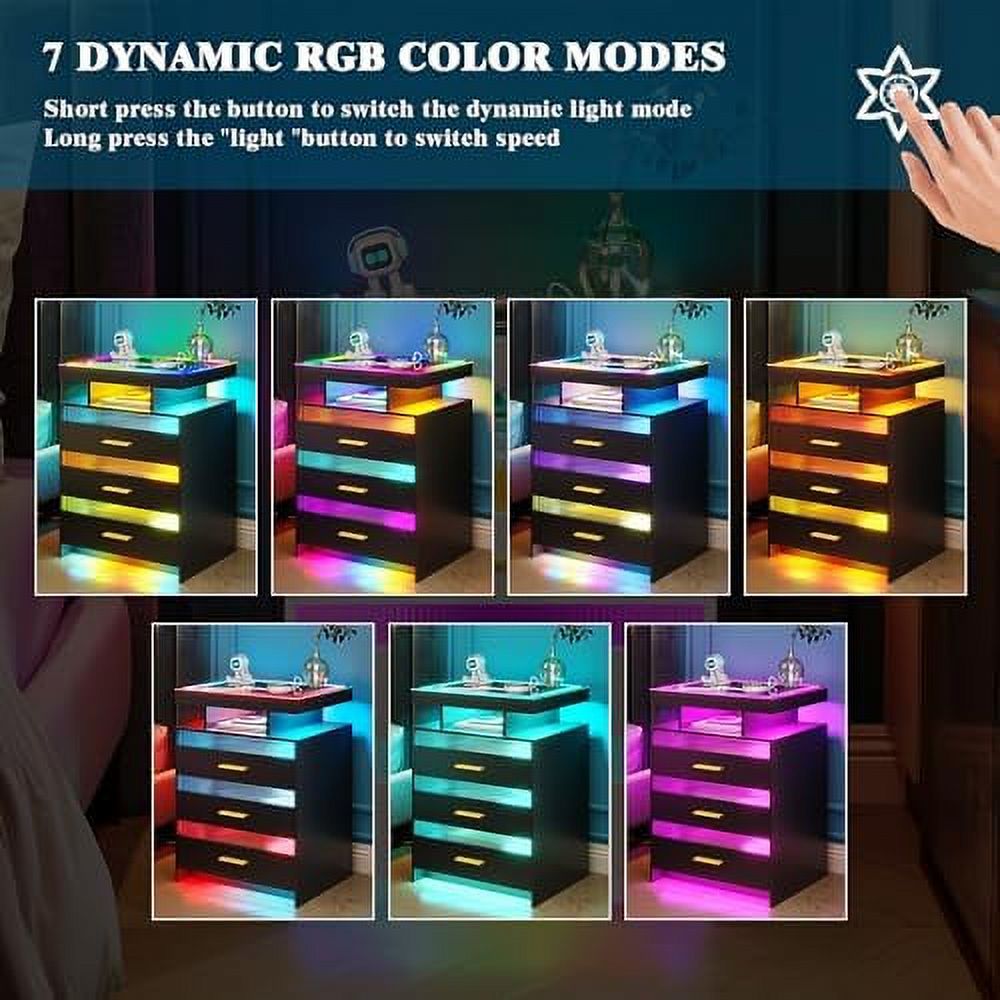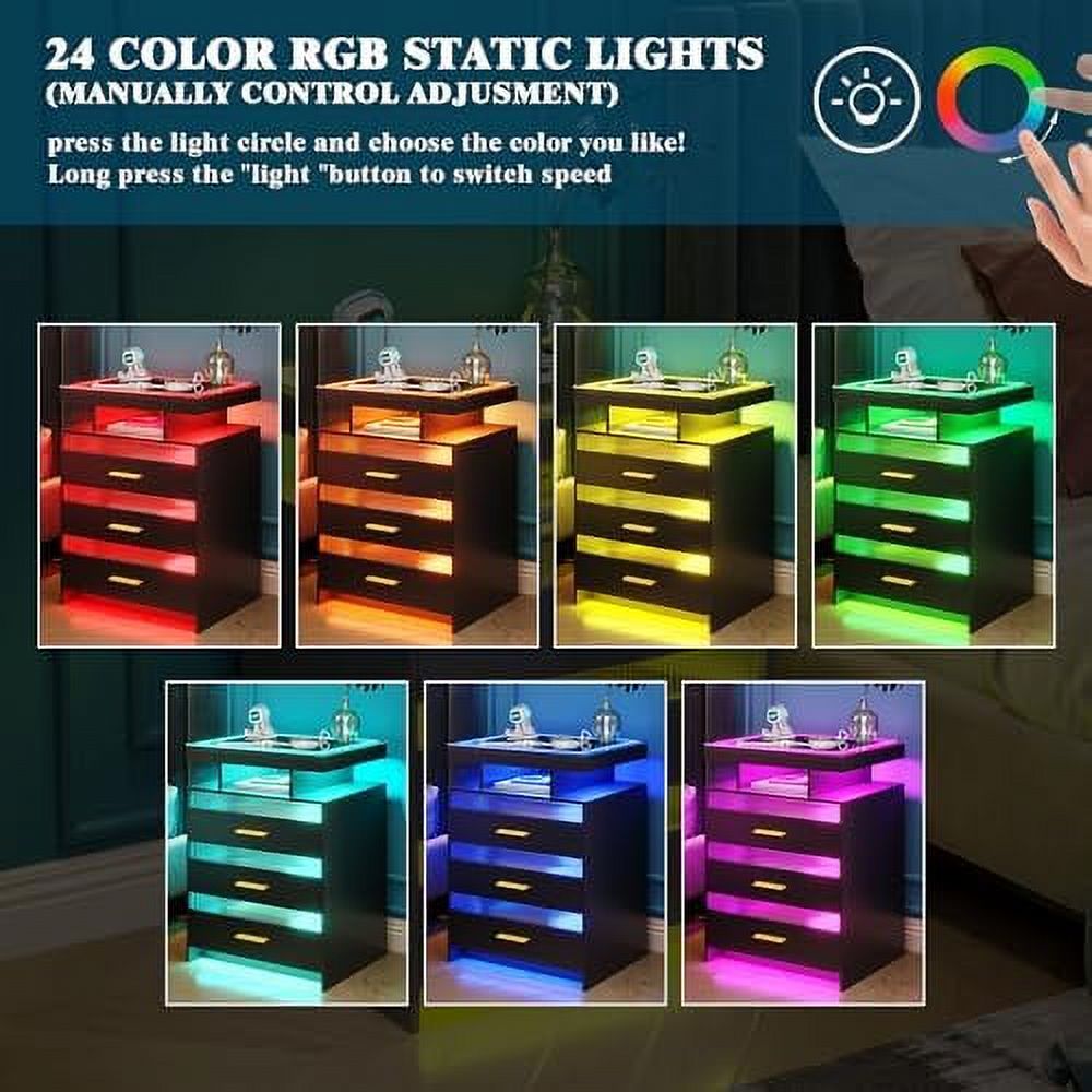 xrboomlife LED Nightstand with USB/Type-C/Wireless Charging Station Smart Night Stand with Auto 24-Colors RGB LED Light Bedside Table with 3 Drawers for Bedroom (Black 2PCS) - Curated Treasures Market