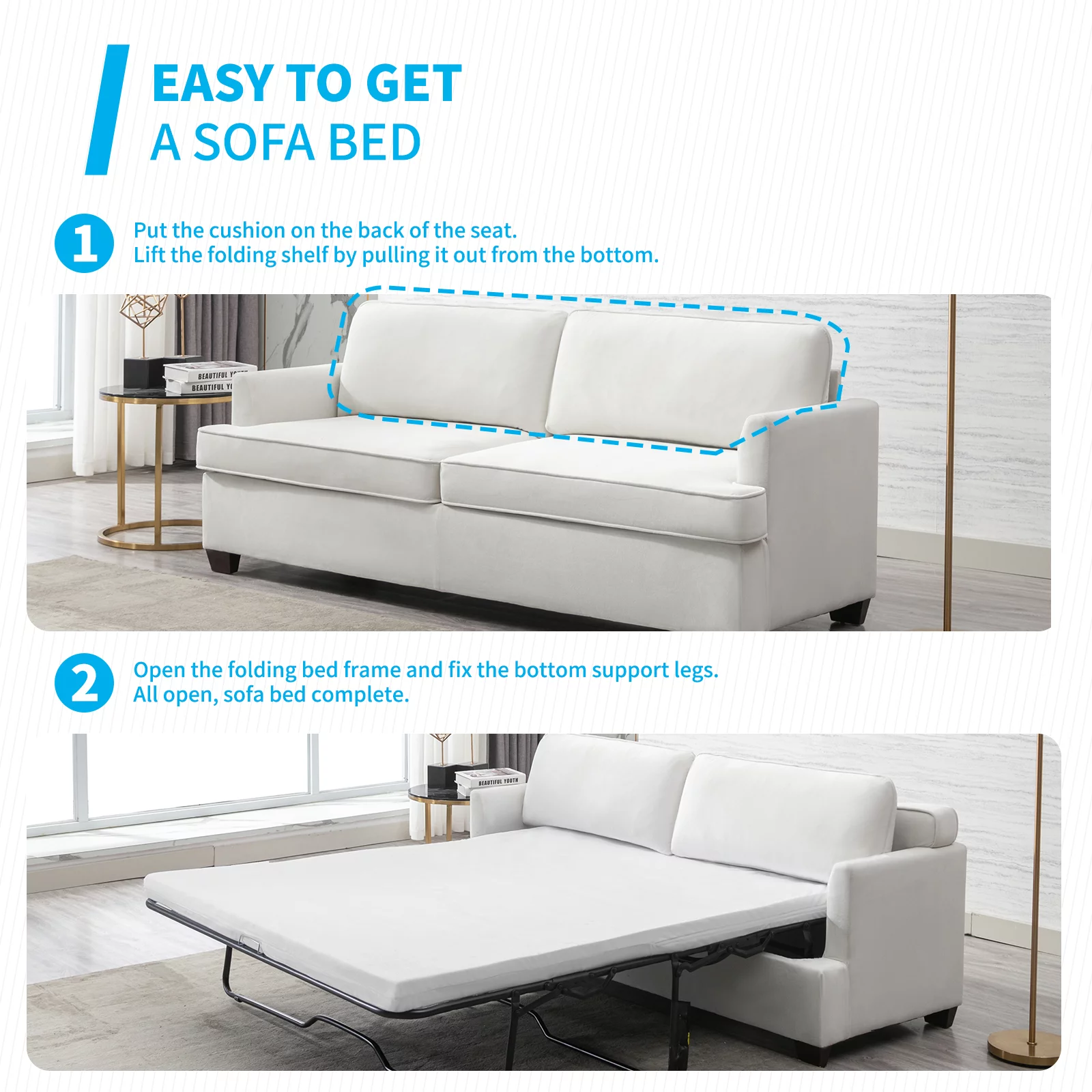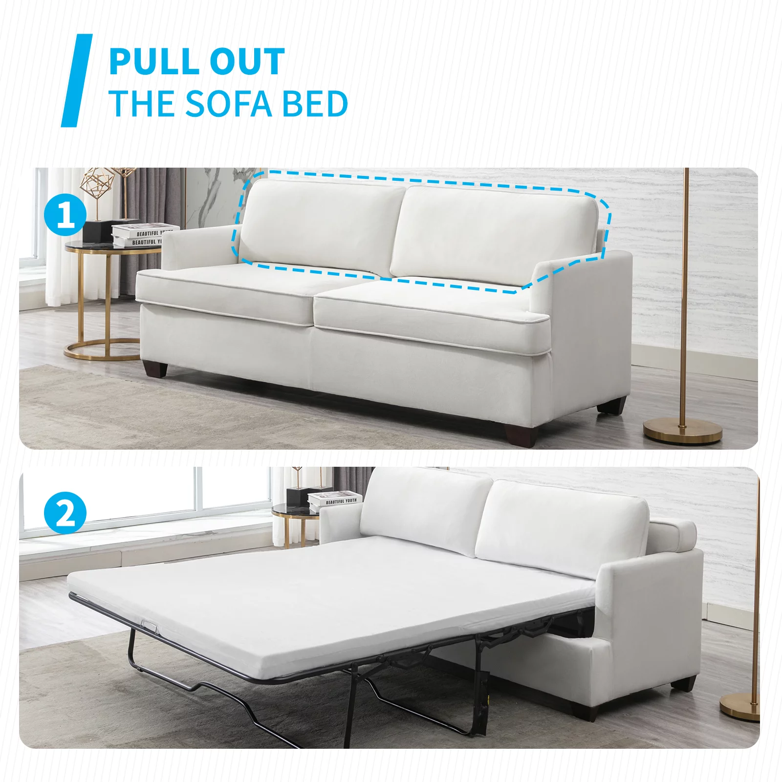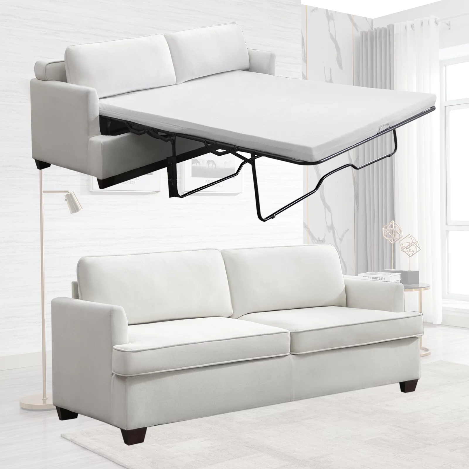 Mjkone 77.1"W Convertible Pull Out Sofa Bed with Foam Mattress , Velvet Loveseat Sleeper Sofa Bed, Queen Size Pull Out Couch Bed Living Room Set for Apartment, Small Spaces (Beige) - Curated Treasures Market