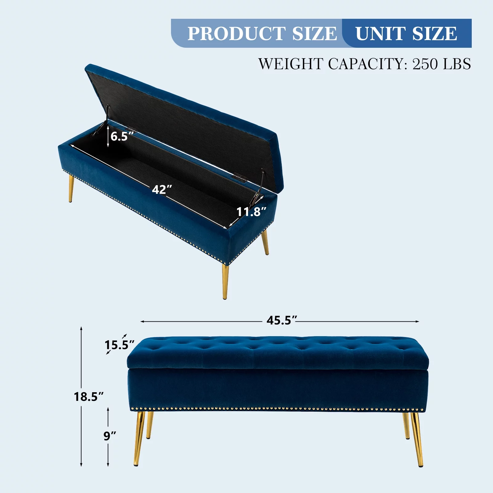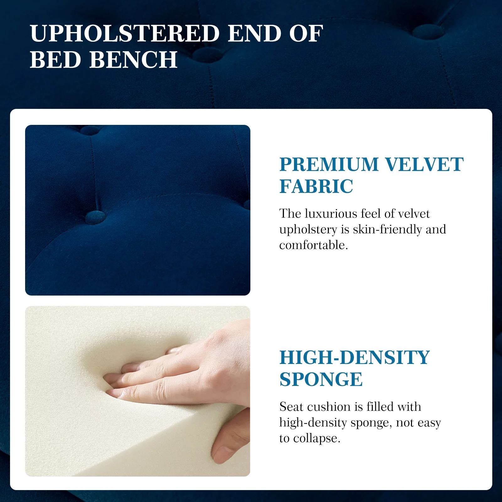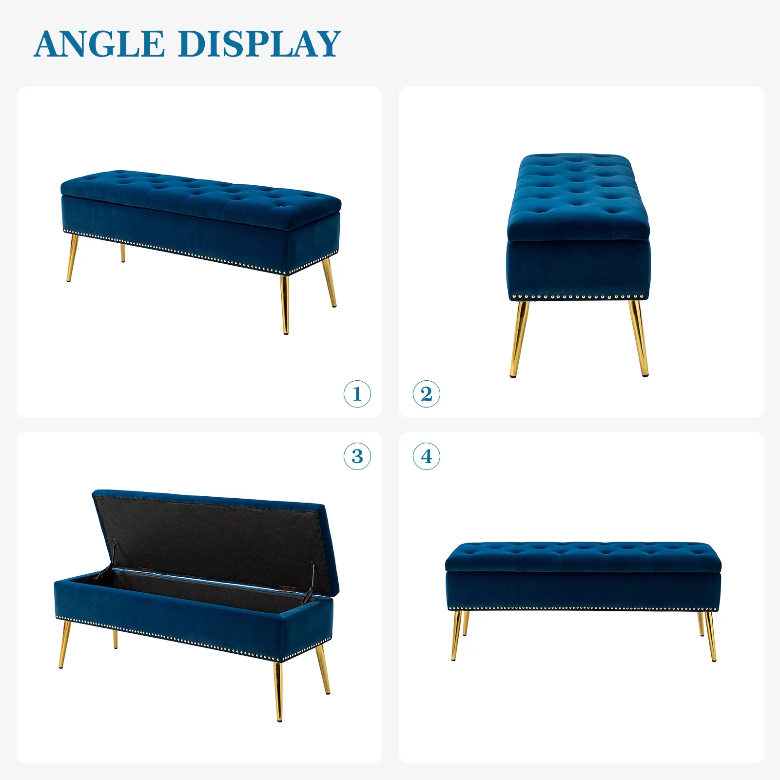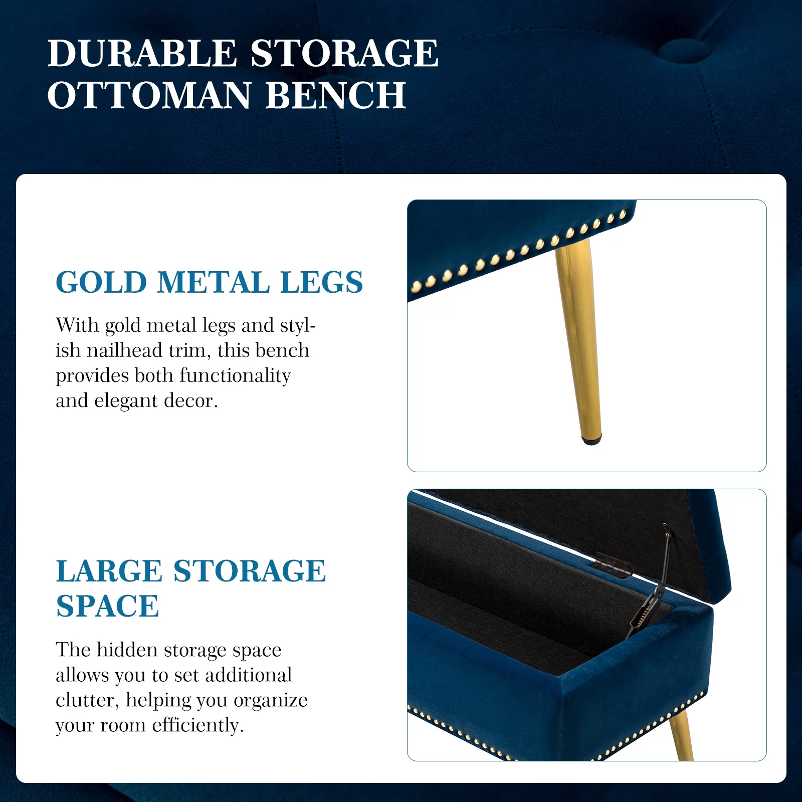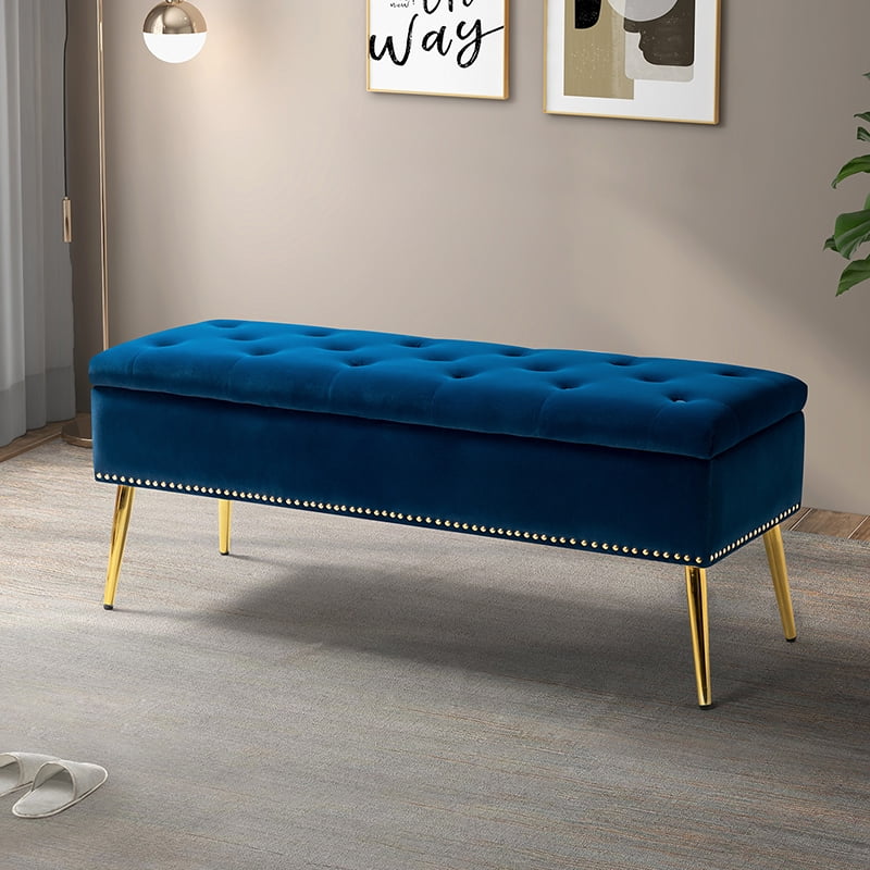 45" Storage Bench, Tina's Home Upholstered Button Tufted Entryway Ottoman Metal Leg Bedroom Navy - Curated Treasures Market