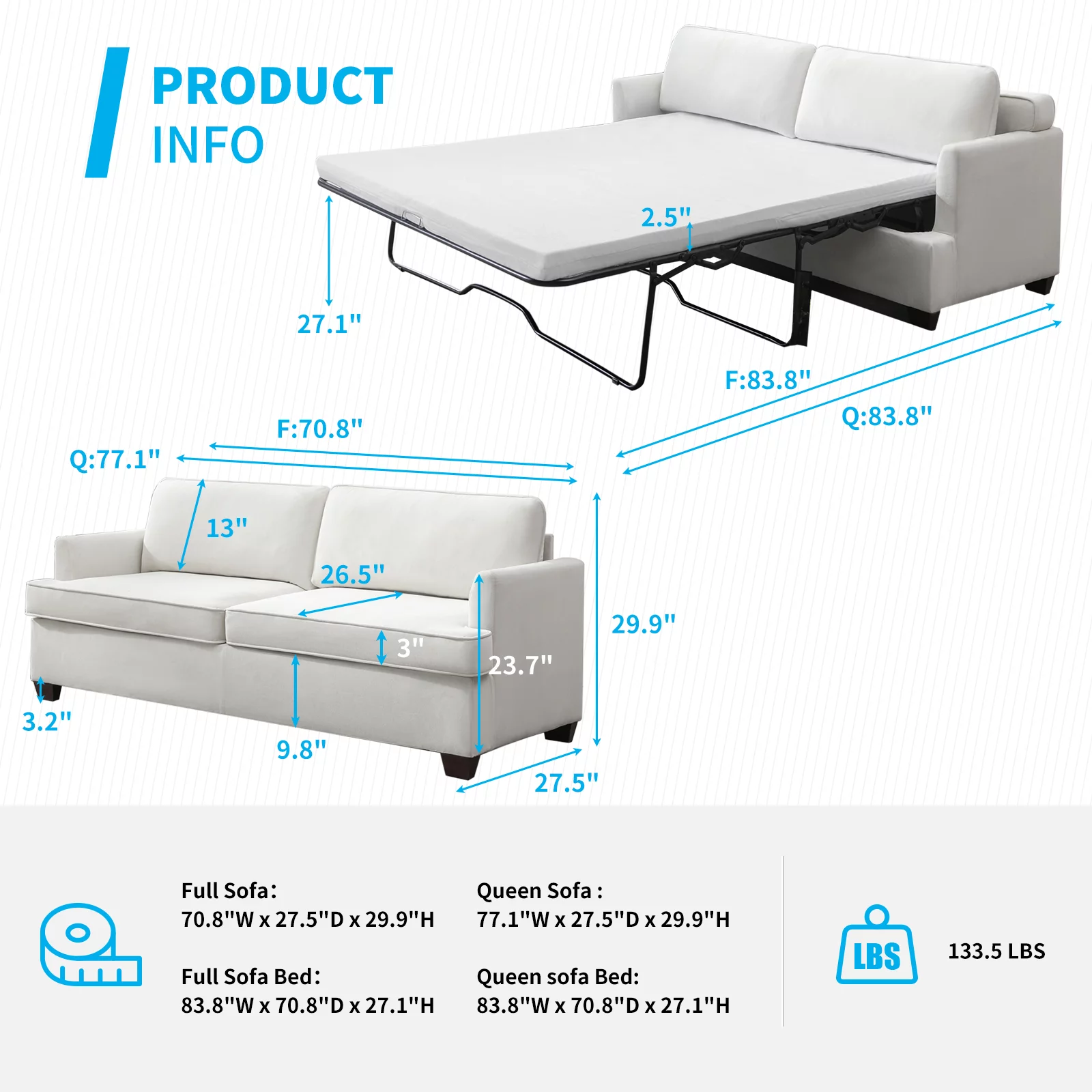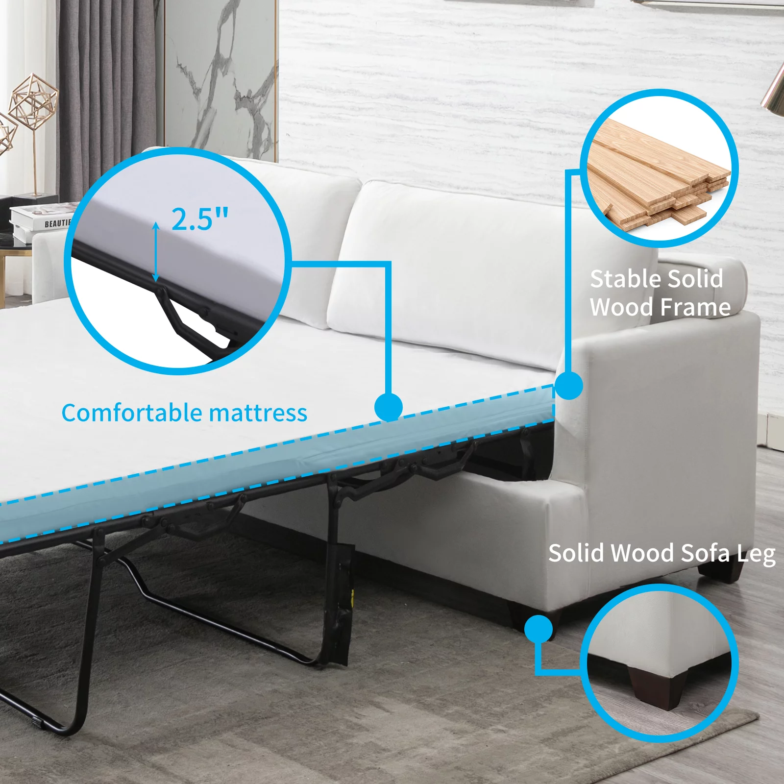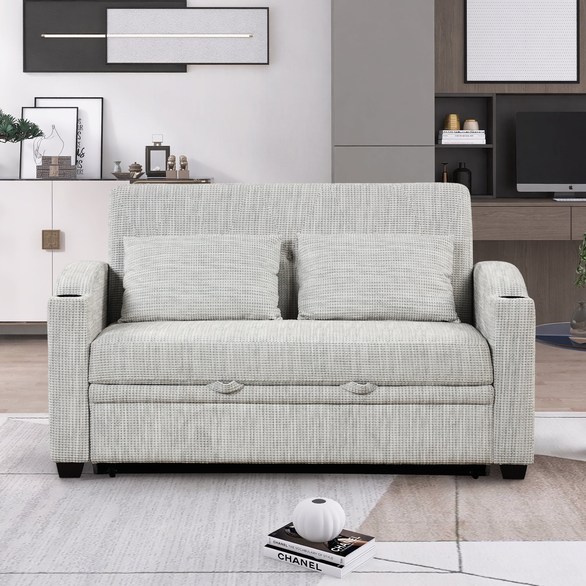 65" Pull Out Sofa Bed Modern Chenille Convertible Loveseat Sofa with Adjsutable Backrest, 2 Pillows, Cup Holders, USB Ports for Living Room, Apartment, White Gray - Curated Treasures Market