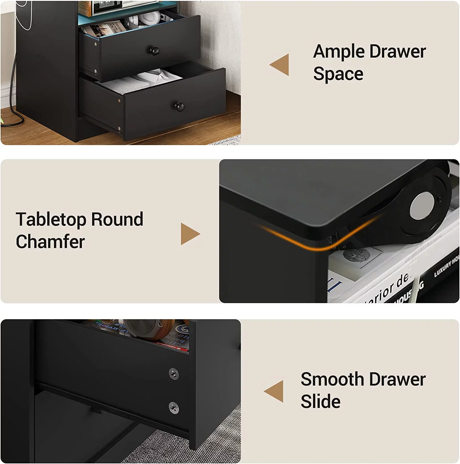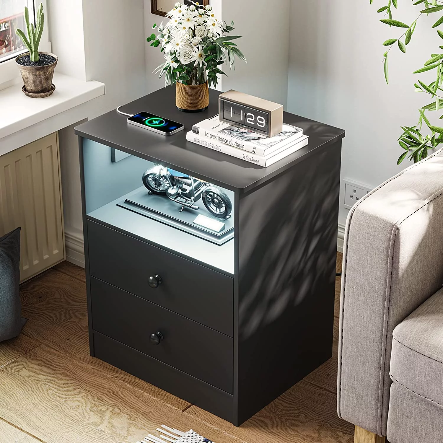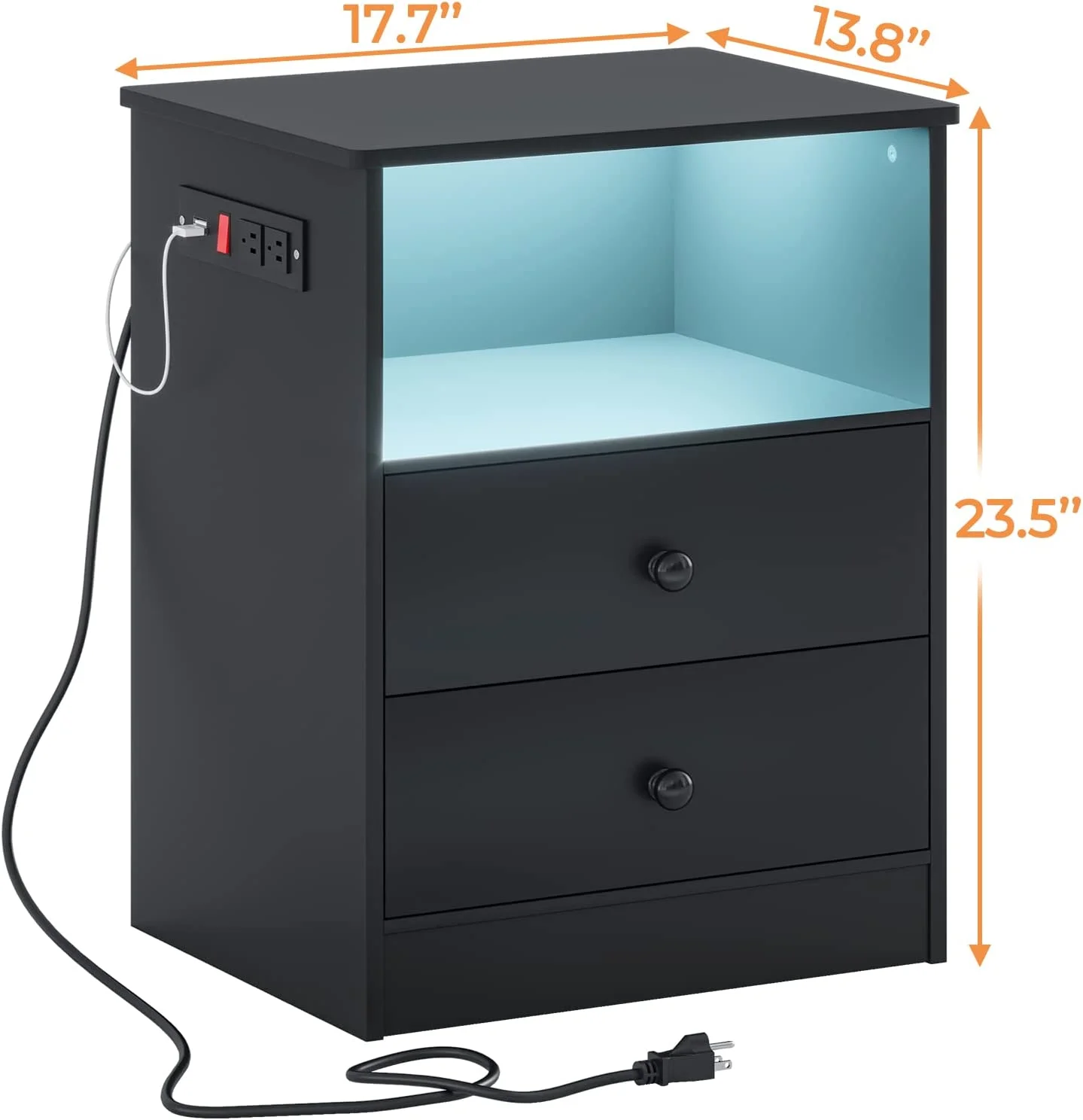 LED Light Nightstand Set of 2 with Charging Station, Bedside Table with 2 Drawers, Black End Table for Bedroom, Dimensions 17.7'' x 13.8'' x 23.5'' - Curated Treasures Market