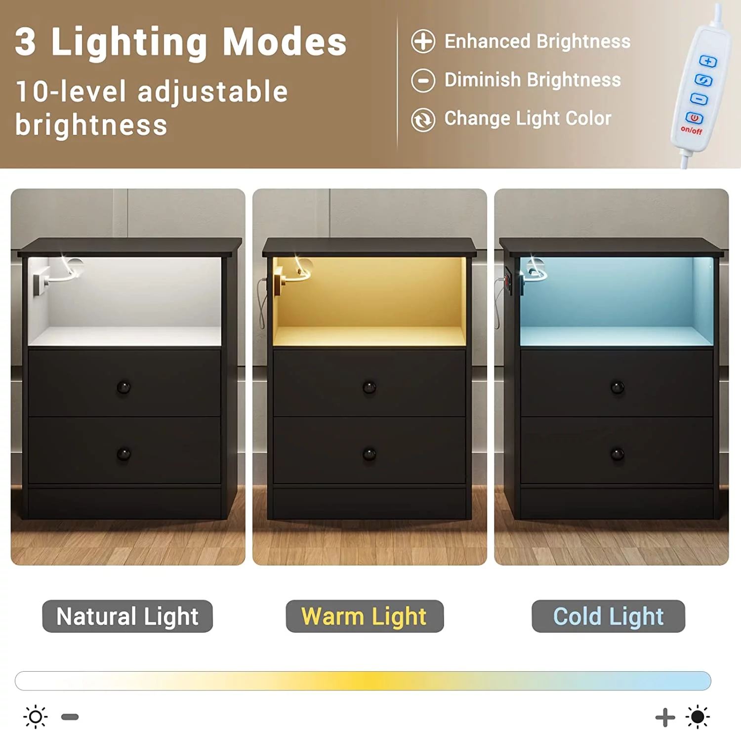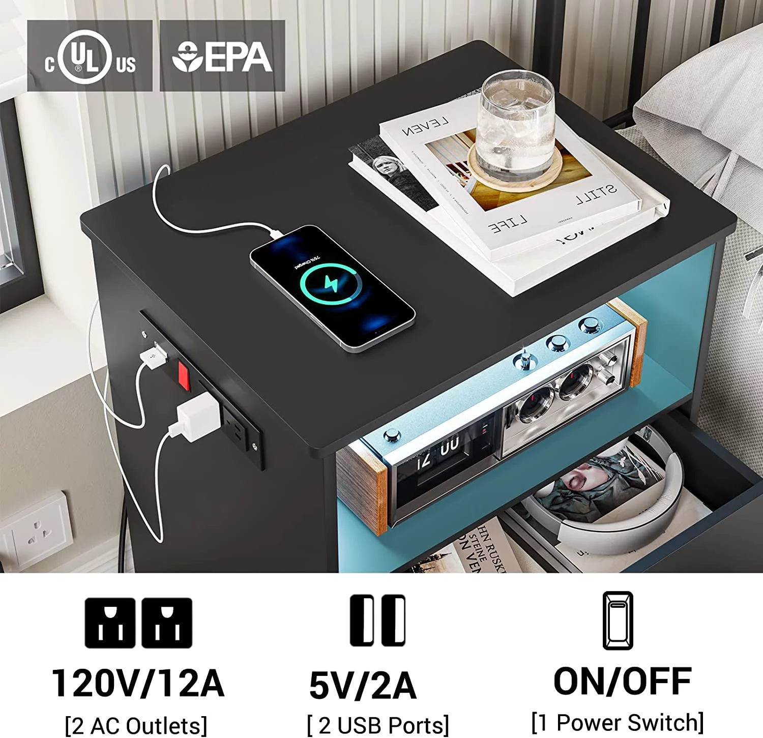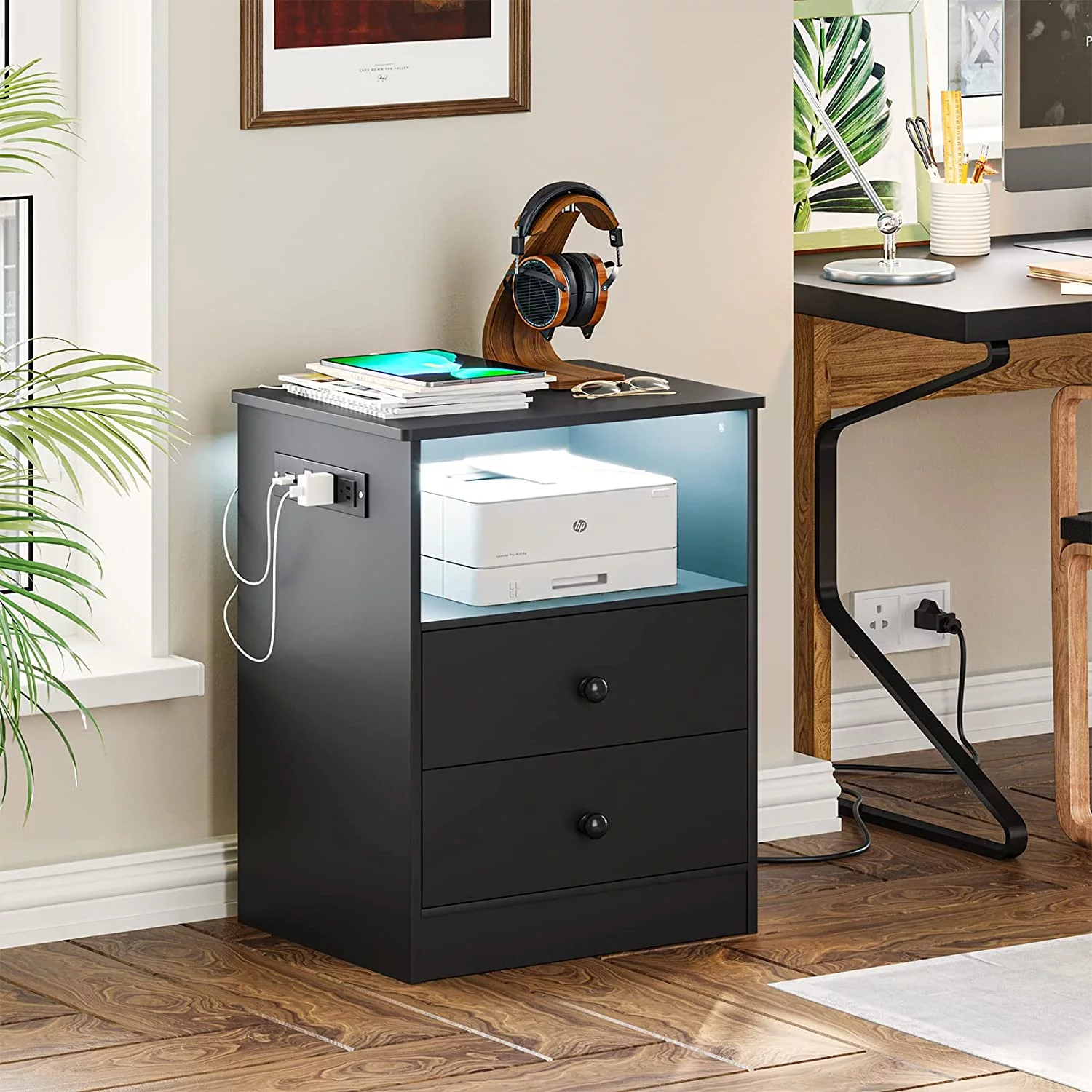 LED Light Nightstand Set of 2 with Charging Station, Bedside Table with 2 Drawers, Black End Table for Bedroom, Dimensions 17.7'' x 13.8'' x 23.5'' - Curated Treasures Market
