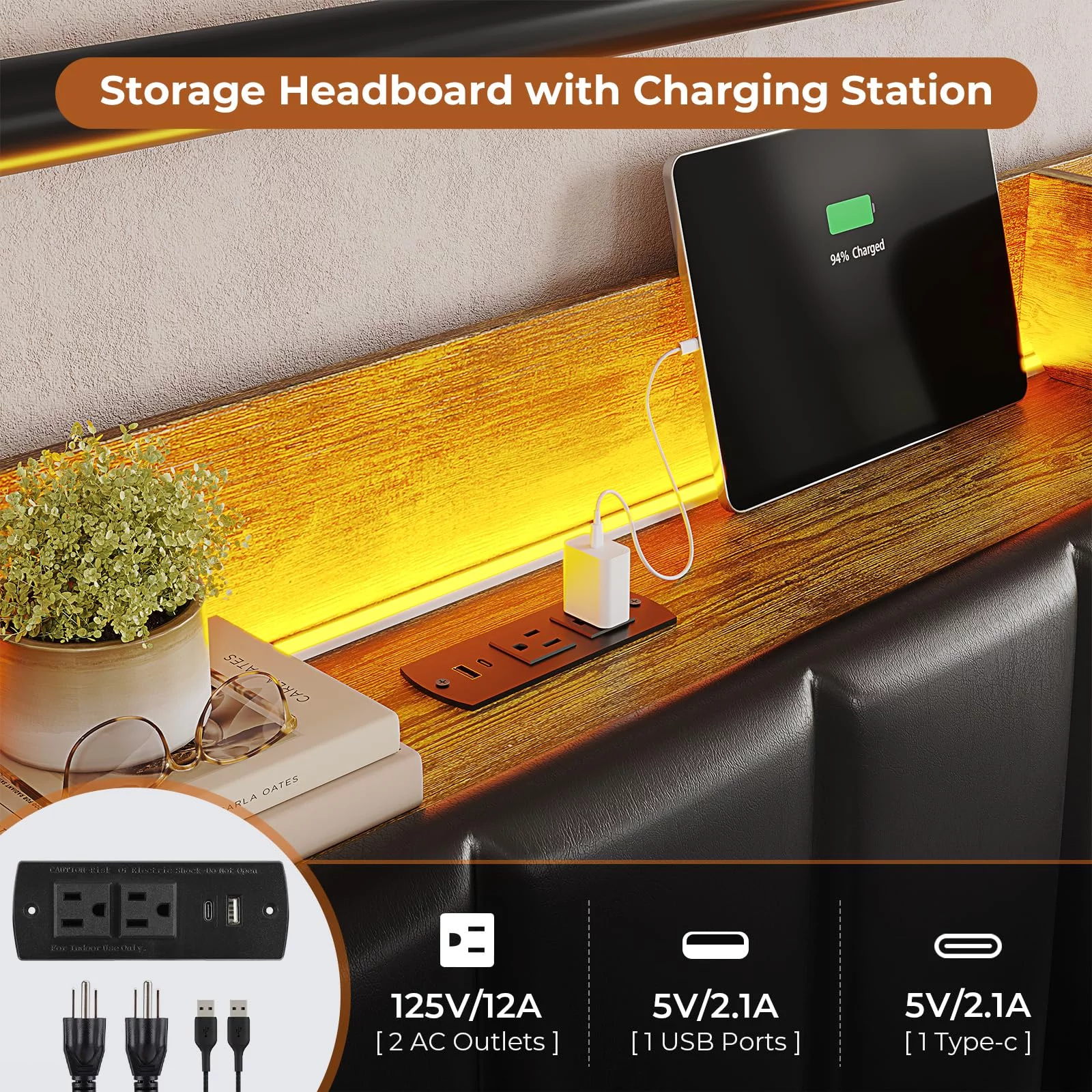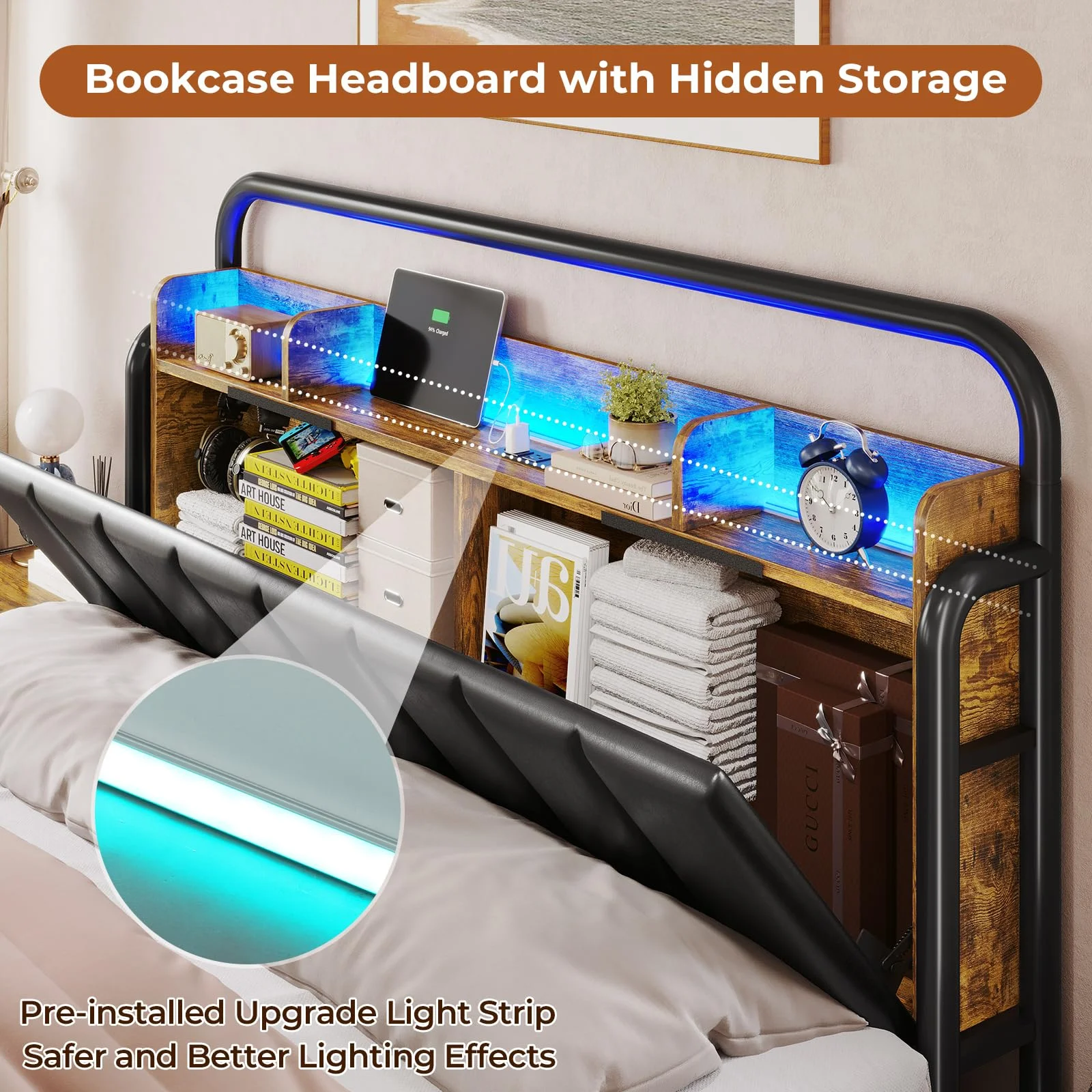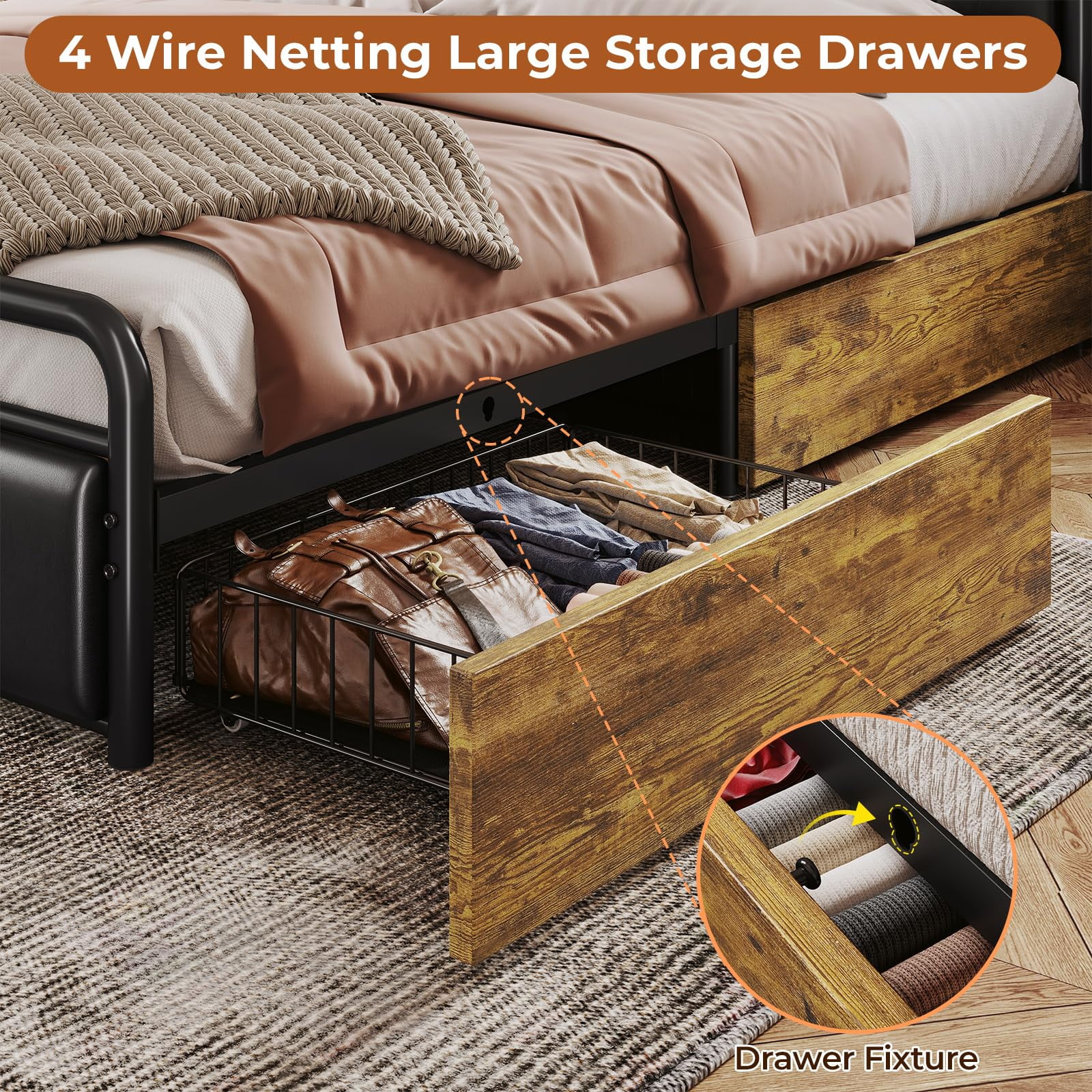 Queen Size Bed Frame with Storage Headboard & Hidden Storage Metal Platform LED Bed Frame with 4 Drawers & Charging Station,Upholstered Headboard,Noise-Free,Black - Curated Treasures Market