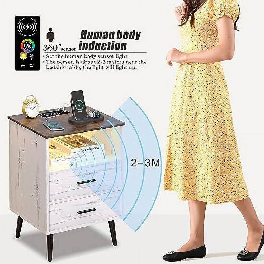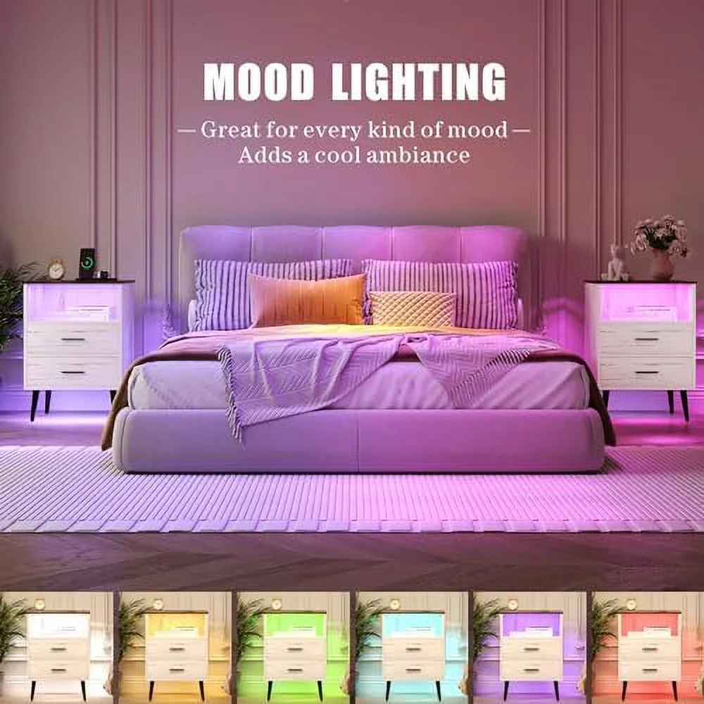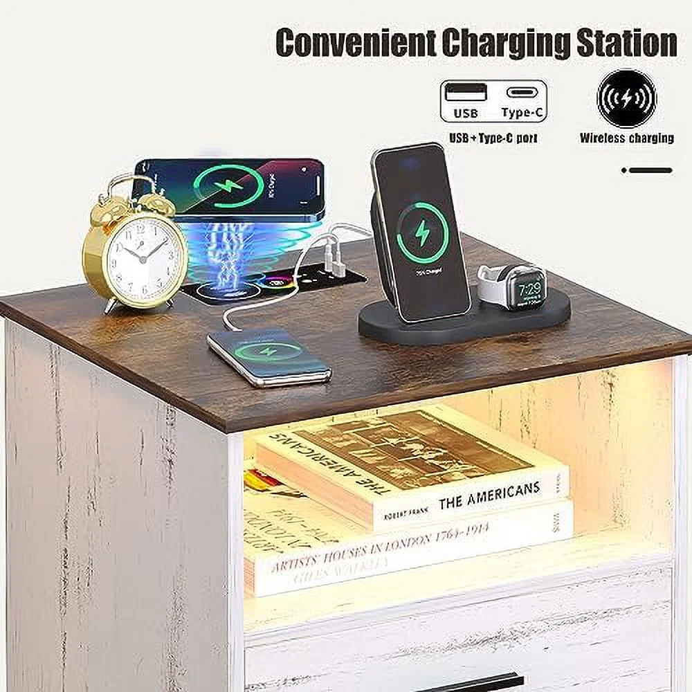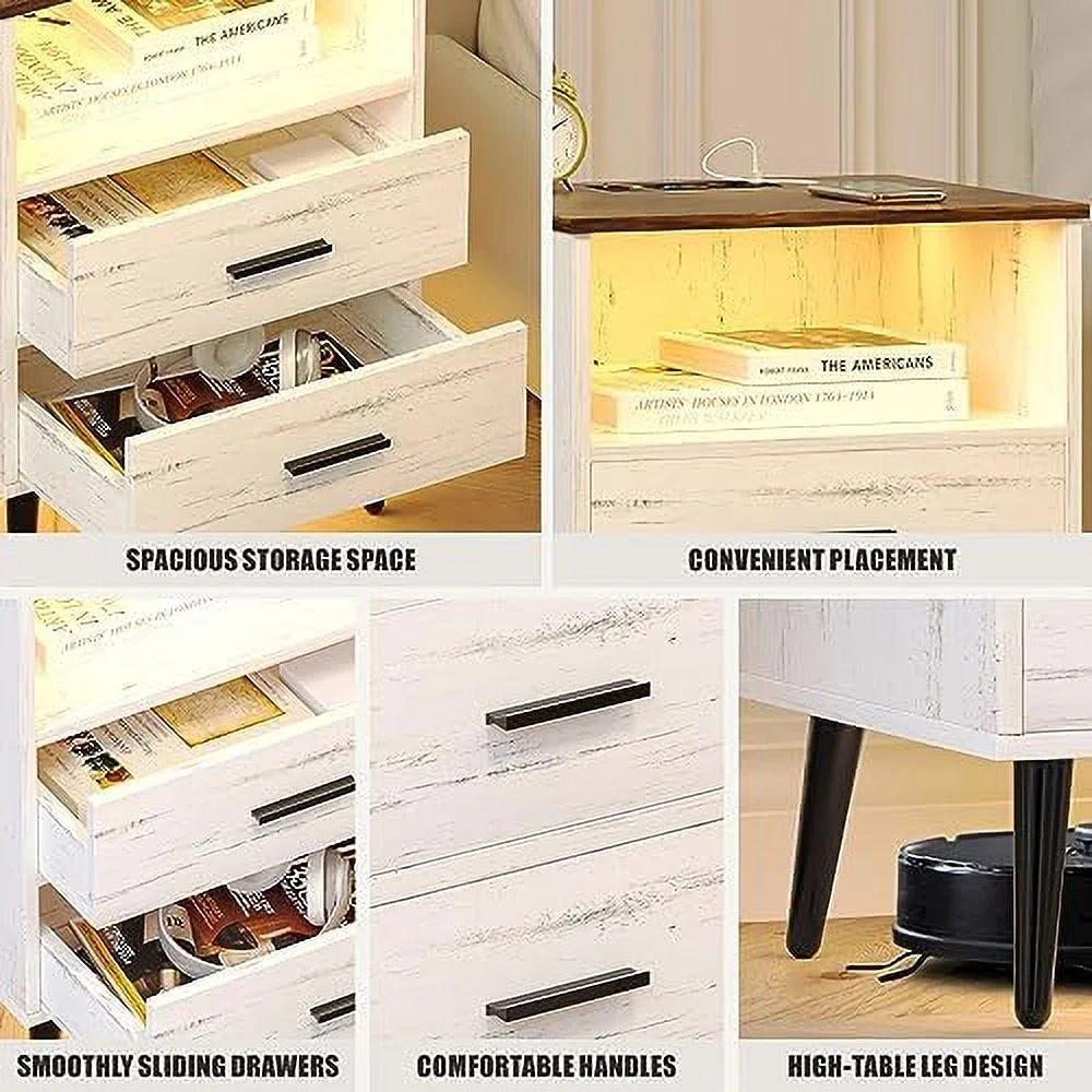 GEROBOOM Night Stand Set 2 with Charging Station Smart Nightstand with LED Light Wood Bedside Table with 2 Drawers and Modern End Table for Bedroom/Livingroom Black - Curated Treasures Market