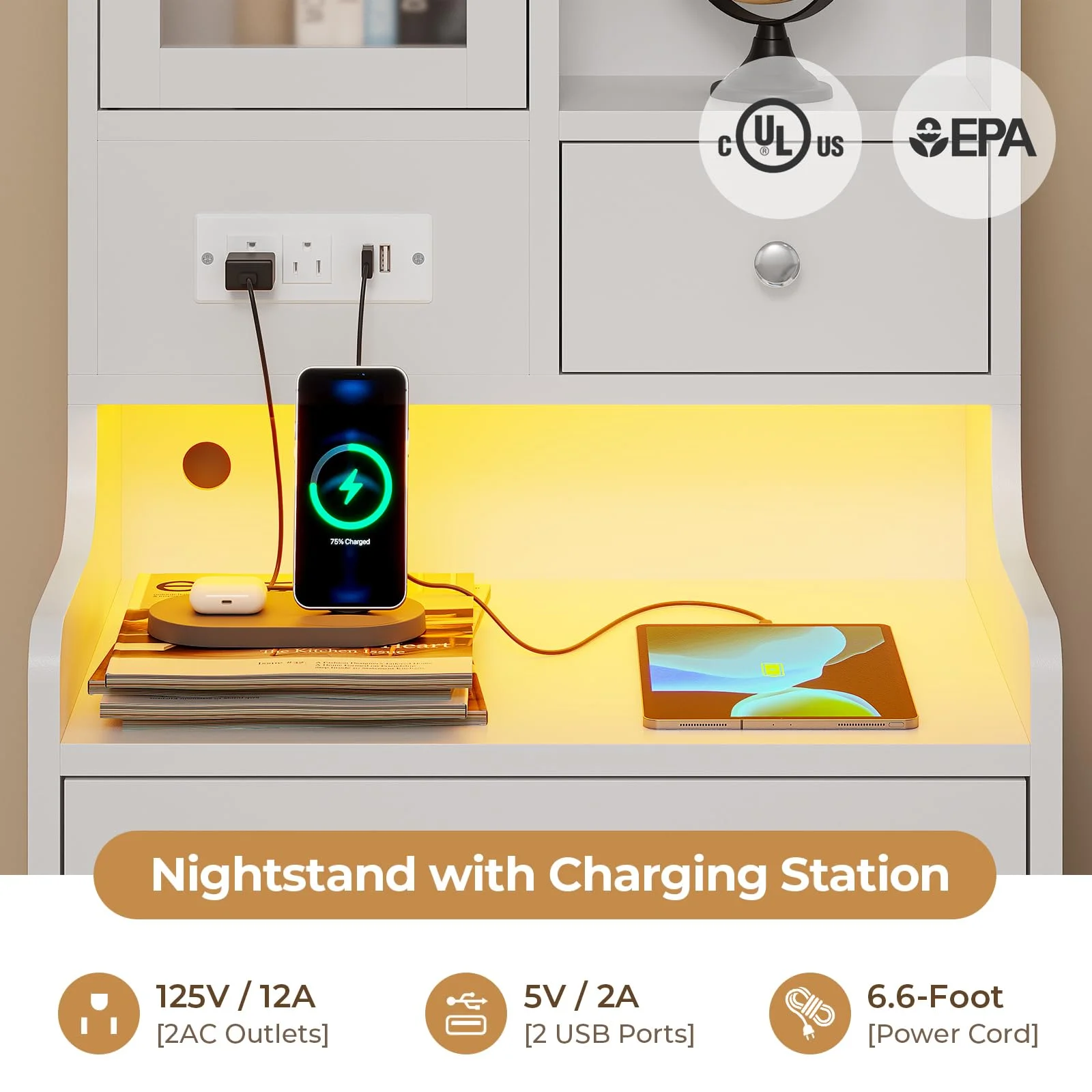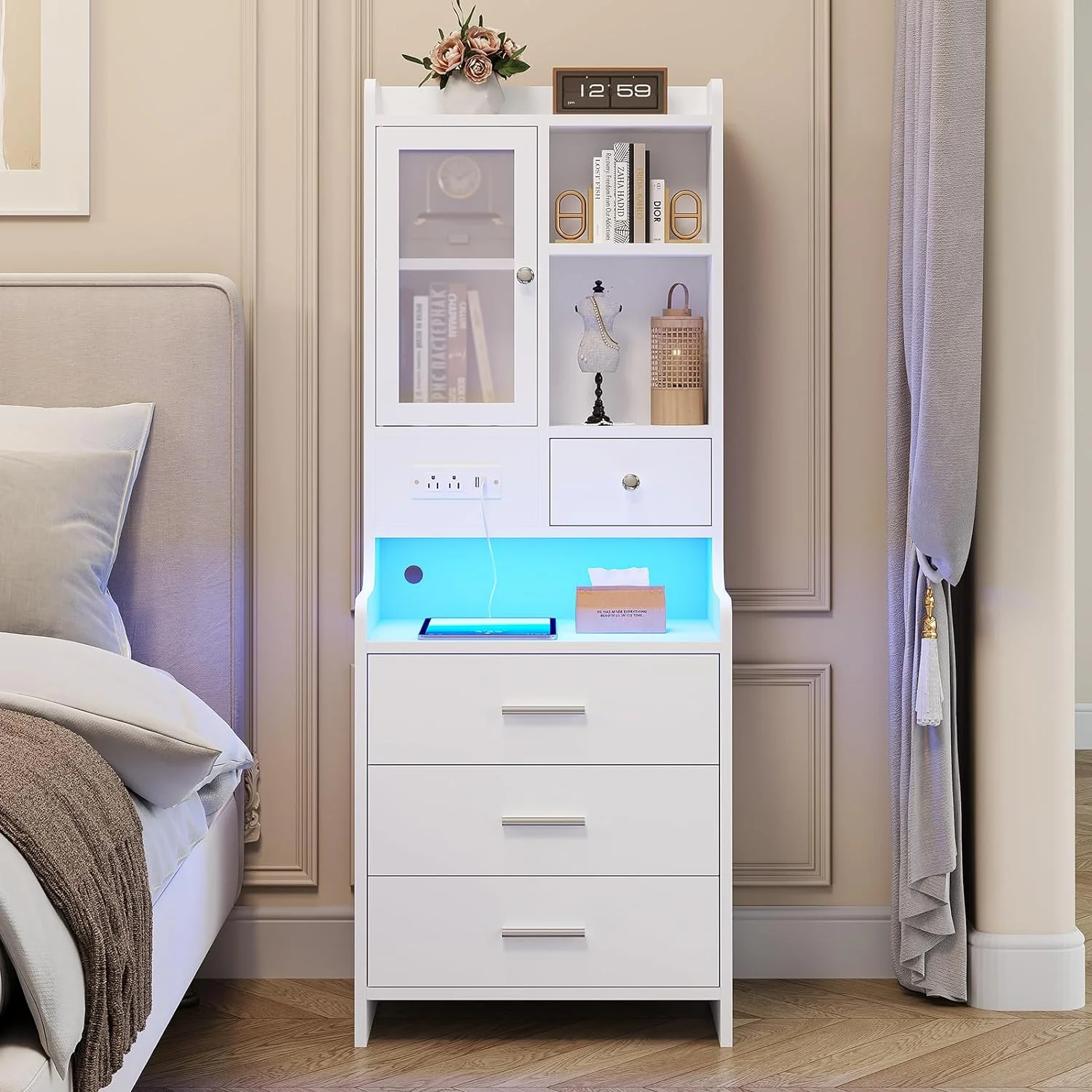 LED Nightstand Bedside Table with Charging Station and 3 Drawers, Modern End Side Table with LED Lights and Door for Bedroom, White - Curated Treasures Market