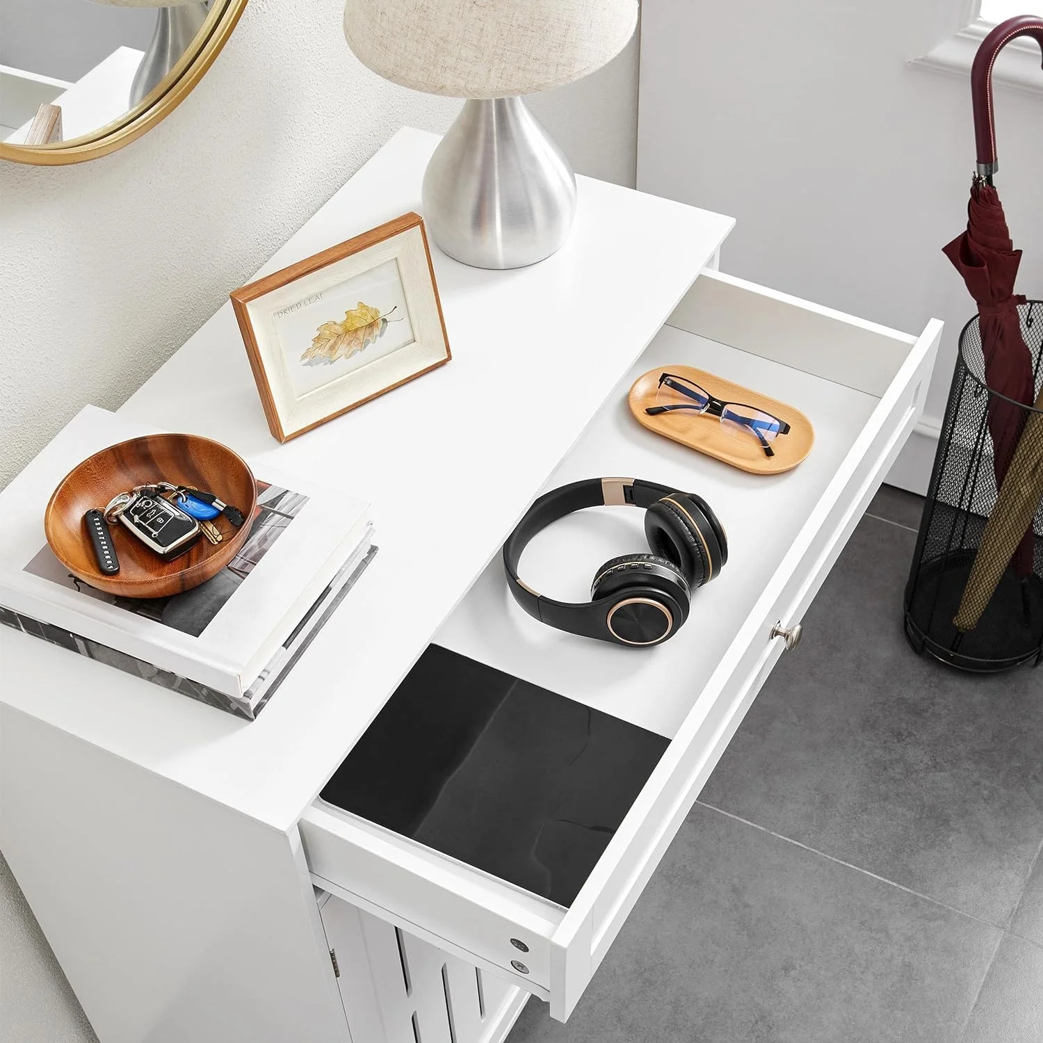 Rustic Storage Cabinet with Two Drawers and Four Classic Rattan Basket for Dining Room/Living Room (White Washed) - Curated Treasures Market