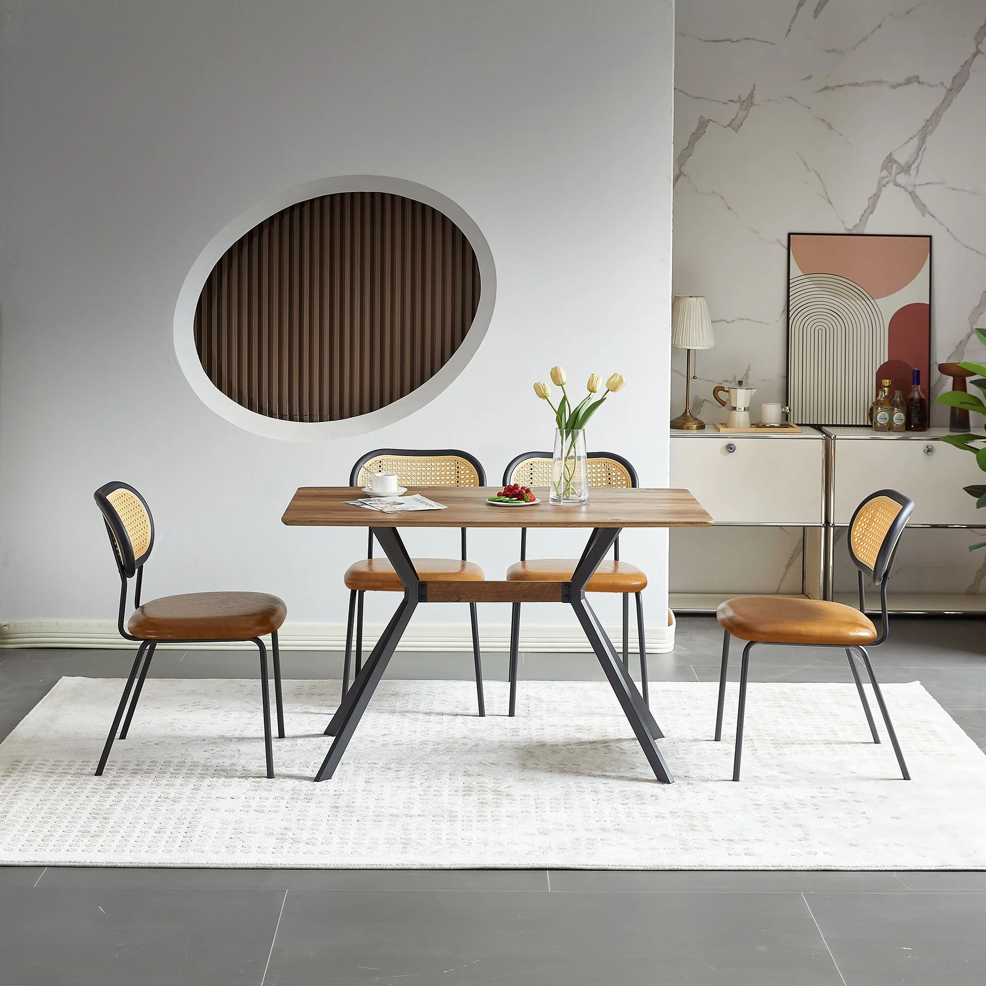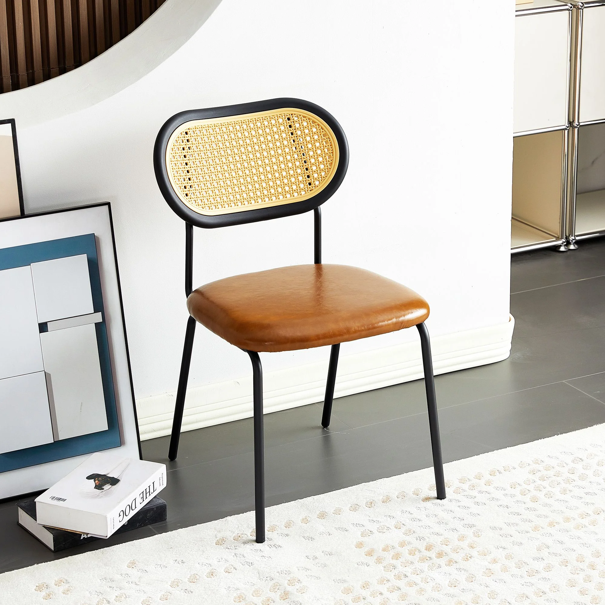 Upholstered Dining Chair with Black Metal Legs and Back, PU& Rattan Industrial Side Chair, Dining Room Furniture Chair, Accent Desk Chair for Kitchen Living Room Wine Bar(Brown,Set of 4) - Curated Treasures Market