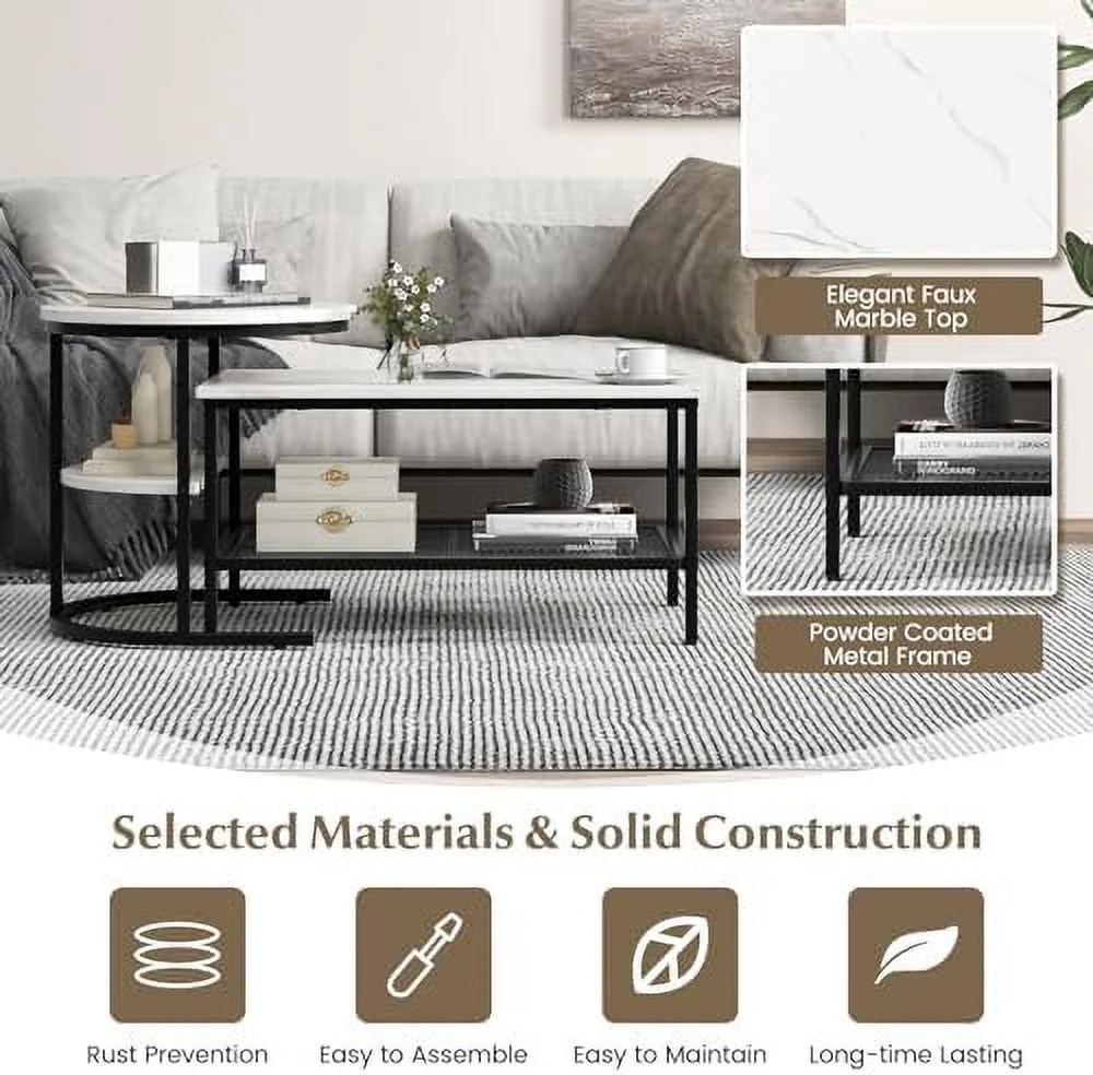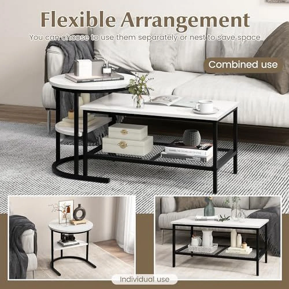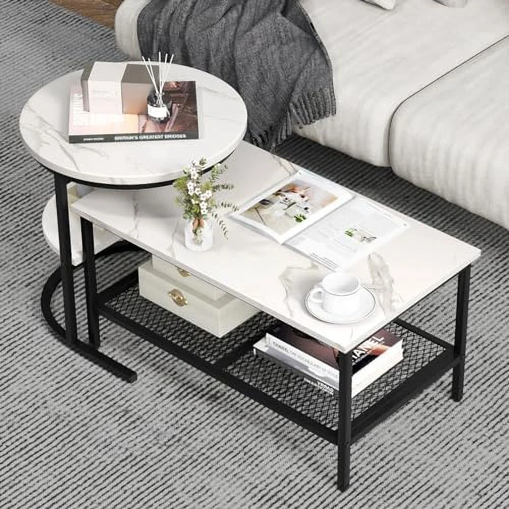 SQHJV Nesting Coffee Table 2 PCS Coffee Table Set with Faux Marble Top and Extra Modern Round End Table & Rectangular Coffee Table Set for Living Room Bedroom Black+White - Curated Treasures Market