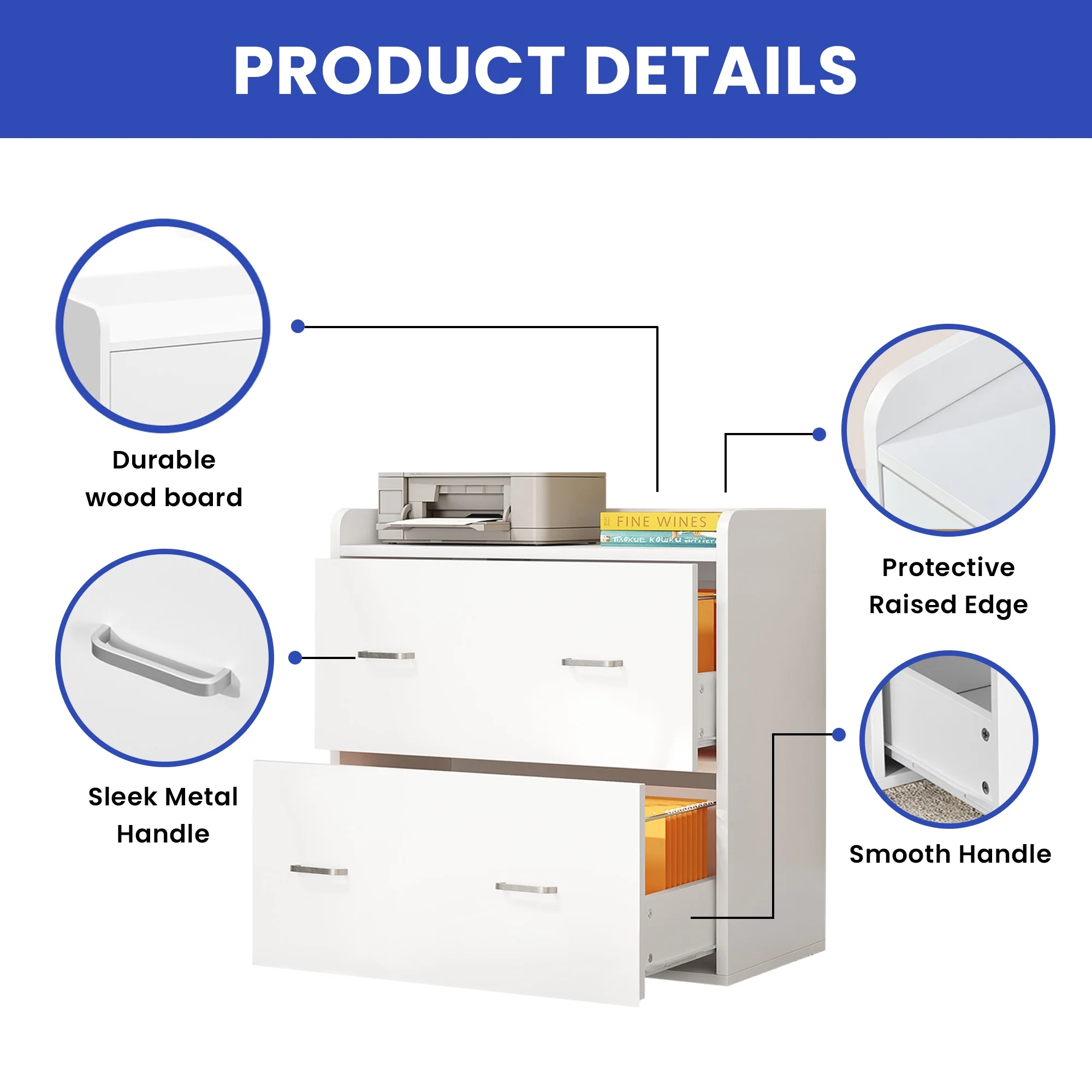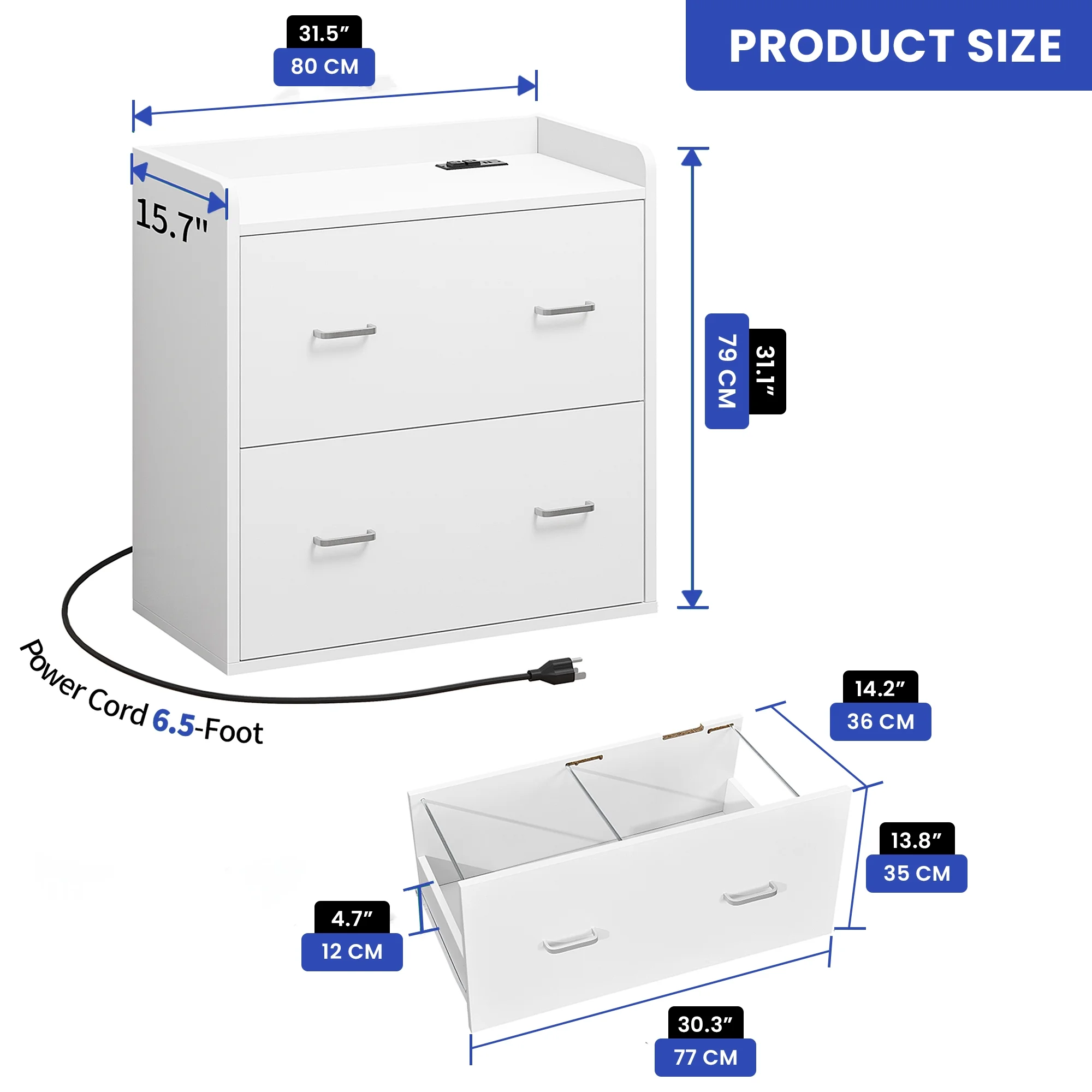 ModFusion 2-Drawer, 4-Metal Drawer Handle A4 Legal Letter Files Organizer Wood Cabinet with Charging Hub Station, White - Curated Treasures Market