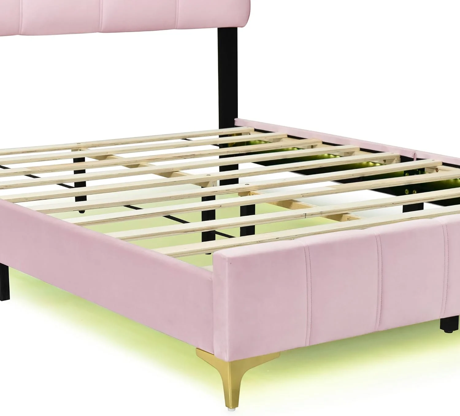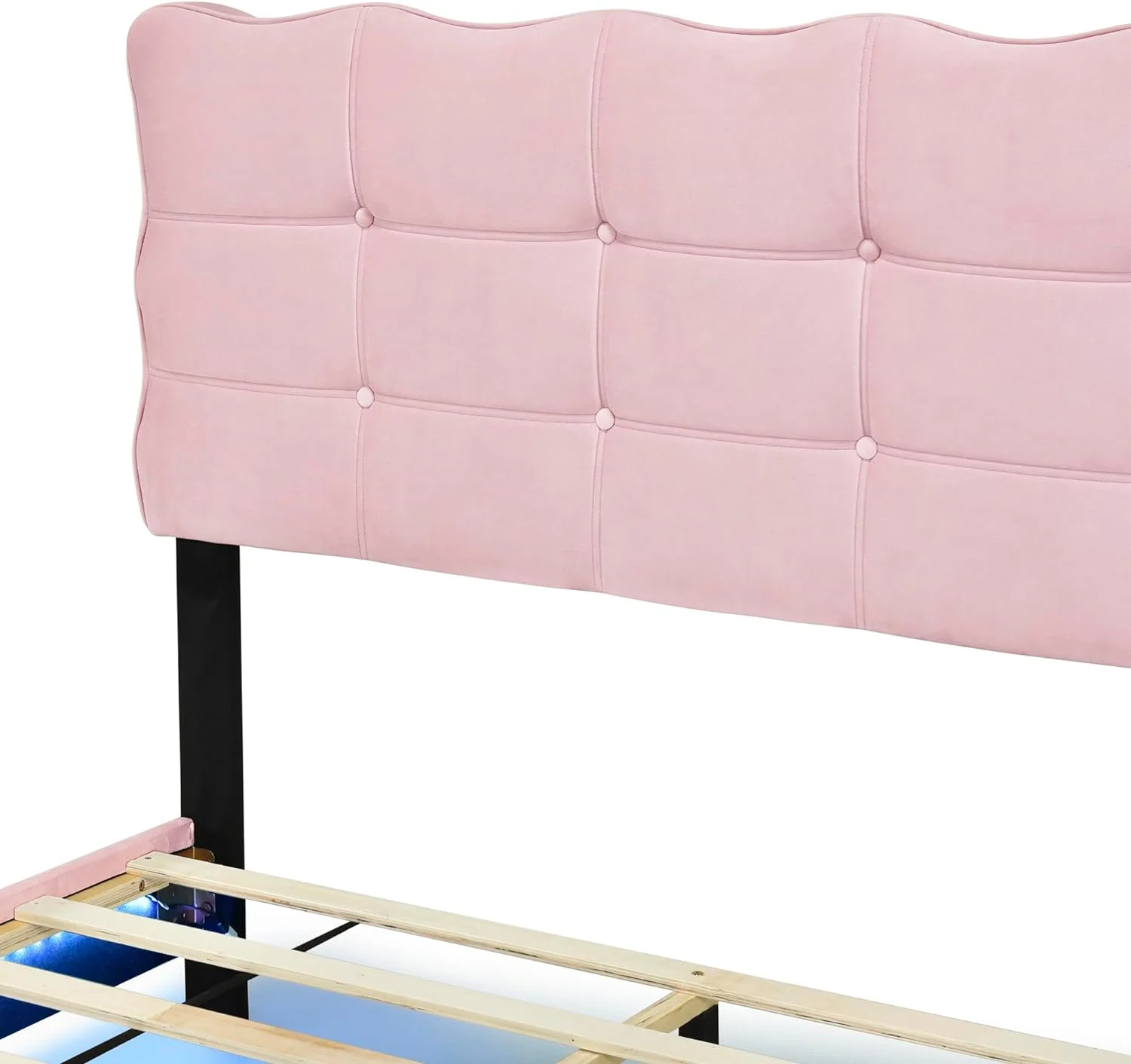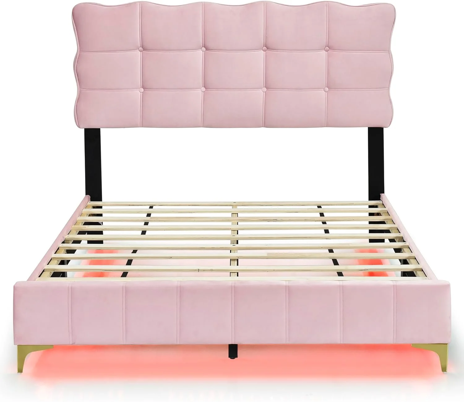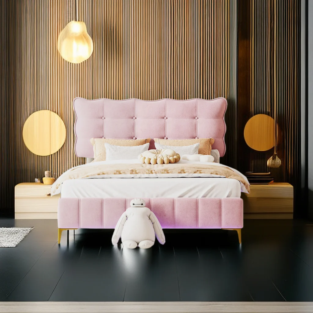 Full Size Velvet Upholstered Platform Bed with LED Frame and Stylish Mental Bed Legs with Cute Marshmallow Headboard No Box Spring Needed, No Noise, for Girls,Boys,Kids,Teens, Adults - Curated Treasures Market