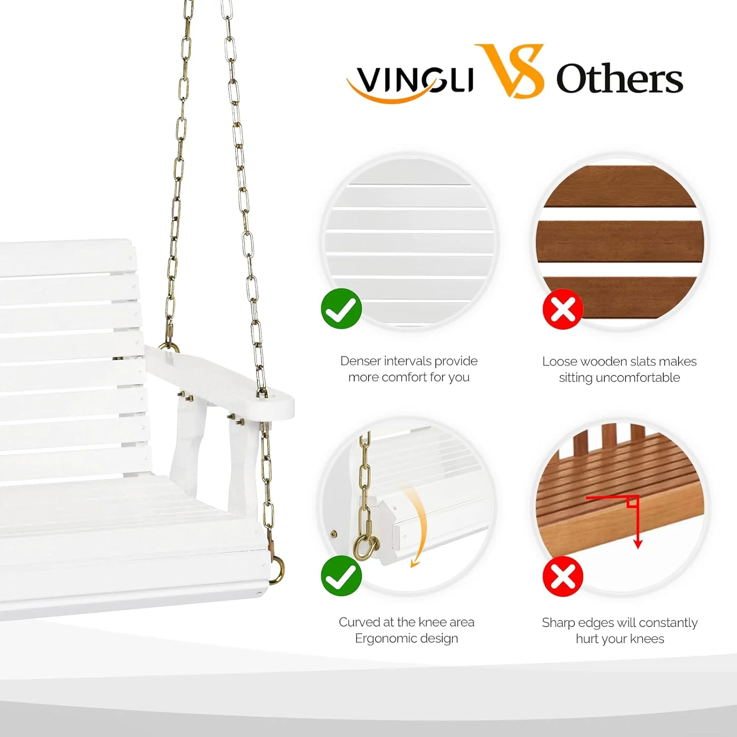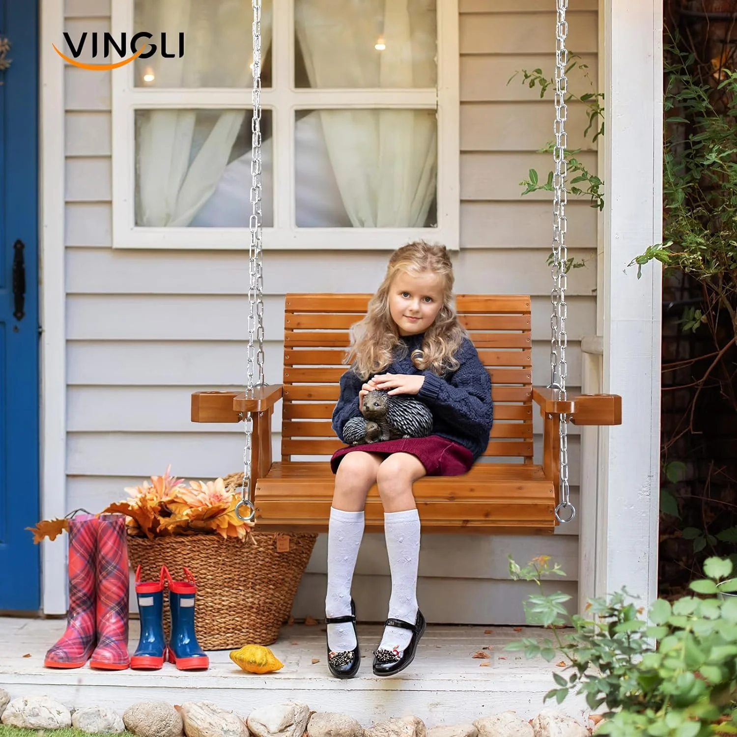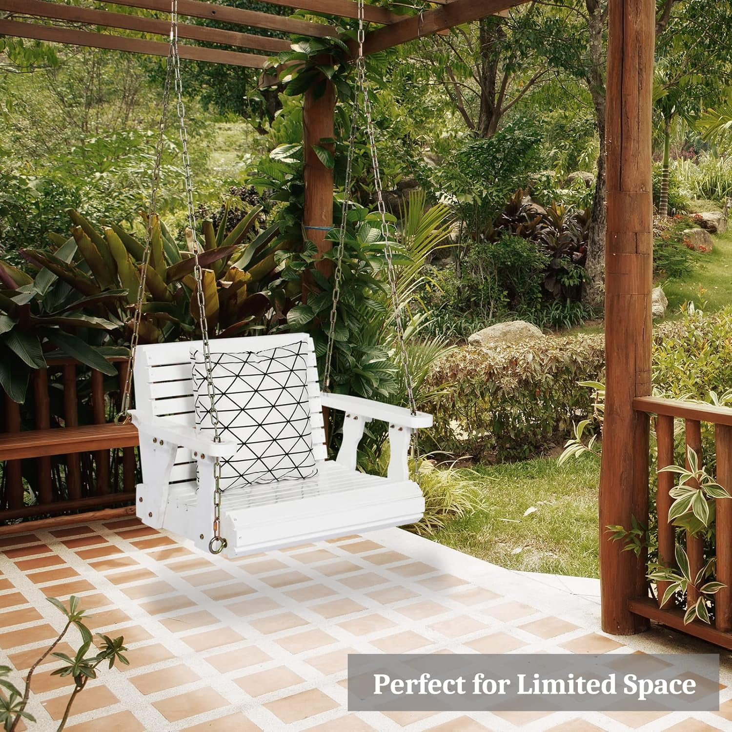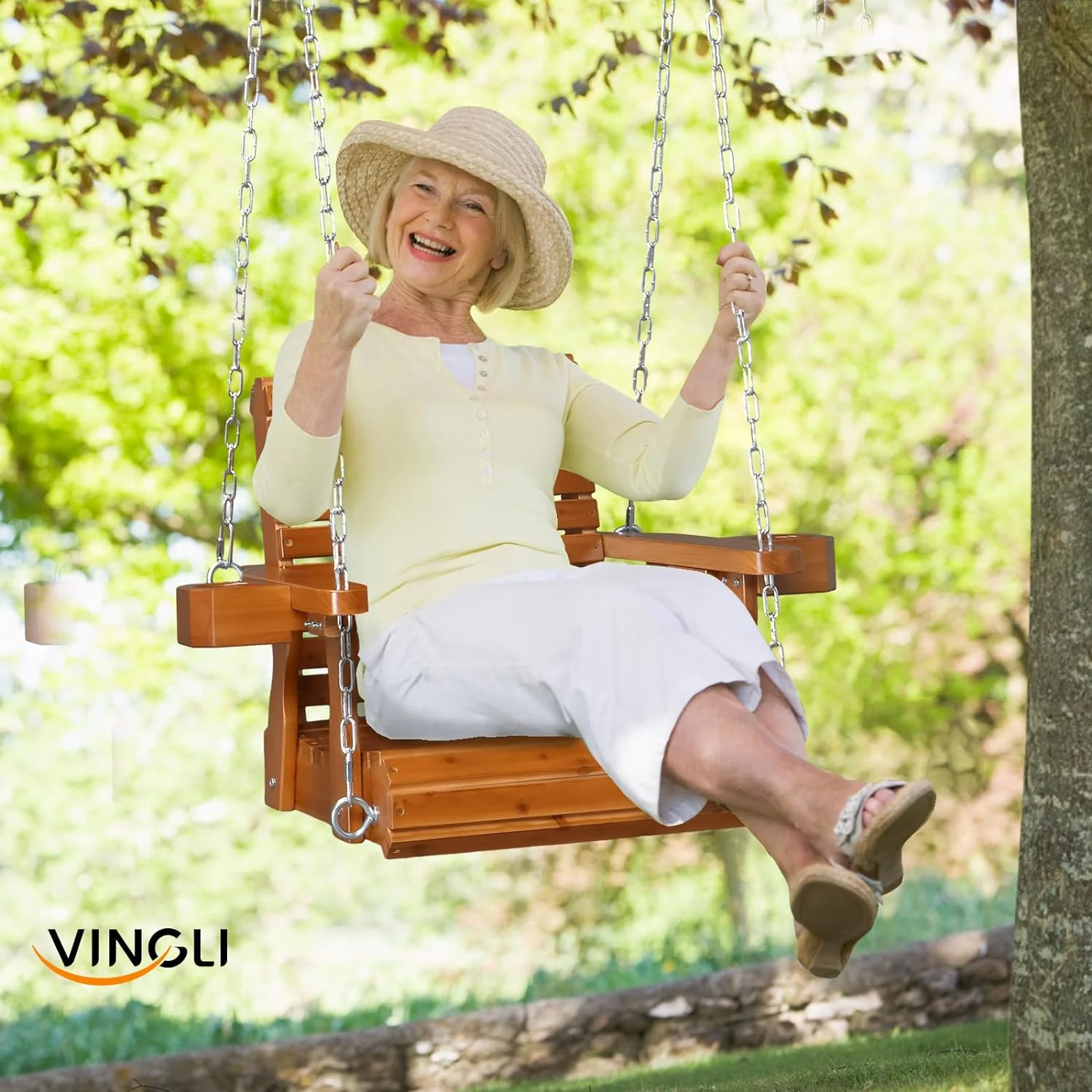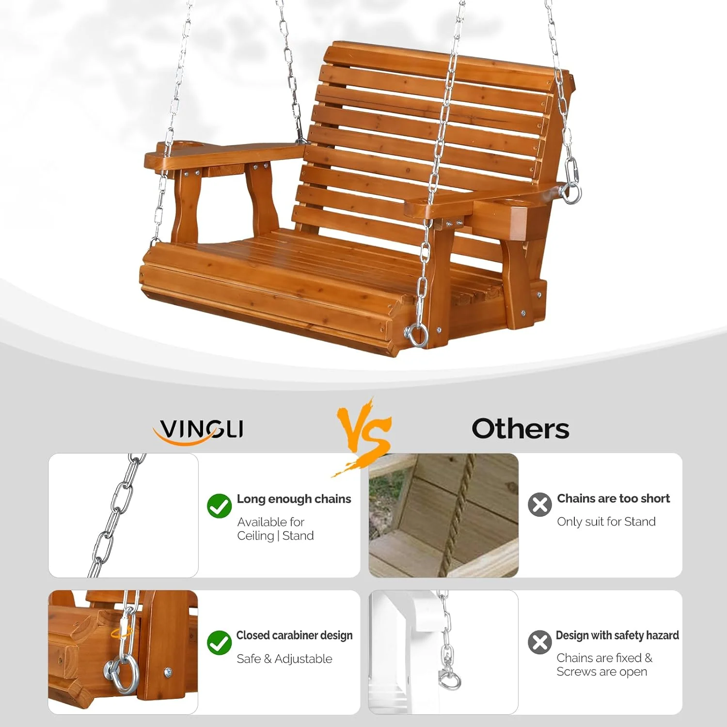 VINGLI Heavy Duty 440 LBS 1-Person Wooden Patio Porch Swing with Deeper Seat & Higher Backrest & Extra Cup Holder for Adults & Kids, Outdoor Single Porch Swing for Porch, Yard, Balcony, Tree (Brown) - Curated Treasures Market