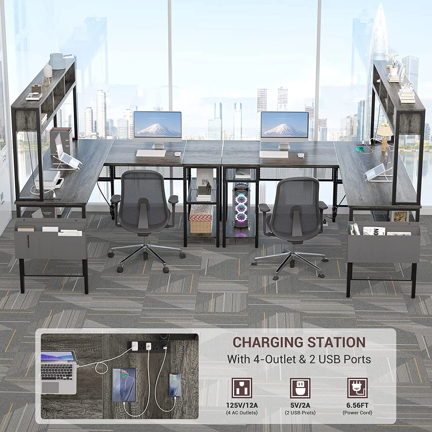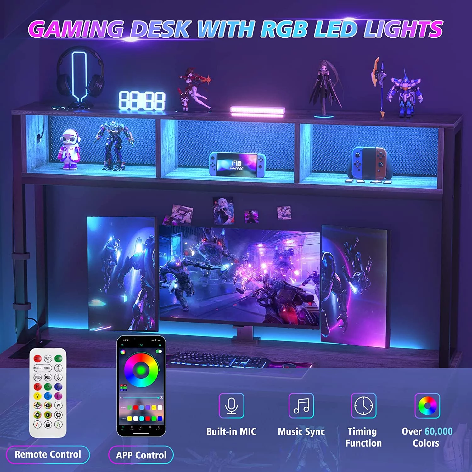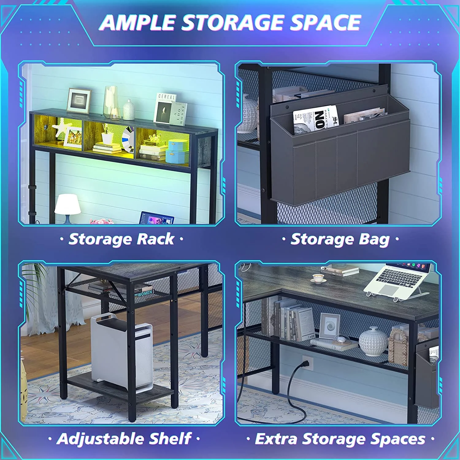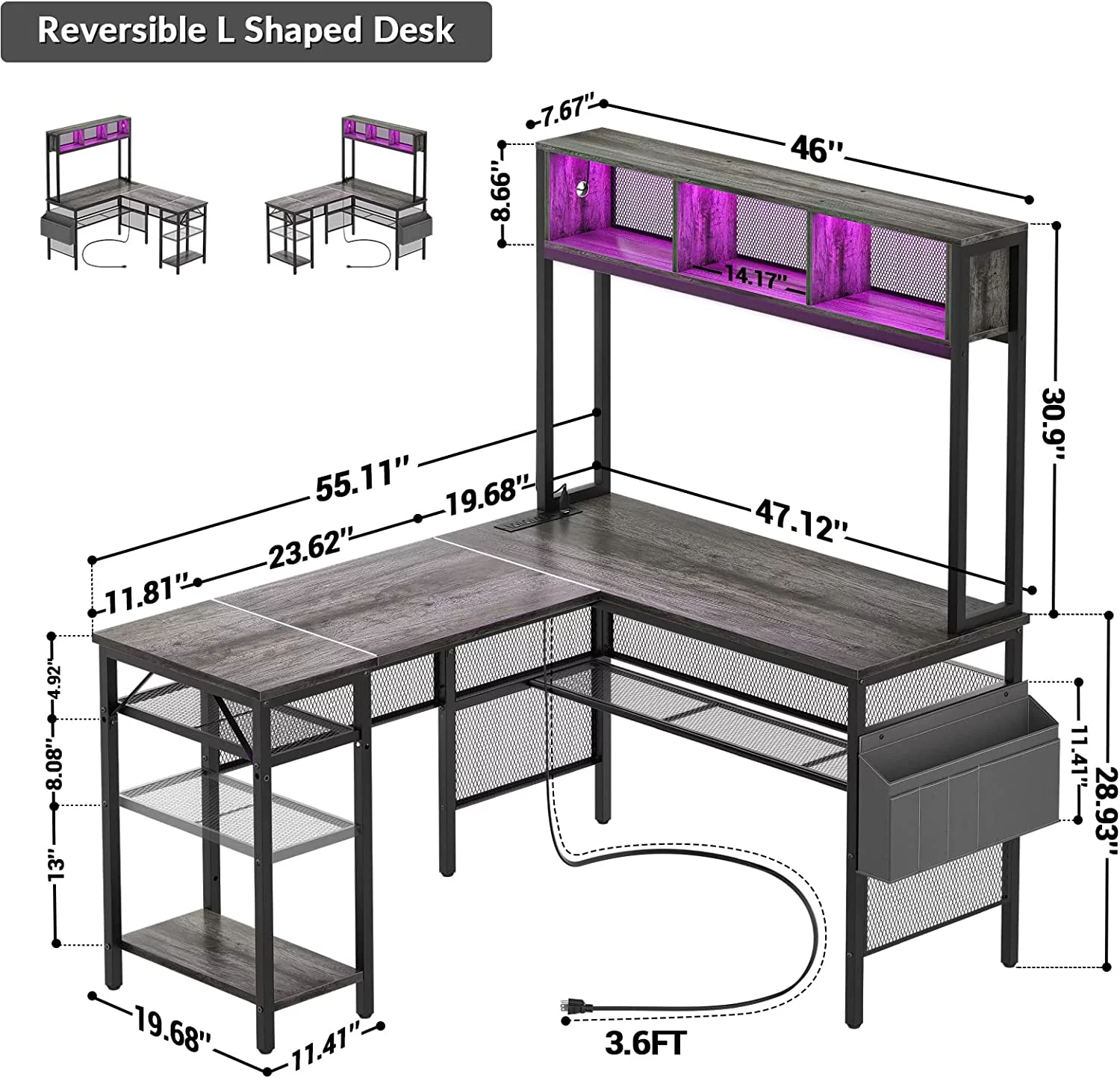 Homieasy L Shaped Desk with Power Outlets and USB Ports, 55'' Reversible L-Shaped Gaming Desk with LED Strip and Storage Shelves, Industrial Corner Computer Desk with Hutch for Home Office, Black Oak - Curated Treasures Market
