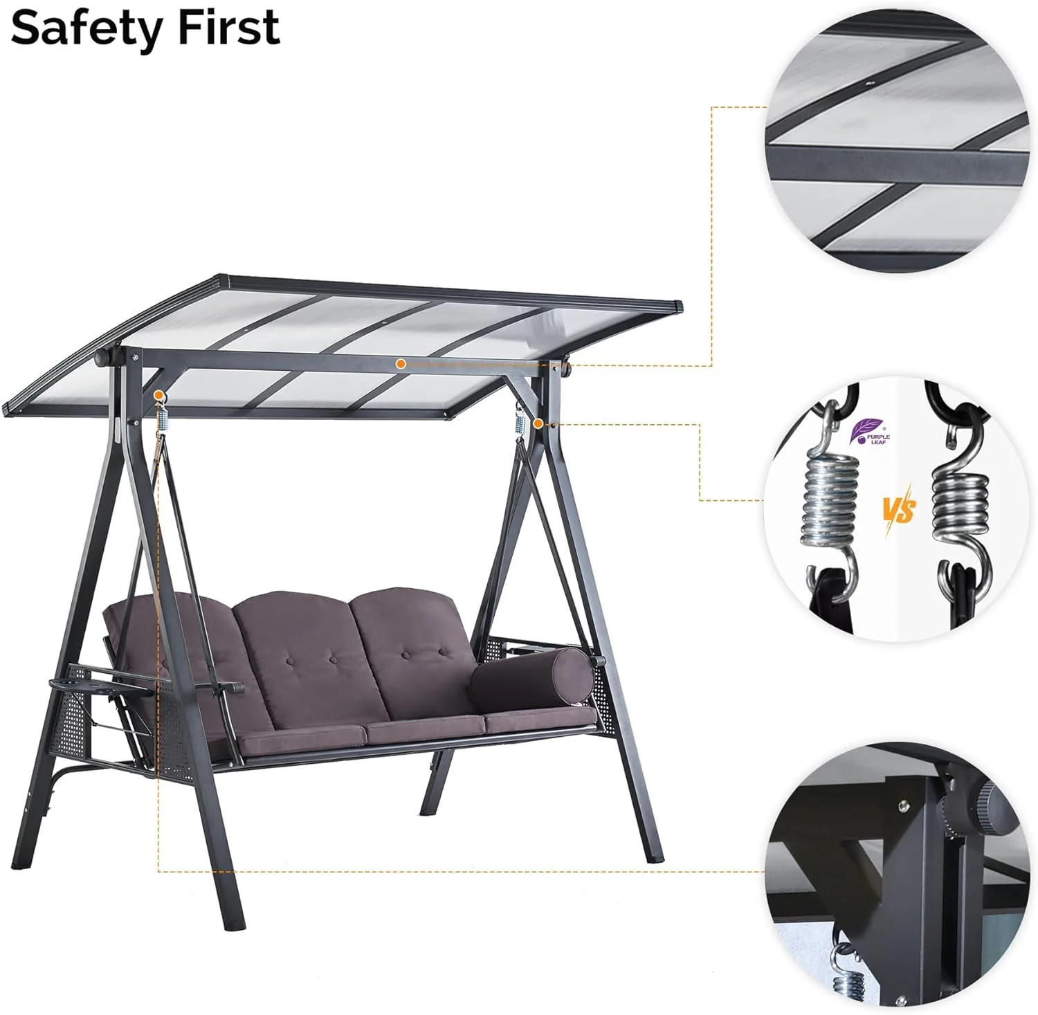 PURPLE LEAF Outdoor Patio Porch Swing with Adjustable PVC Canopy, 3-Seat Swing Chair Bench with Side Cup Holder for Backyard Front Porch Lawn, Cushions and Pillow Included, Grey - Curated Treasures Market