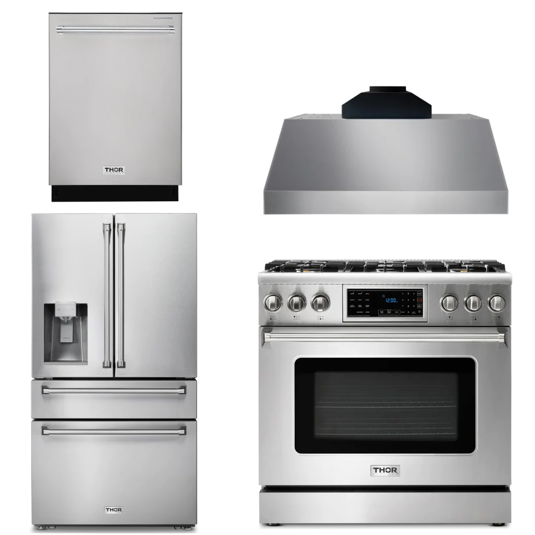 Thor Kitchen Package - 36 Propane Gas Range, Range Hood, Refrigerator with Water and Ice Dispenser, Dishwasher, AP-TRG3601LP-C-7