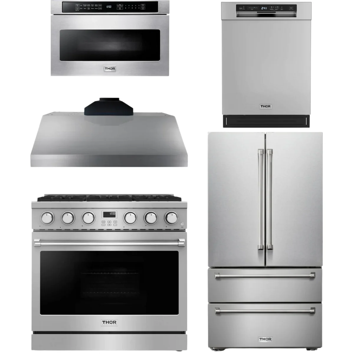 Thor Contemporary Package - 36 Gas Range, Range Hood, Refrigerator, Dishwasher and Microwave, Thor-AP-ARG36-A91