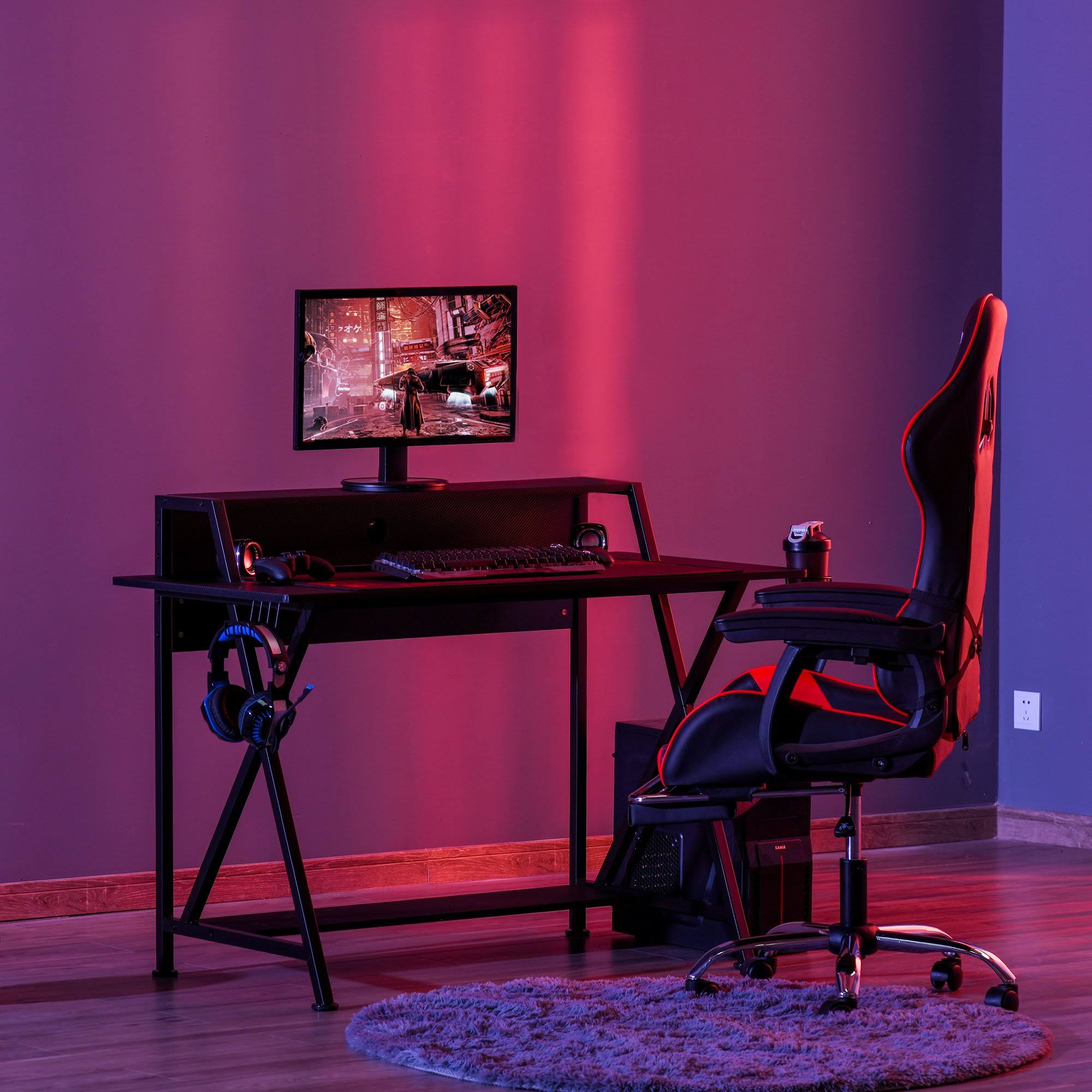 HOMCOM Racing Gaming Desk Carbon Fiber Style Computer Table with Elevated Monitor Shelf, and Cup Holder, Black - Megean