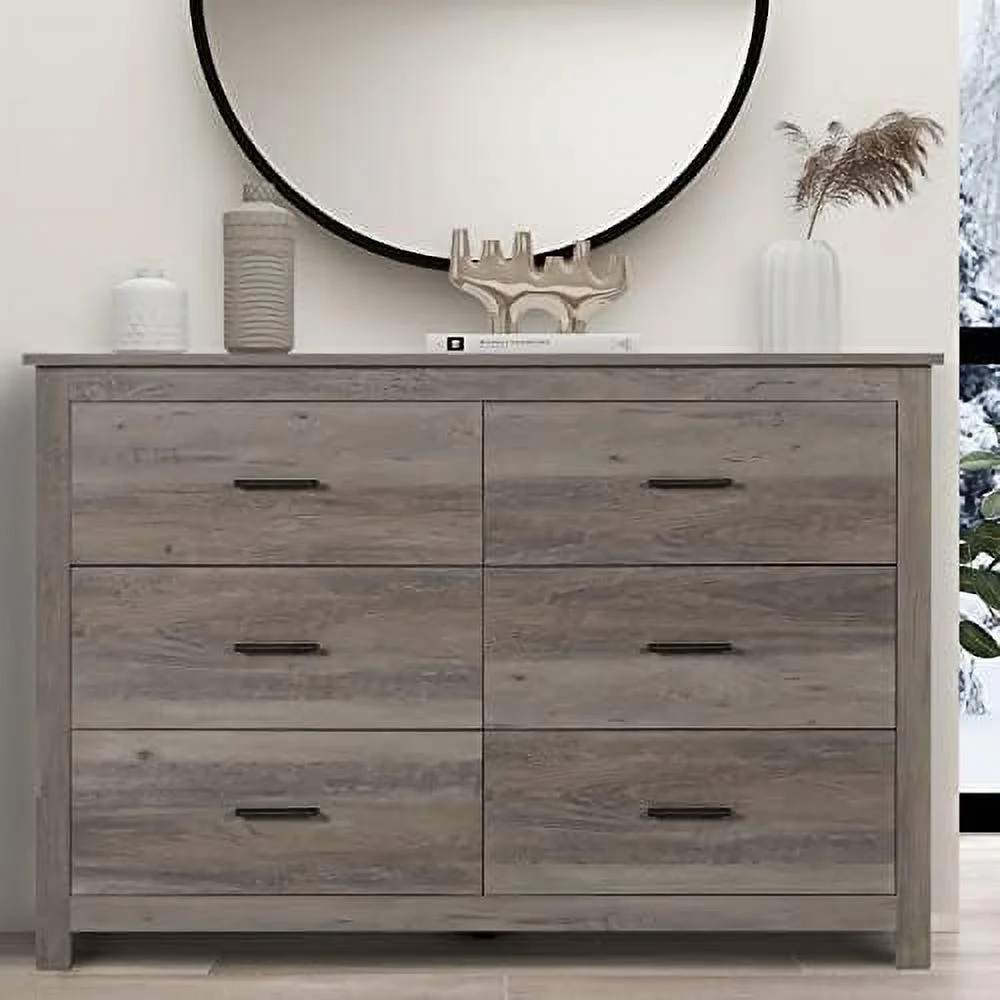 6 Drawer Dresser - Farmhouse Dressers for Bedroom Wooden Double Dresser Dressers Organizer for Bedroom Nursery Living Room Hallway Entryway Horizontal Dresser Grey