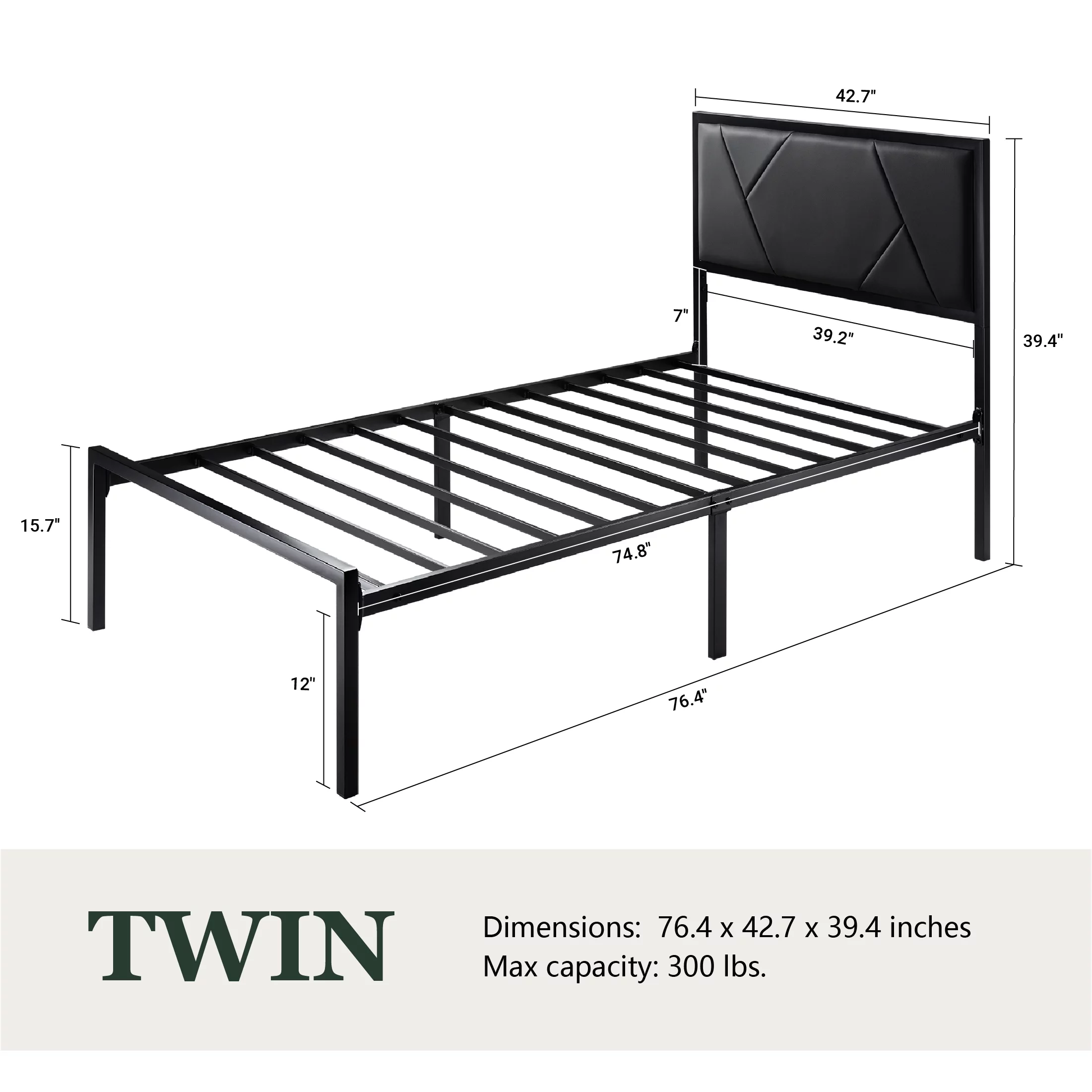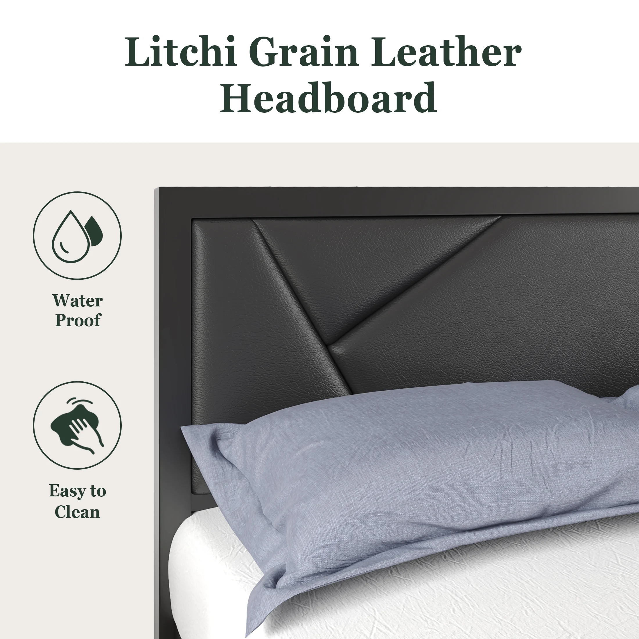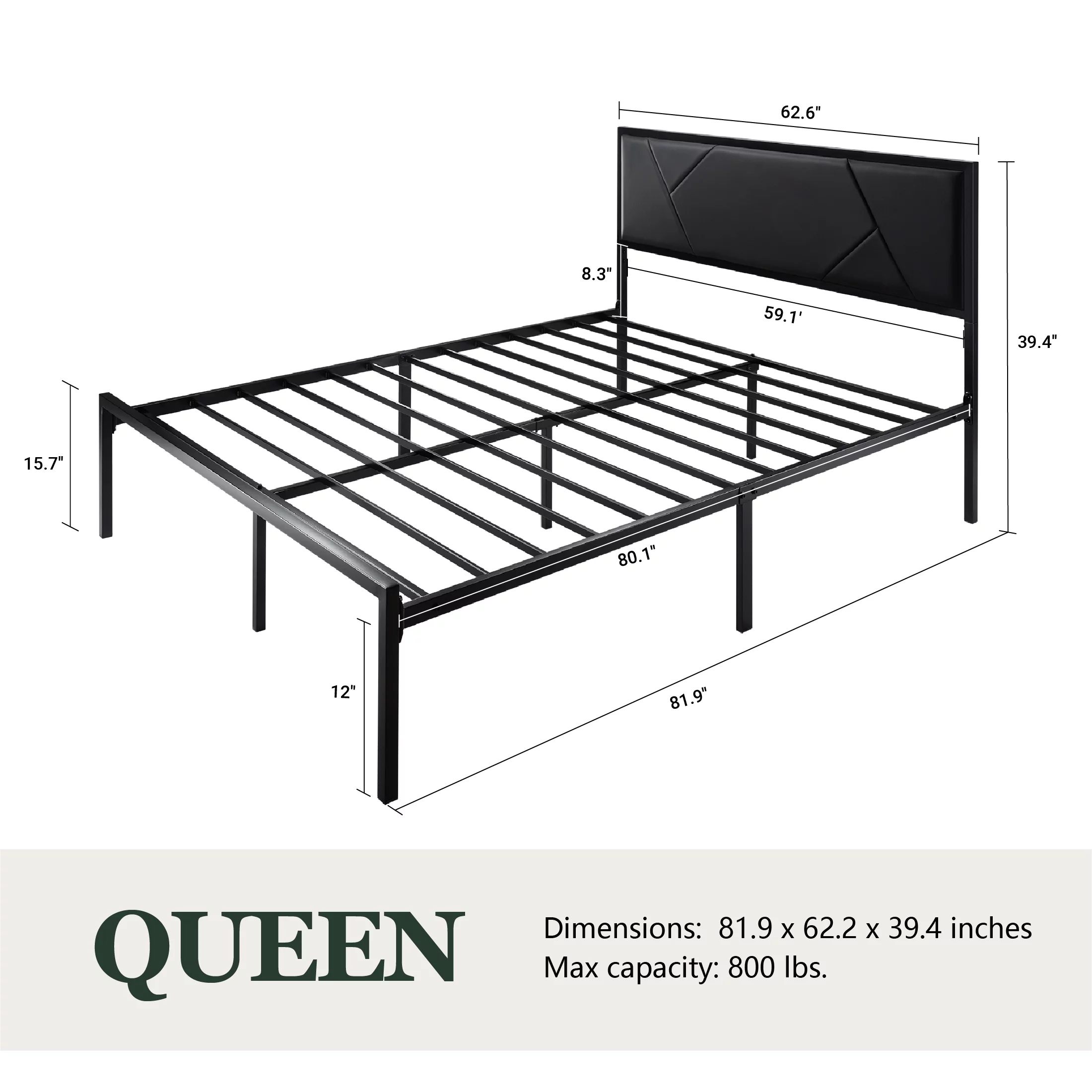 Amolife Queen Size Metal Bed Frame with Litchi Grain Faux Leather Geometric Upholstered Headboard, Black