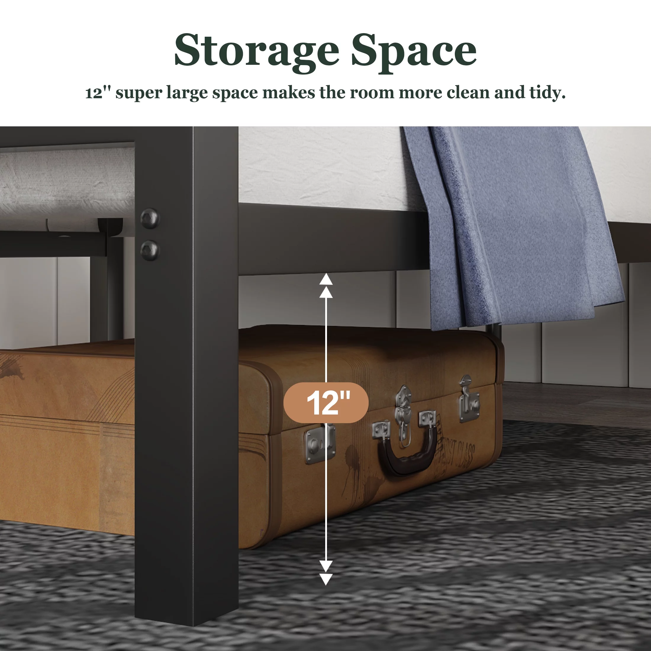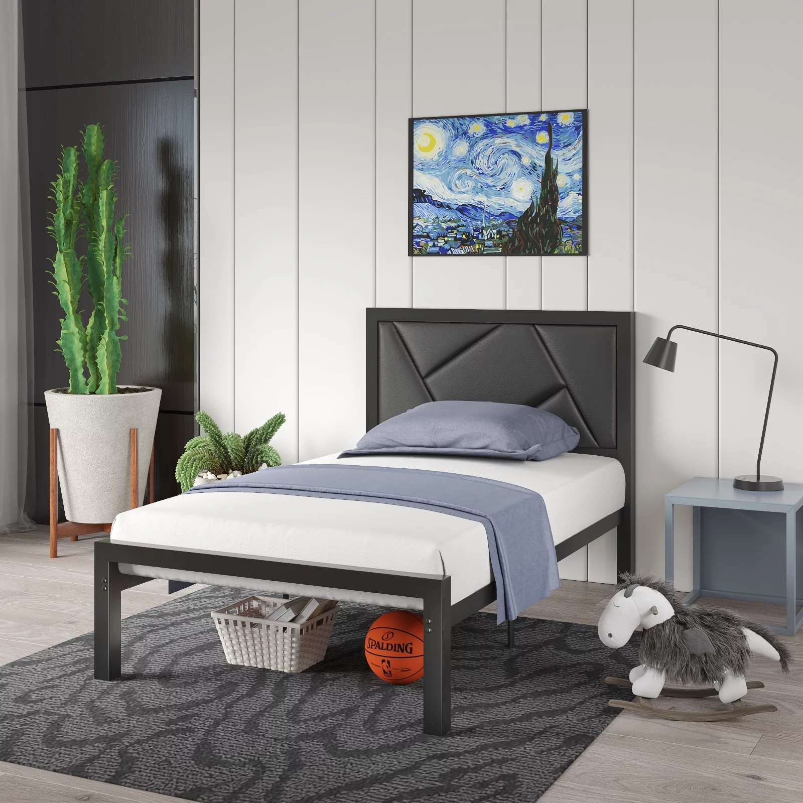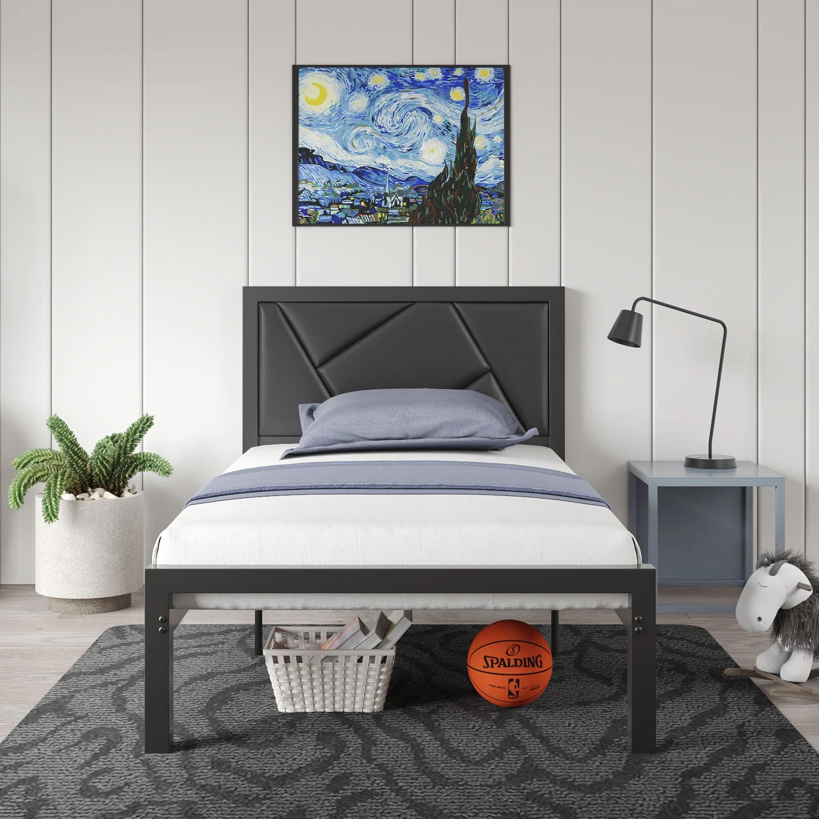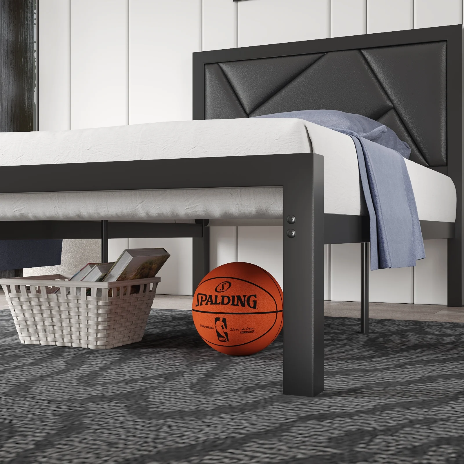 Amolife Queen Size Metal Bed Frame with Litchi Grain Faux Leather Geometric Upholstered Headboard, Black