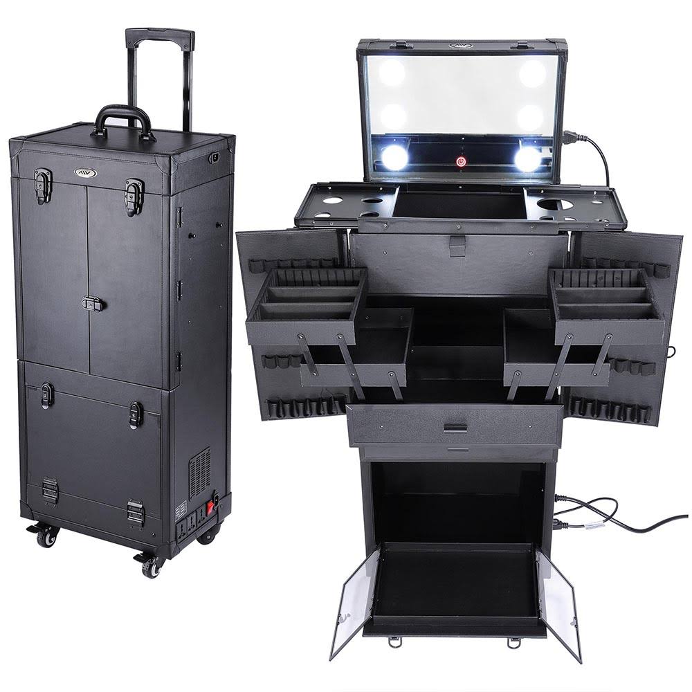 AW Black Rolling Makeup Case Pro Hair Stylist Barber Artists Case Multifunction Lighted Lockable - Megean