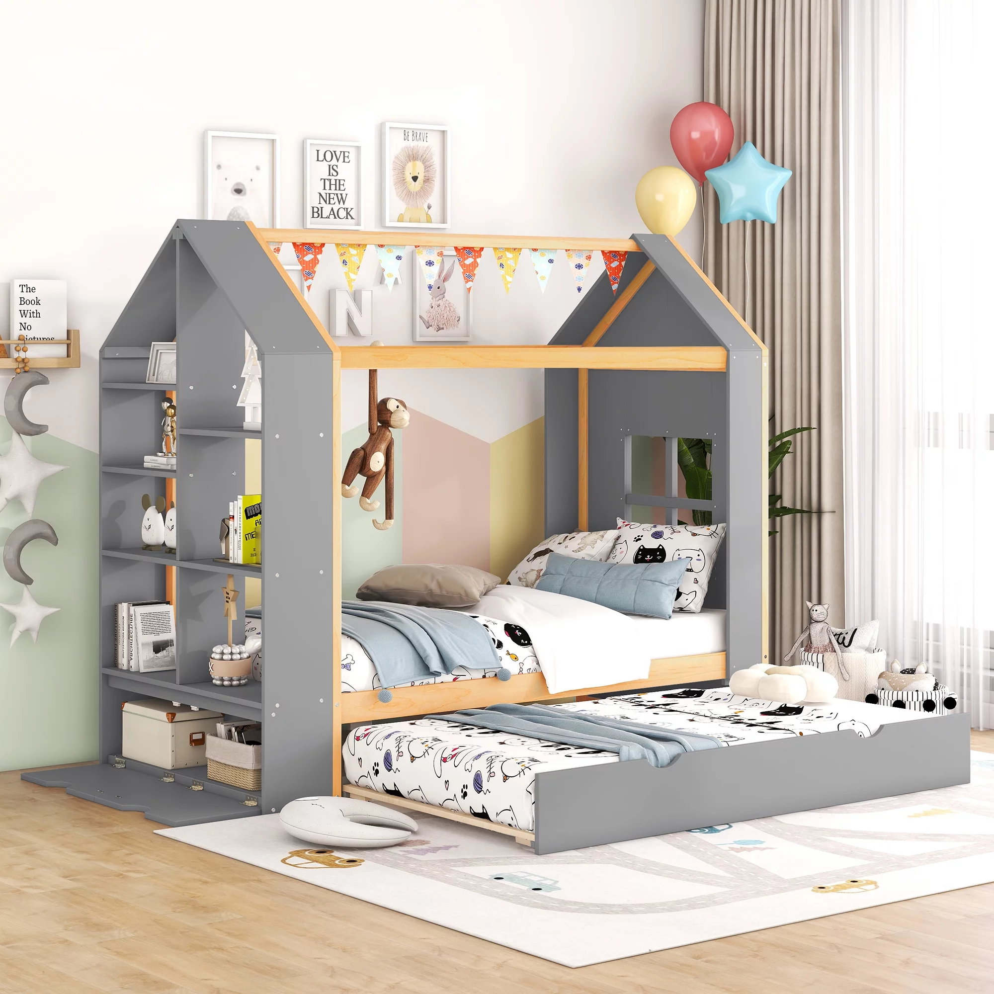 Euroco Wood Twin Size House Bed with Trundle. Display Cabinet for Kids Bedroom. House-Shaped Woof and Window. Gray