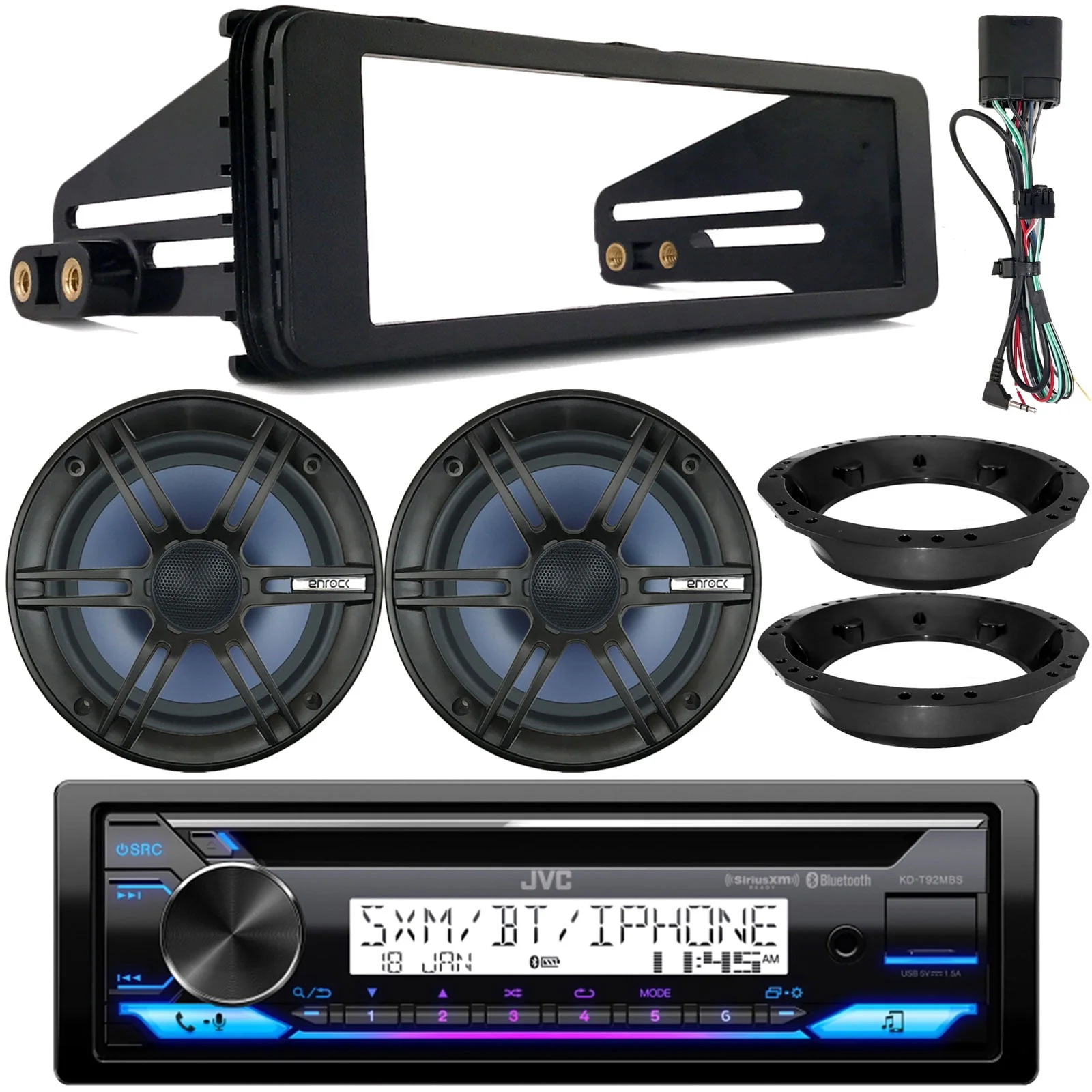 JVC KD-T92MBS Single DIN Marine Bluetooth USB AUX AM/FM CD Receiver, 2x 6.5 120W Marine Speakers, Stereo Install Kit, Speaker Adapters (Fits Select 1998-2013 Harley Davidson Touring Motorcycles)